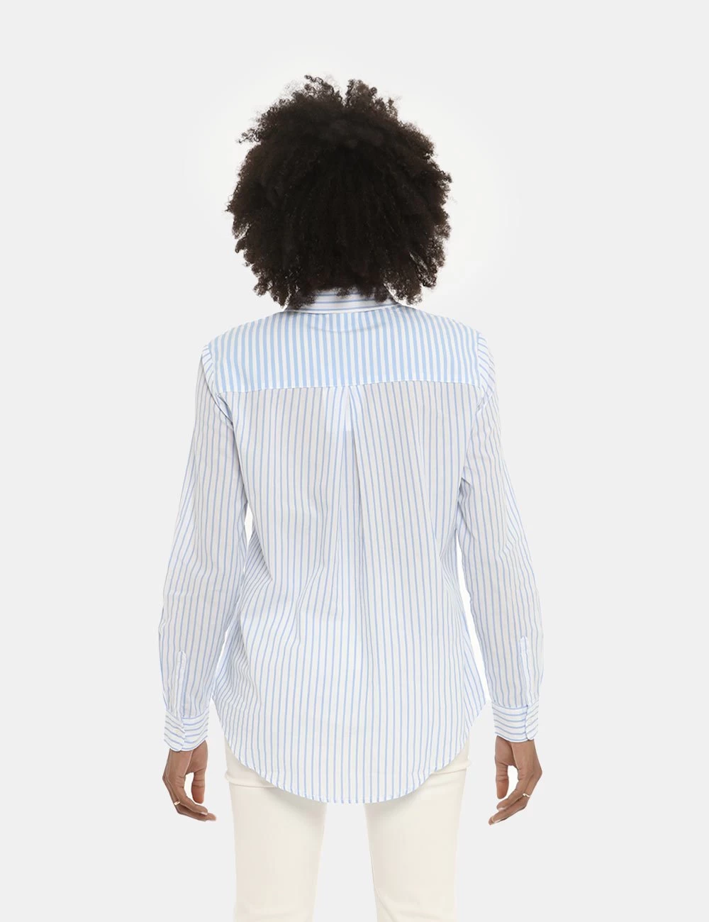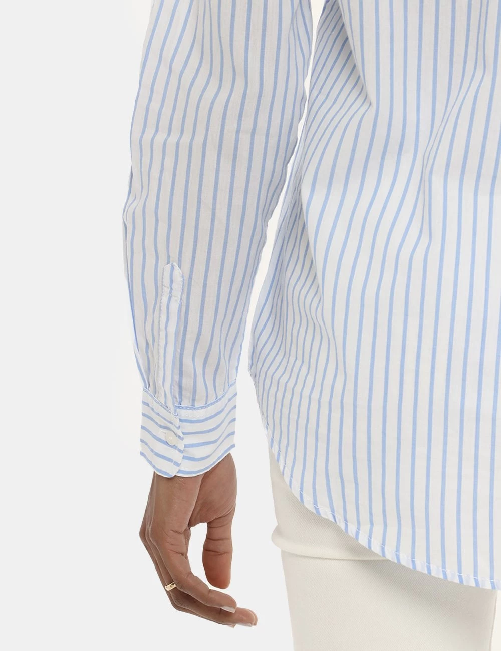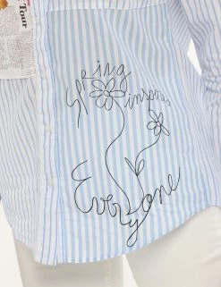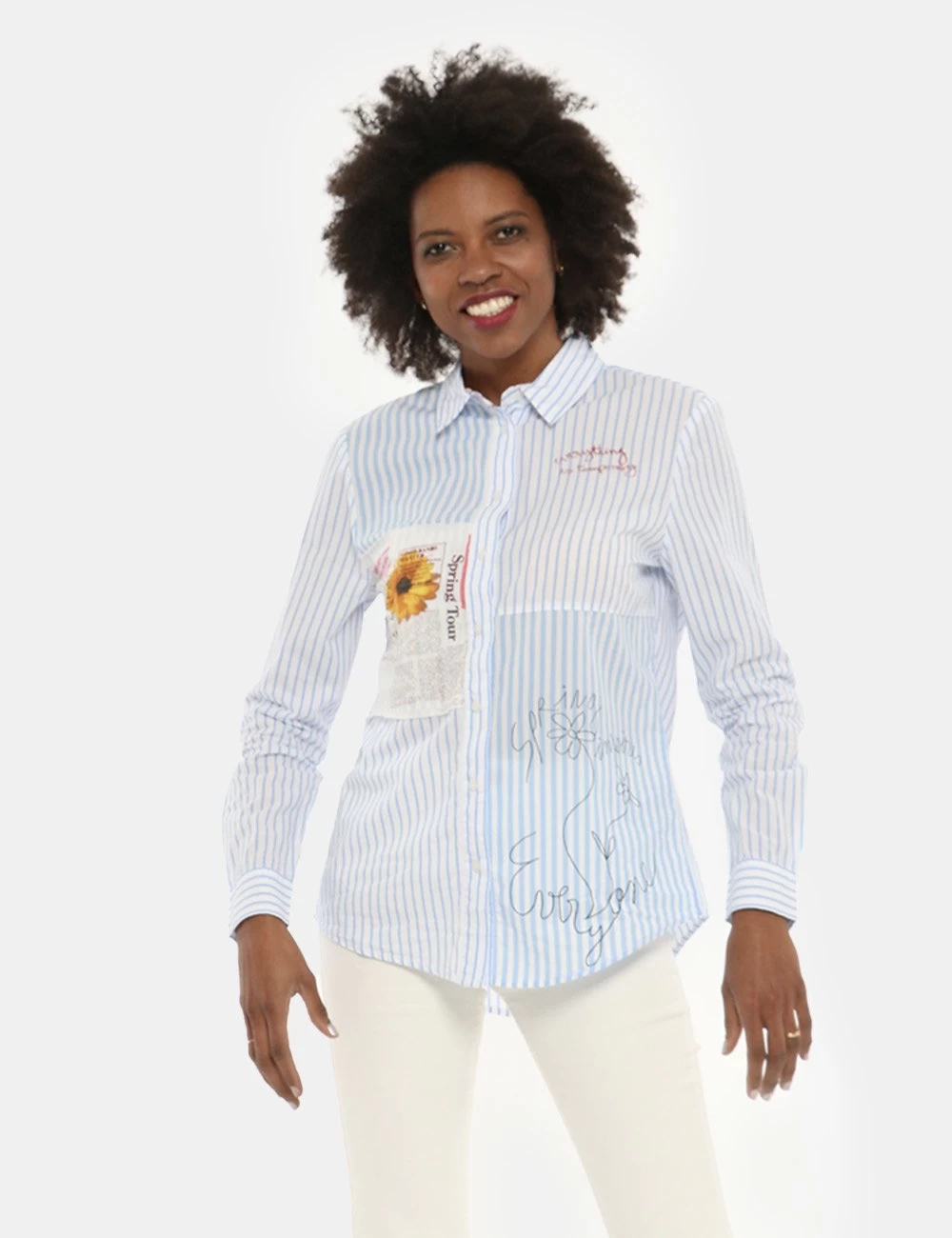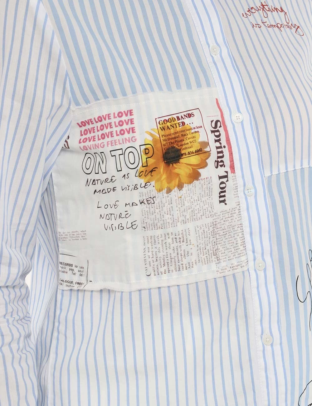 Camicia su sfondo rigato verticale in tinta bianco e azzurro chiaro. Presente patch rettangolare con stampa “Love Girasoli” in tinta rosso scarlatto e giallo più ricami vari sparsi sul capo. La vestibilità è morbida e pratica grazie a bottoni ad asola sul fronte e sui polsini. La camicia è adatta per occasioni casual e facilmente combinabile per outfit diurni/serali. Indossala per spiccare con stile.