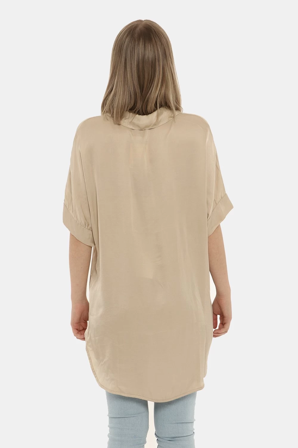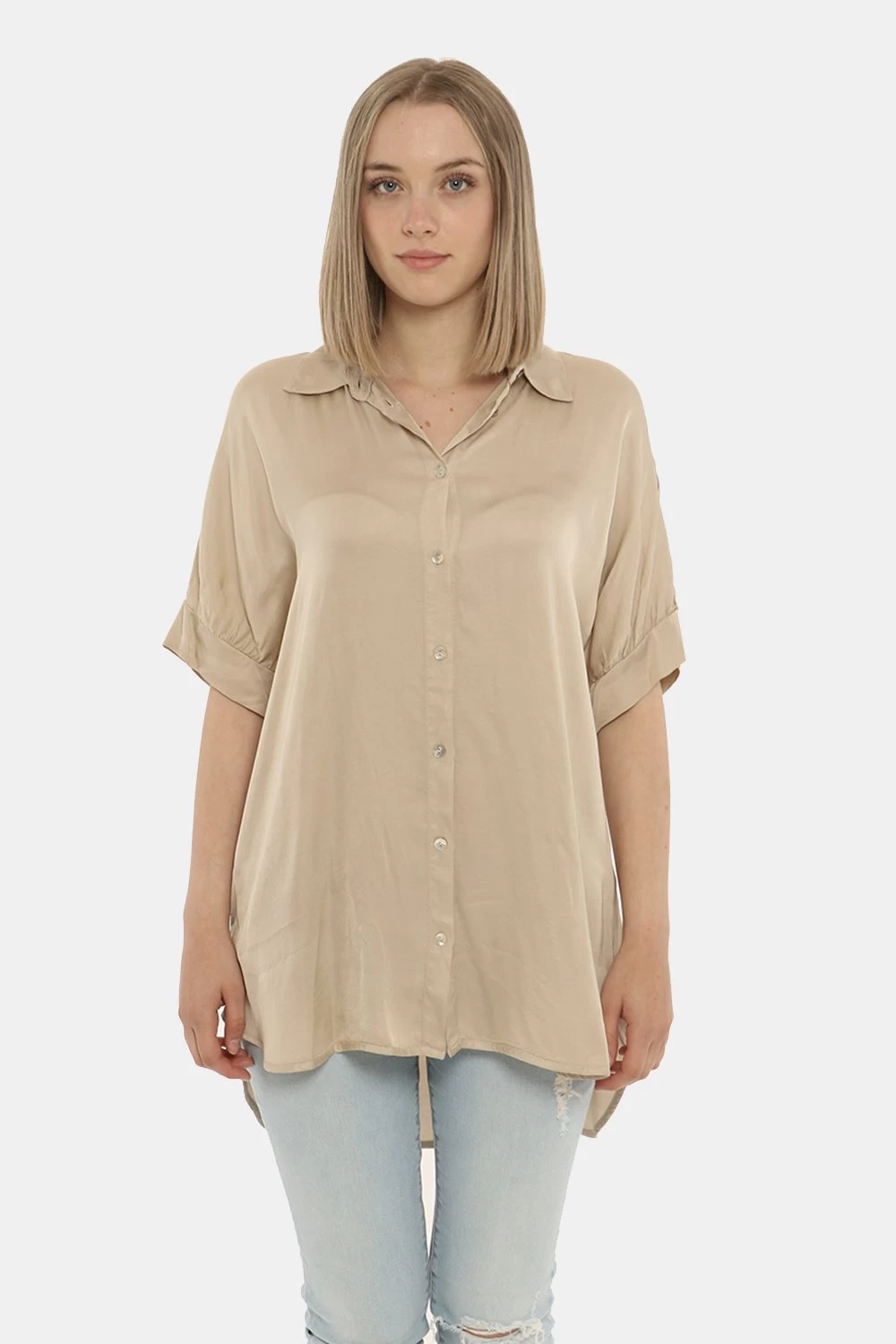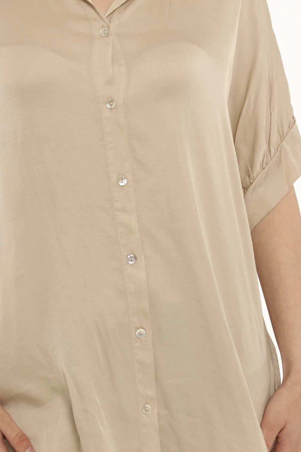 Ampia camicia a maniche corte in viscosa total nero. Il capo presenta con colletto classico e serie di bottoni ad asola in tinta sul fronte che permettono una vestibilità morbida e regolare. La camicia è adatta per occasioni casual/raffinate. Eleganza su misura: falla tua.