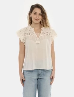 Top a maniche corte in total bianco panna con ricamo ad altezza spalle. Il capo è velato e presenta laccio pendente in tinta. La maglia è adatta per occasioni casual e facilmente combinabile per outfit diurni e serali. Raffinatezza e sobrietà: ecco il mix perfetto.