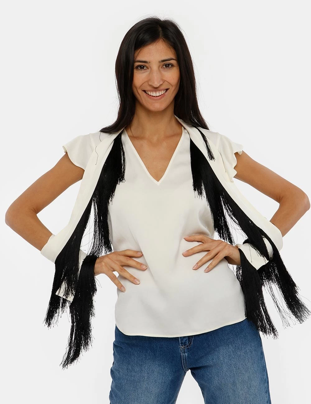 Scegli questa camicia con frange per un tocco originale alla tua mise da giorno! Un capo unico che rivoluzionerà il tuo stile! Ideale in abbinamento a un pantalone aderente