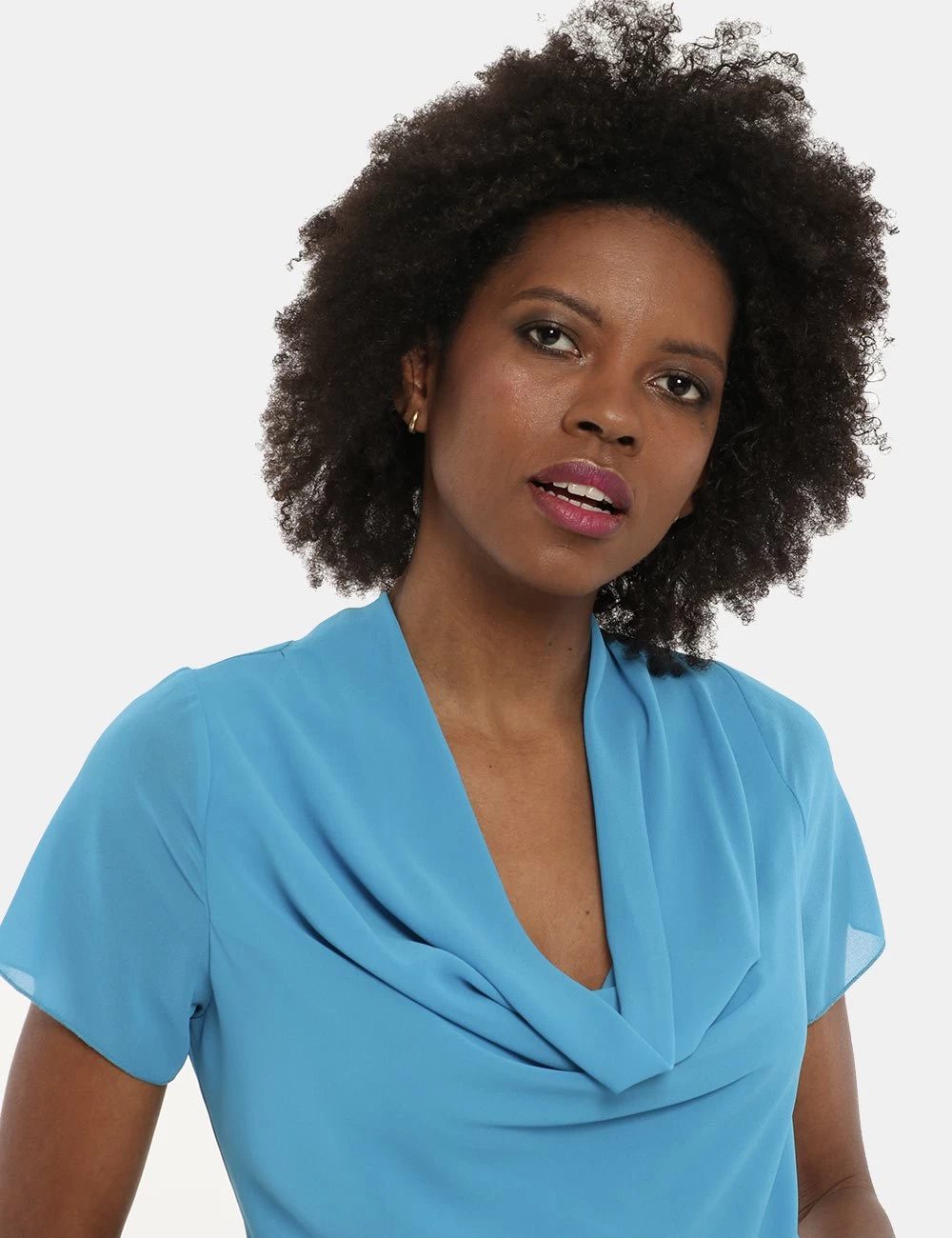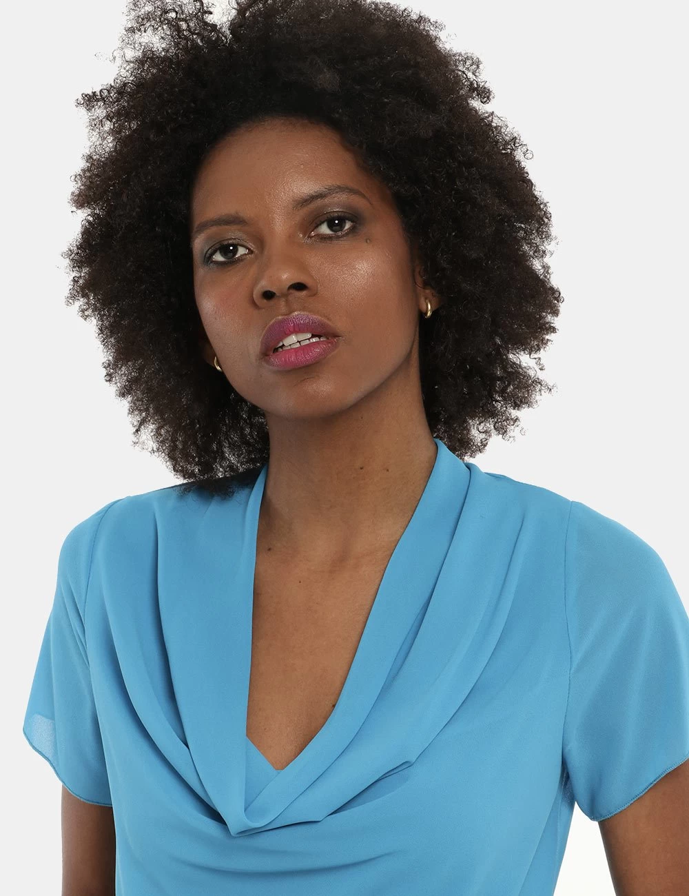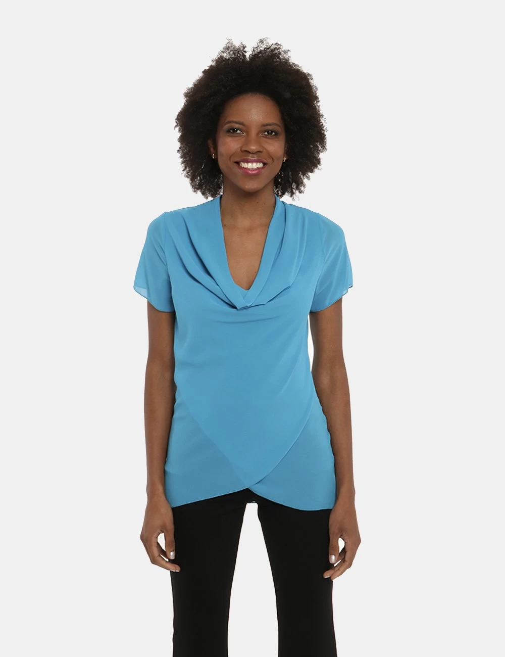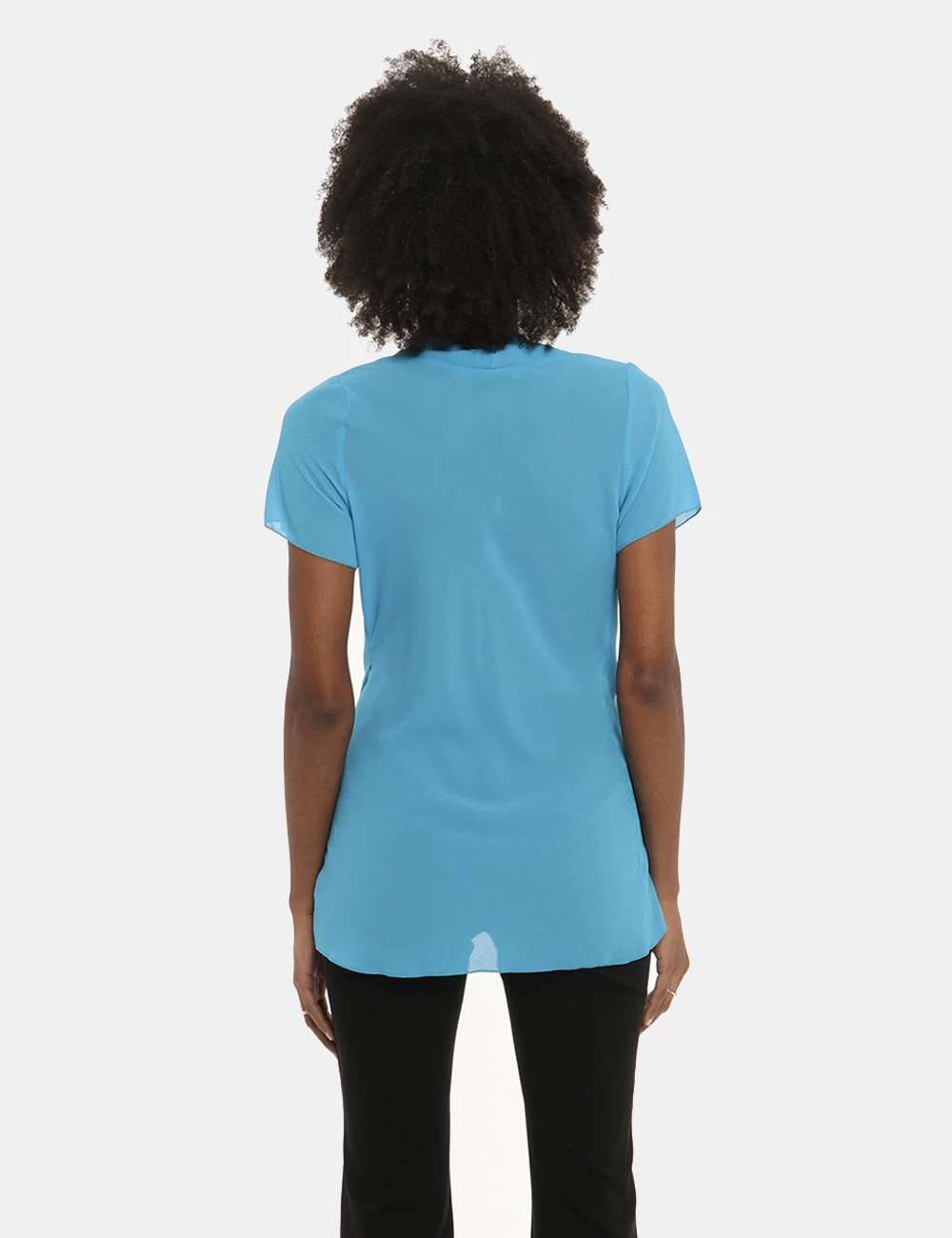 Camicia velata total azzurro turchese con scollo morbido e taglio incrociato sul fronte. Il capo si presenta a maniche corte ed ha una vestibilità morbida. La camicia è adatta per occasioni casual/raffinate e facilmente combinabile per outfit diurni e serali. Inseriscila nel carrello per spiccare con stile.