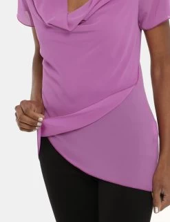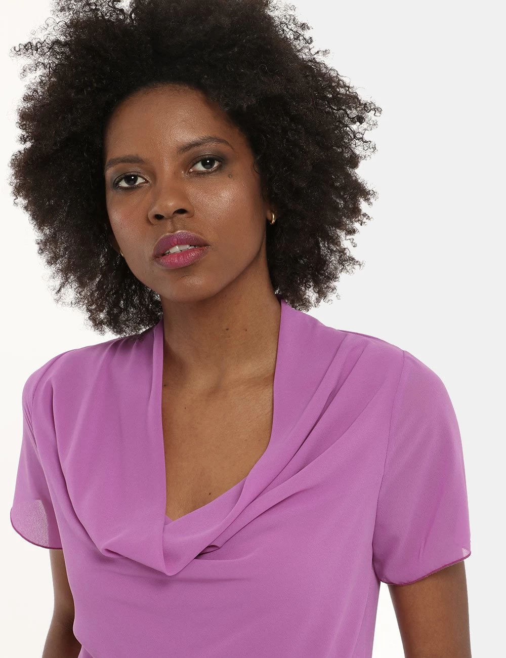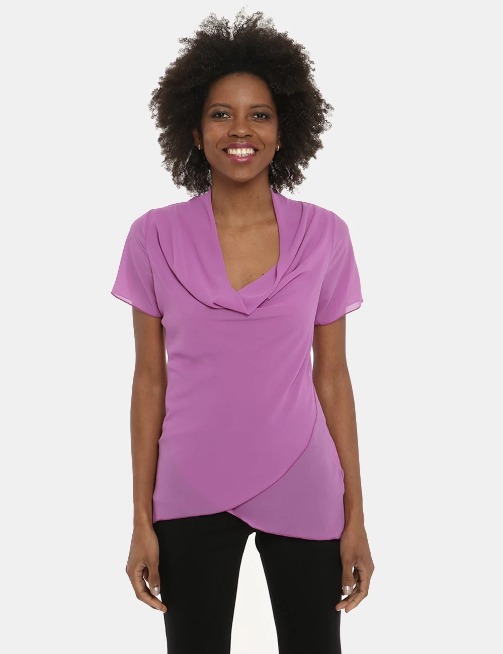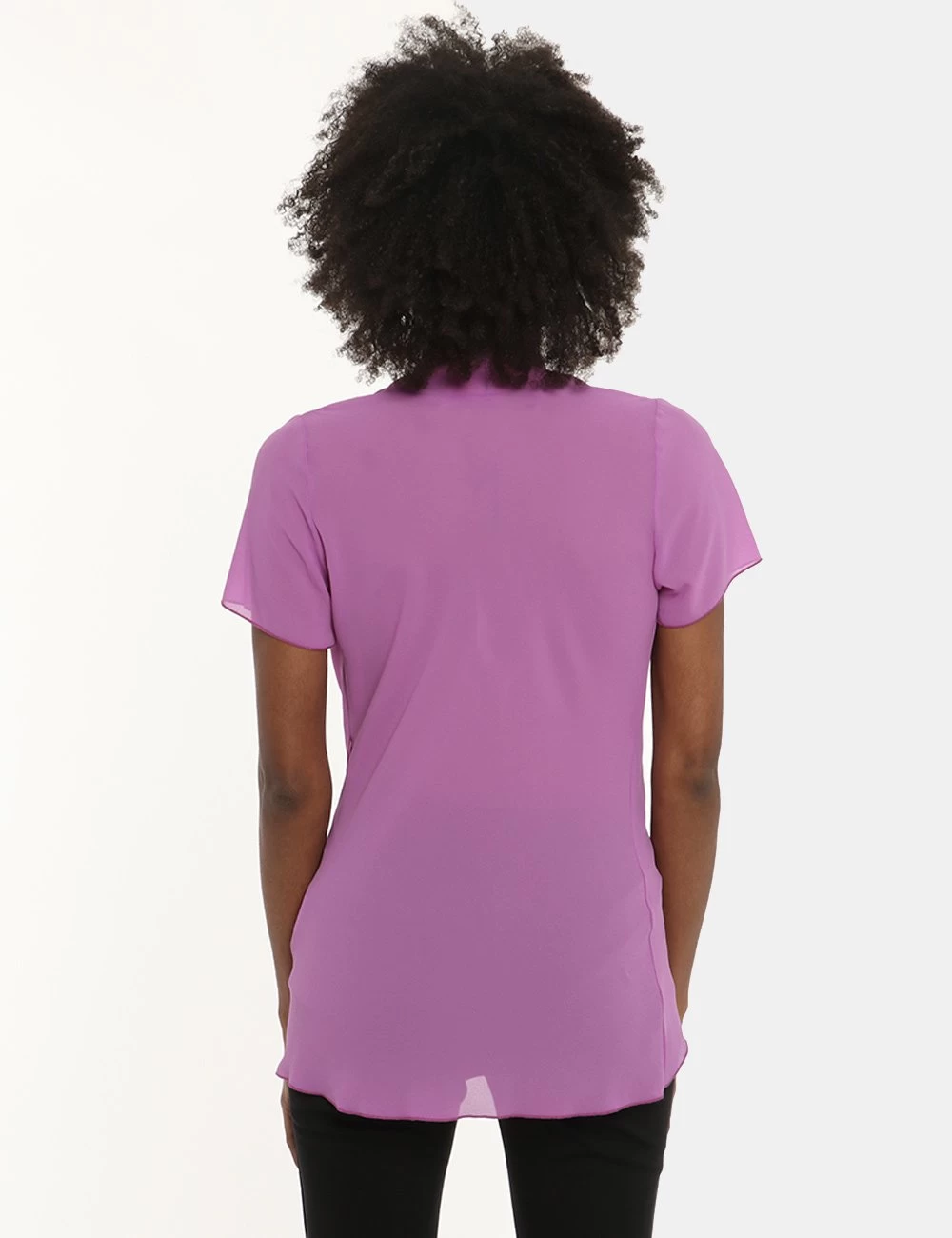 Camicia velata total viola ciclamino con scollo morbido e taglio incrociato sul fronte. Il capo si presenta a maniche corte ed ha una vestibilità morbida. La camicia è adatta per occasioni casual/raffinate e facilmente combinabile per outfit diurni e serali. Inseriscila nel carrello per spiccare con stile.