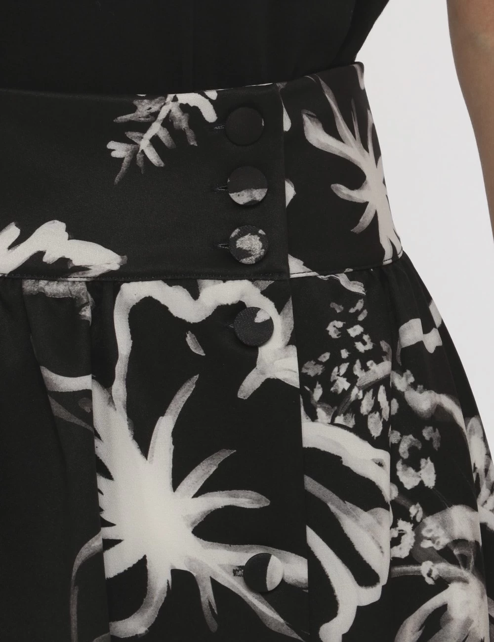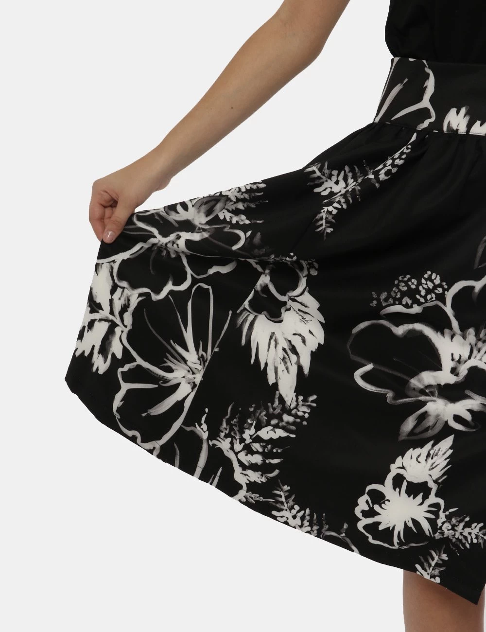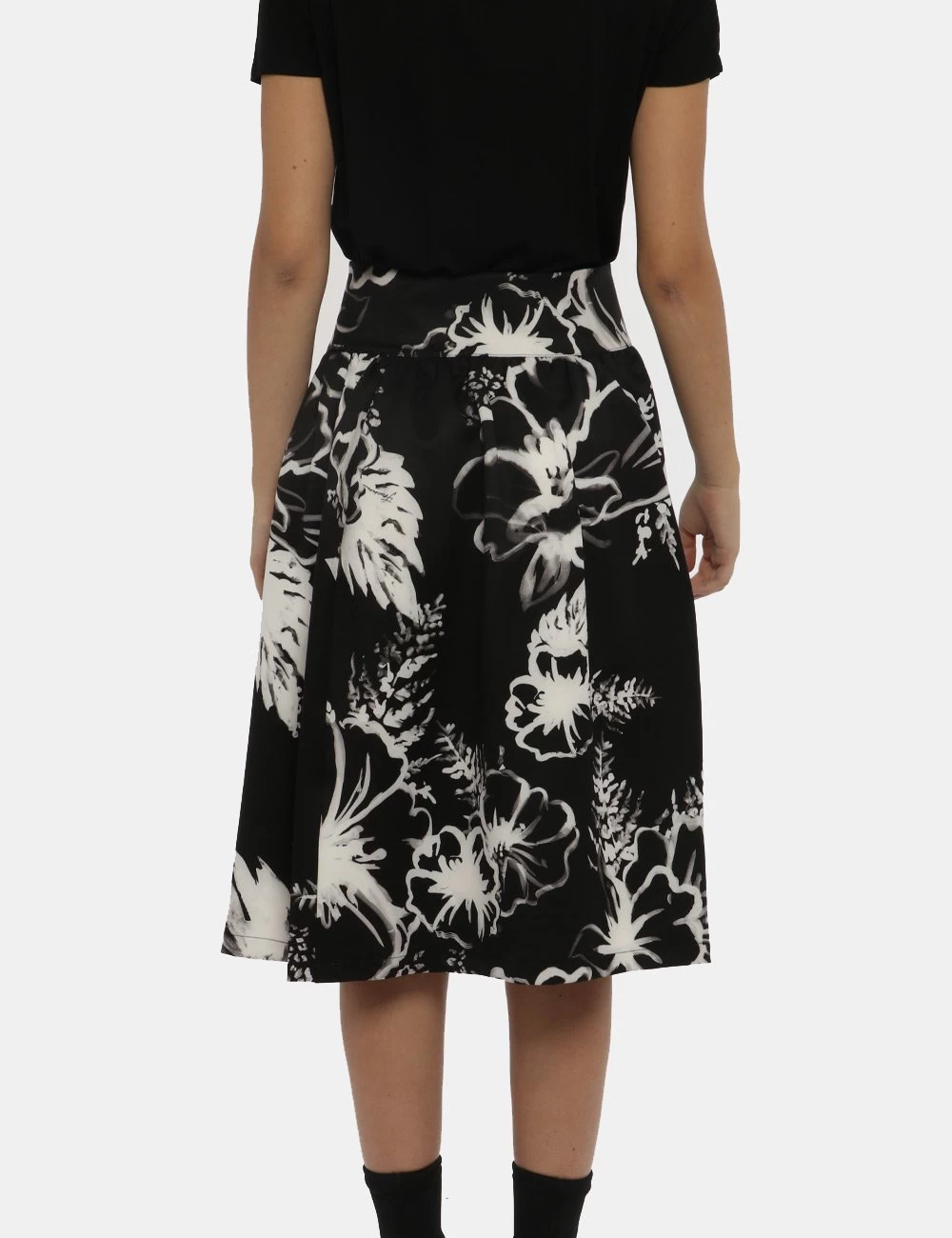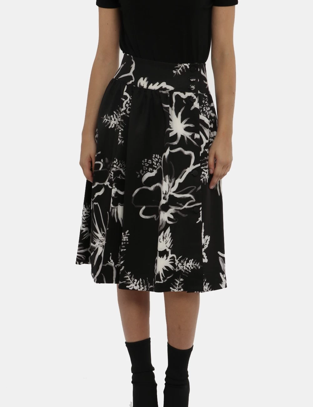 Gonna svasata morbida di lunghezza media su base nera con stampa allover fiori bianchi. La vestibilità è morbida e pratica grazie a bottoni ad asola in tinta lungo il fronte. La gonna è ideale per occasioni casual/raffinate. Indossala se vuoi spiccare con stile.