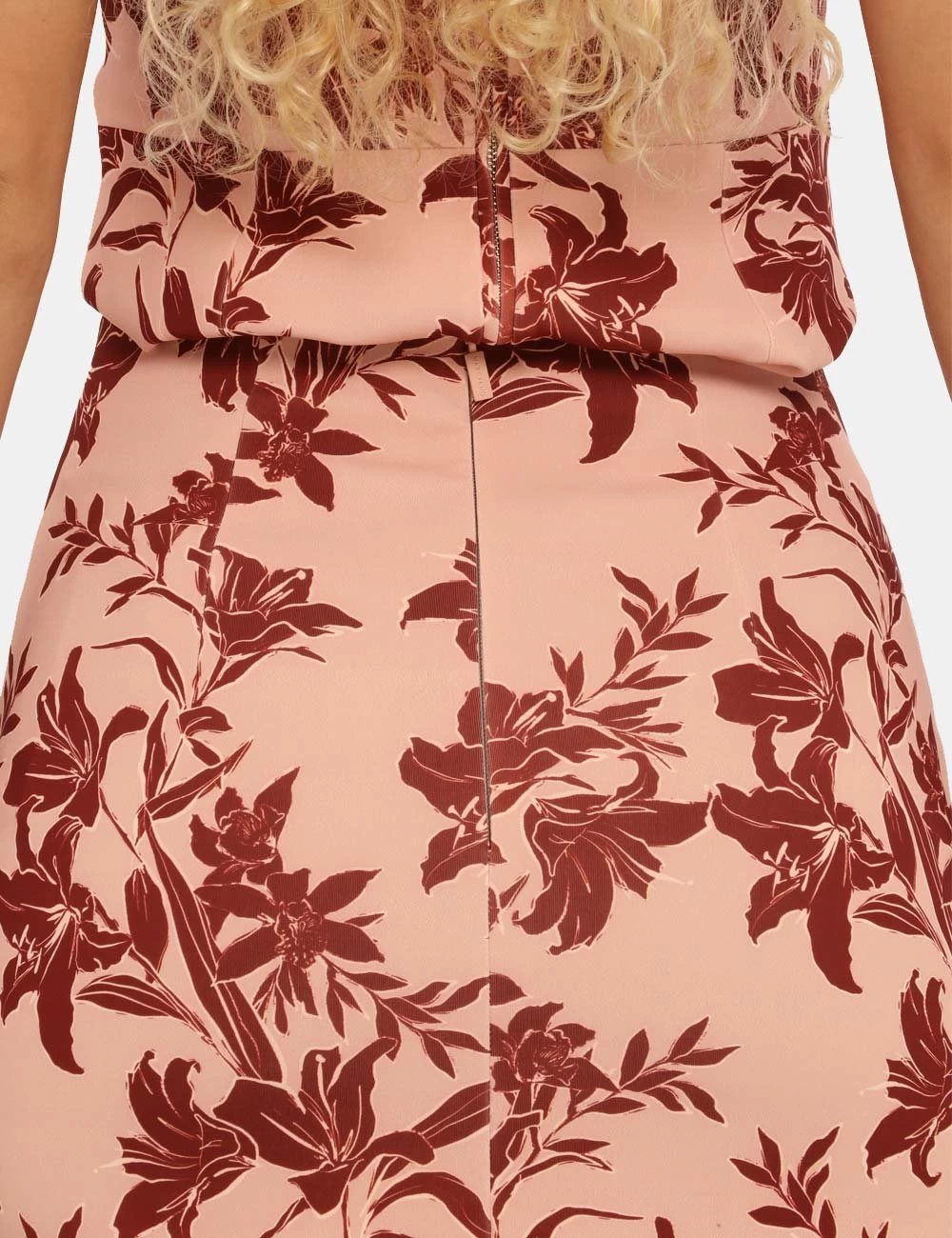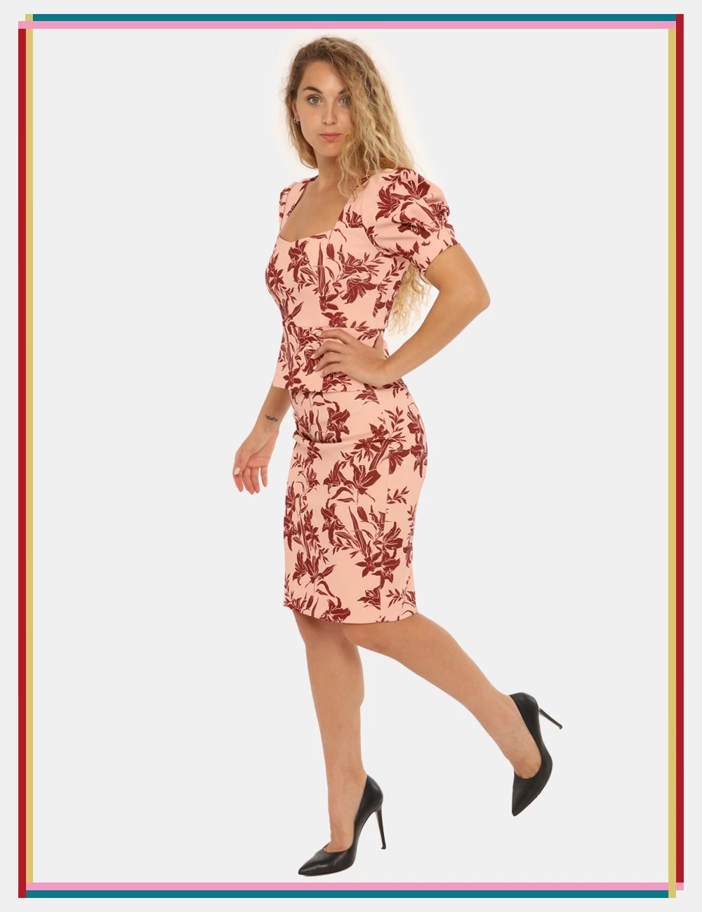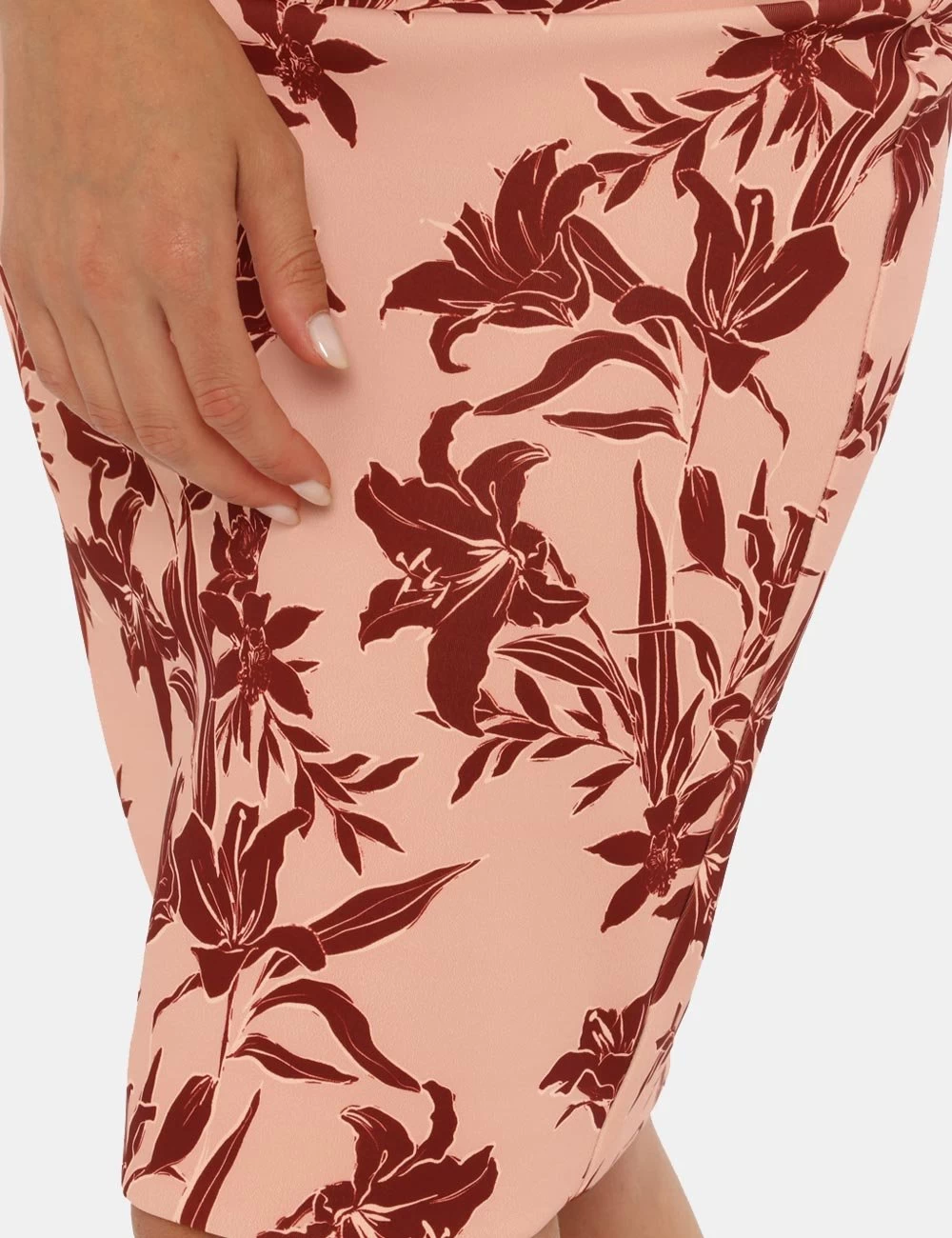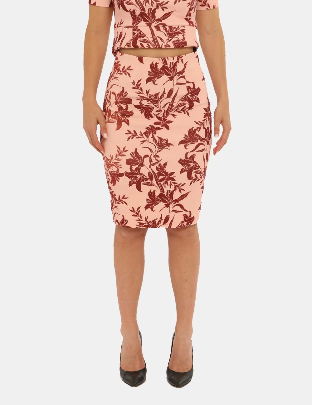 Gonna a tubo su sfondo rosa antico con stampa floreale bordeaux. La vestibilità è morbida e pratica grazie a zip sul retro. La gonna è adatta per occasioni casual/raffinate e facilmente combinabile per outfit diurni e serali. Un capo tradizionale che non passa mai di moda. L’articolo appartiene al campionario esclusivo di stagione: pezzo unico.