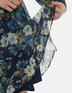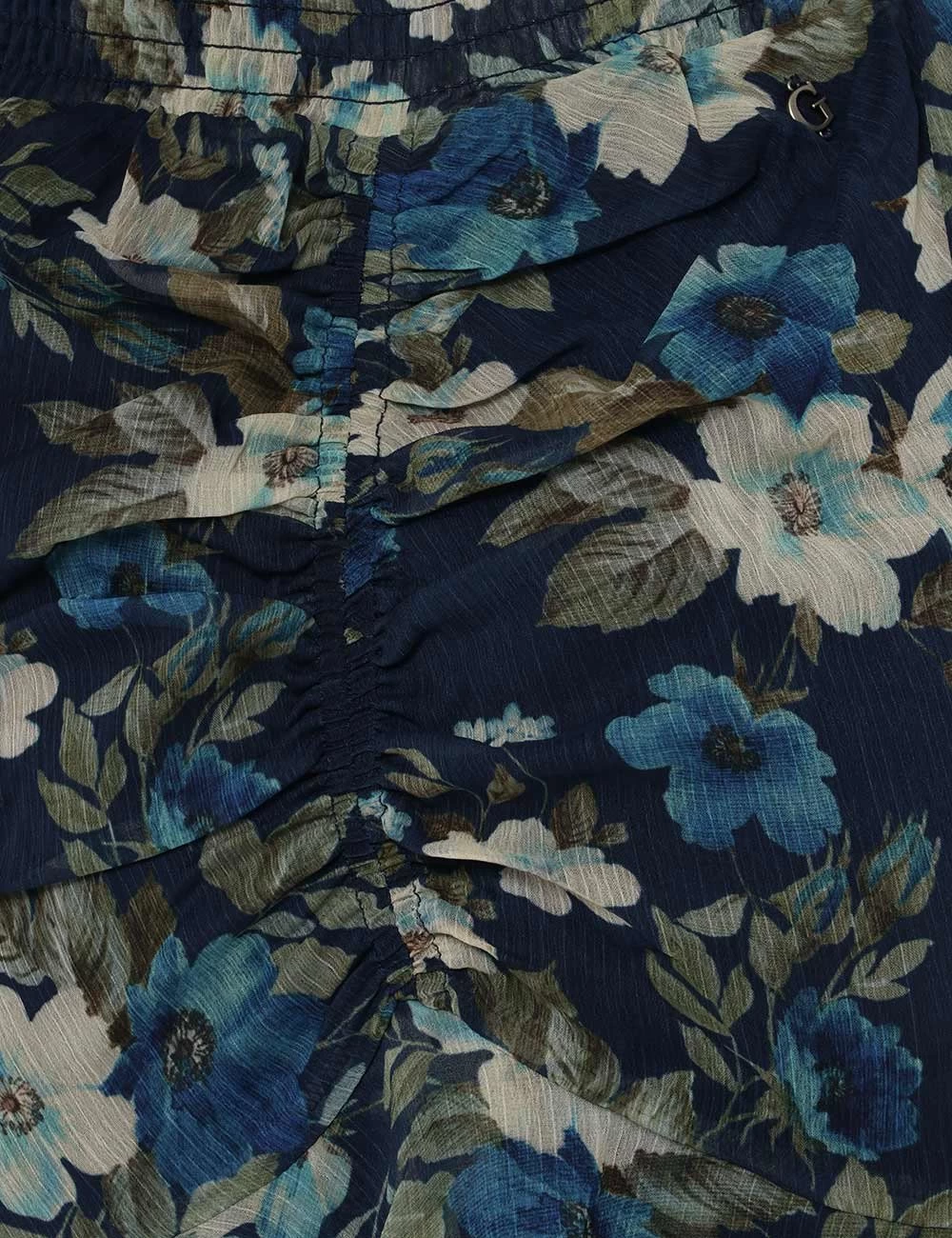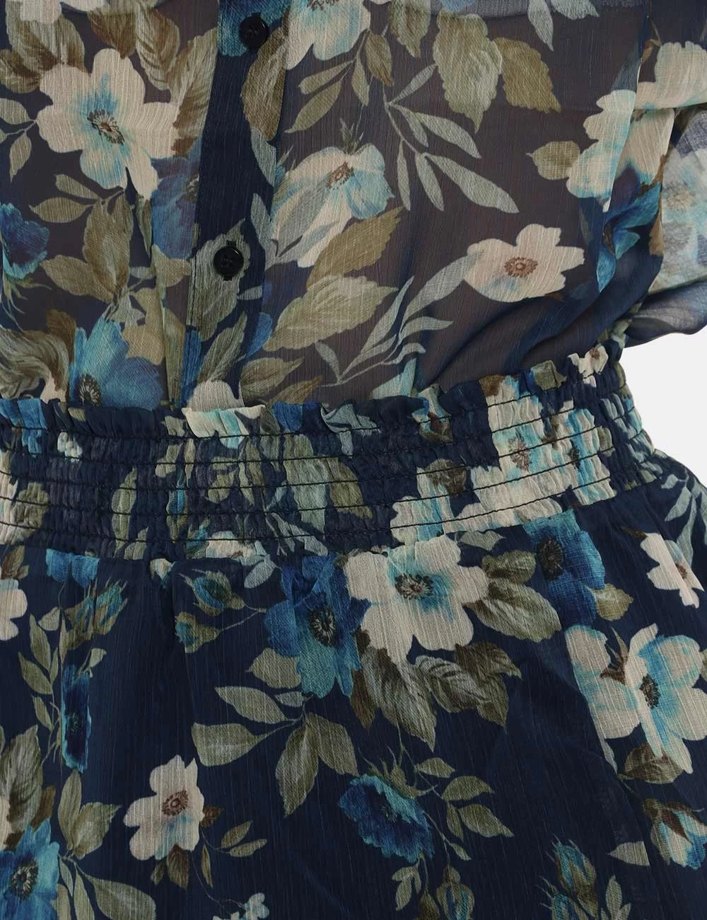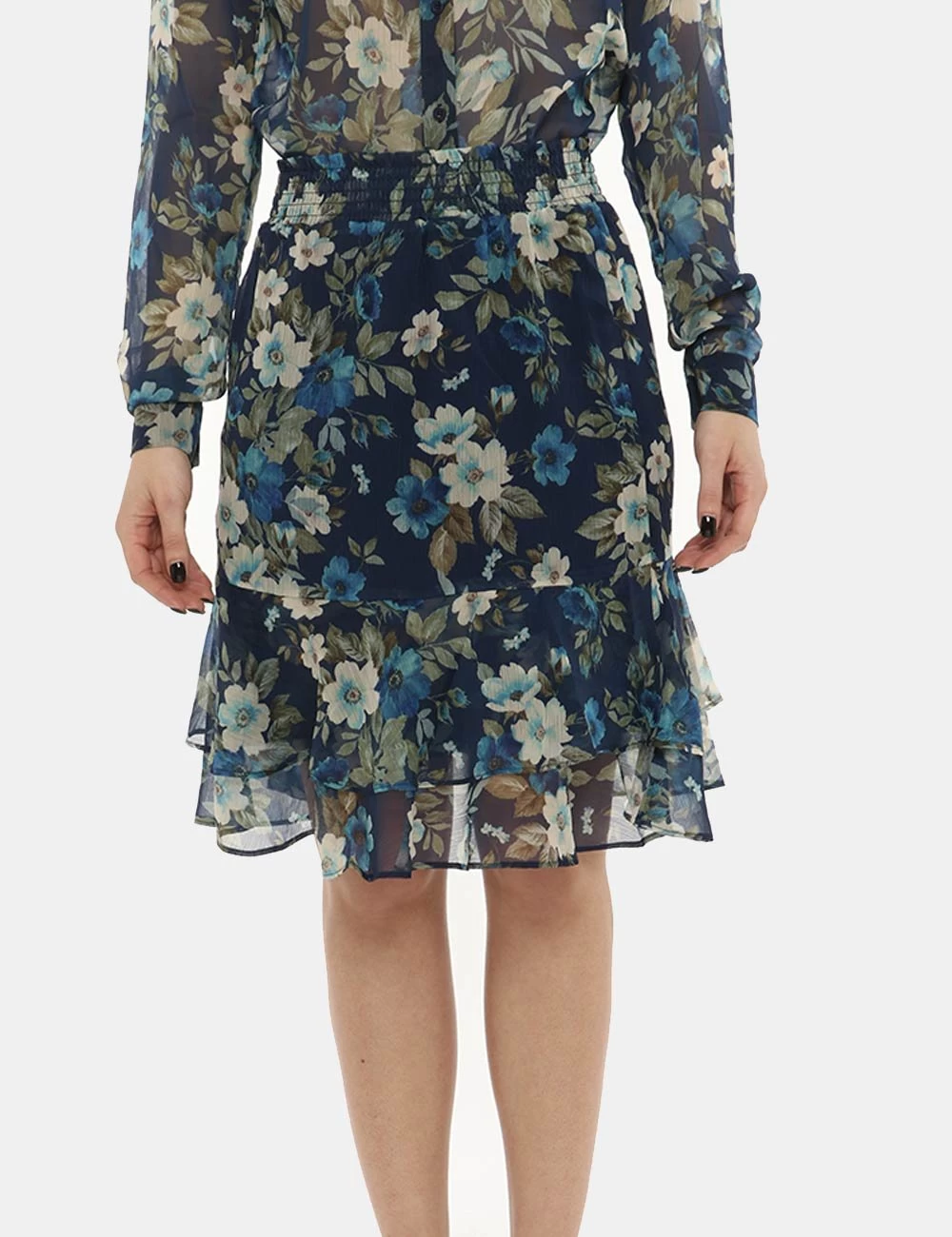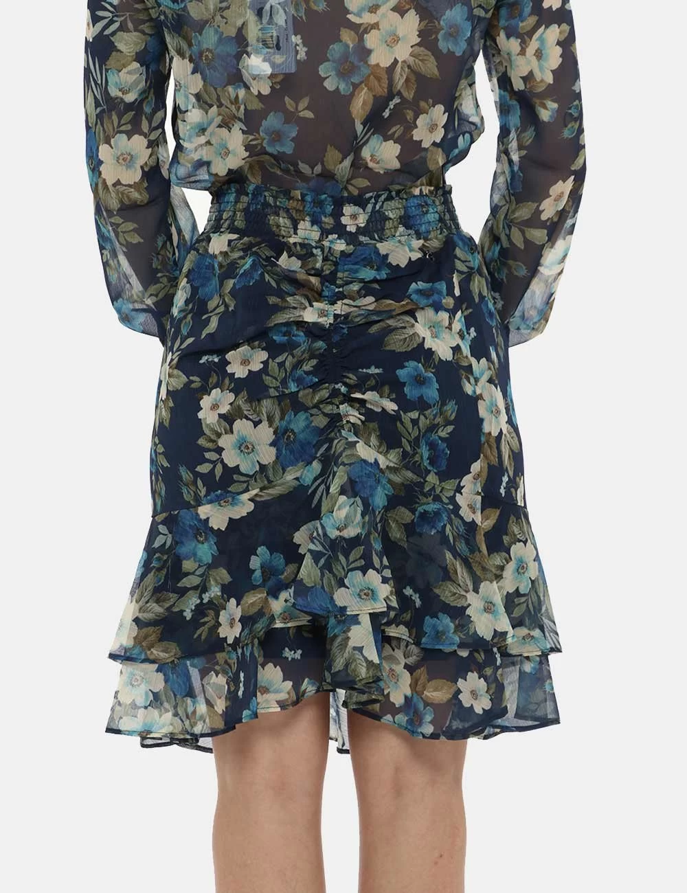 Gonna su base blu navy con stampa allover fantasia floreale in varie tonalità di azzurro e beige. Il capo si presenta leggero anche grazie a volant nella parte inferiore. La vestibilità è morbida e regolabile grazie ad elastico arricciato in girovita più arricciatura verticale sul retro. La gonna è fresca e ideale per occasioni casual ma anche per outfit diurni e serali. Se vuoi spiccare con stile e leggerezza di questo capo non puoi fare a meno.