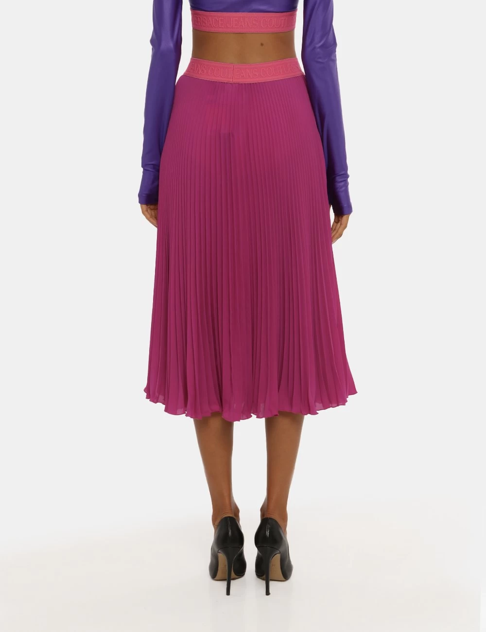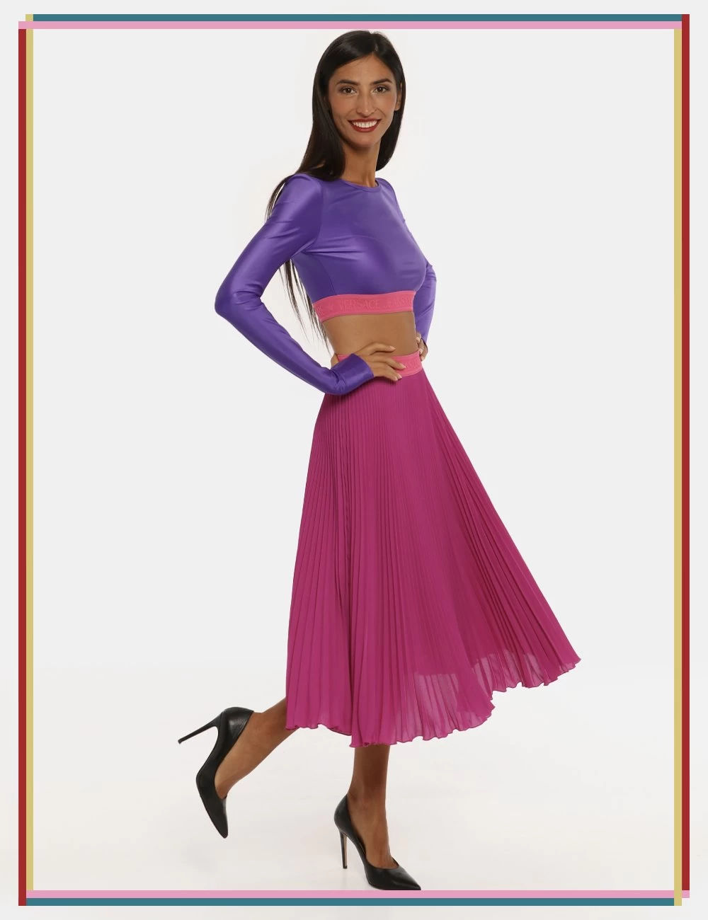 Gonna lunga plissettata in total fuxia. La vestibilità è morbida e regolabile grazie ad elastico in girovita rosa con logo brand in rilievo. La gonna è adatta per occasioni casual e serate vivaci. Troppo fashion per non farla tua. L’articolo appartiene al campionario esclusivo di stagione: pezzo unico.
