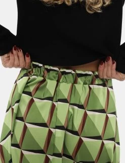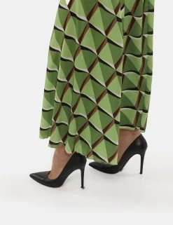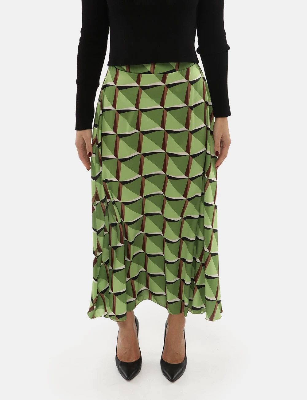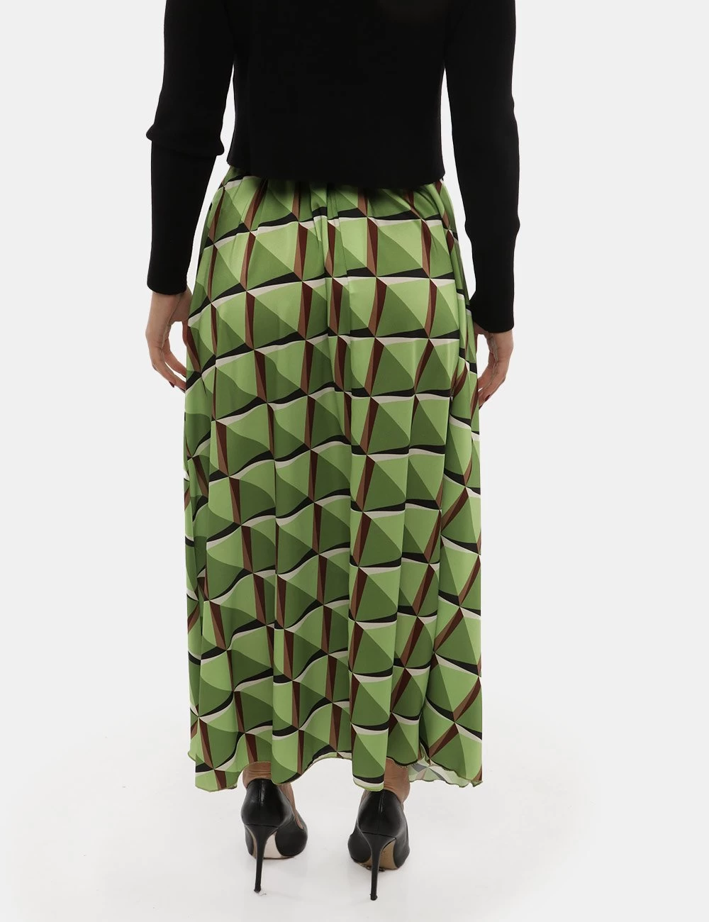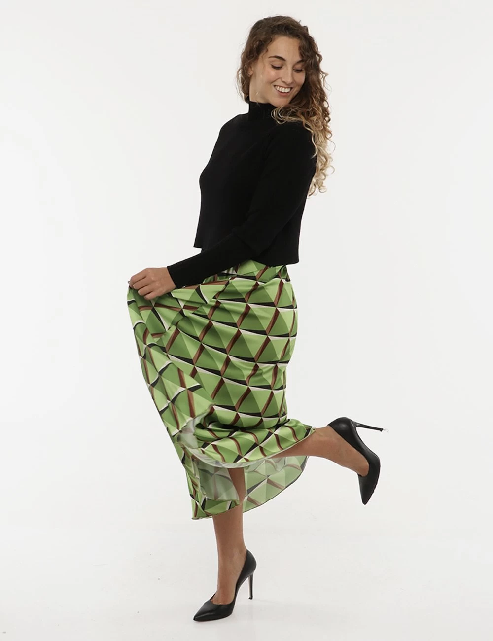 Gonna lunga in tessuto lucido effetto raso con stampa geometrica sui toni del verde e del marrone. Un tuffo nei coloratissimi anni ’70 per una gonna da vero effetto wow! Abbinala ad uno stivale in cuoio e un maglione a dolcevita in tinta. Osa con i colori e le geometrie non temere!