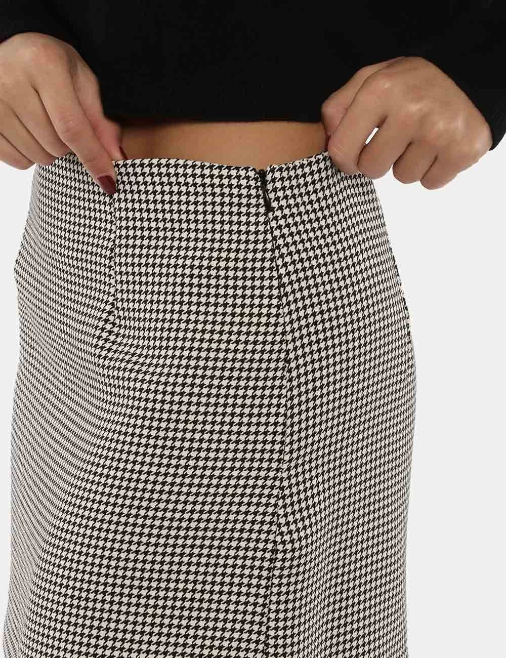 Minigonna stampata in fantasia pied de poule. Tessuto morbido e leggero. Favolosa. Abbinala ad un maglioncino rosso e ad un cappotto lungo nero per un outfit da settimana della moda! Se vuoi osare ancora di più opta per un look total black e abbinala a stivaletti rossi in vernice!