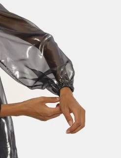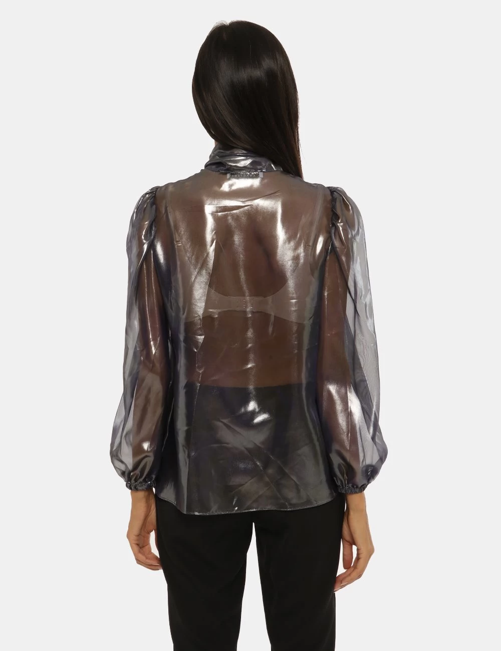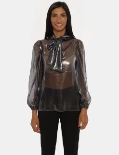 Maglia velata a maniche lunghe in total nero. Presente scollo a V ed eventuale fiocco. La vestibilità è morbida e regolare. La maglia è adatta per occasioni casual. Fashion addicted.
