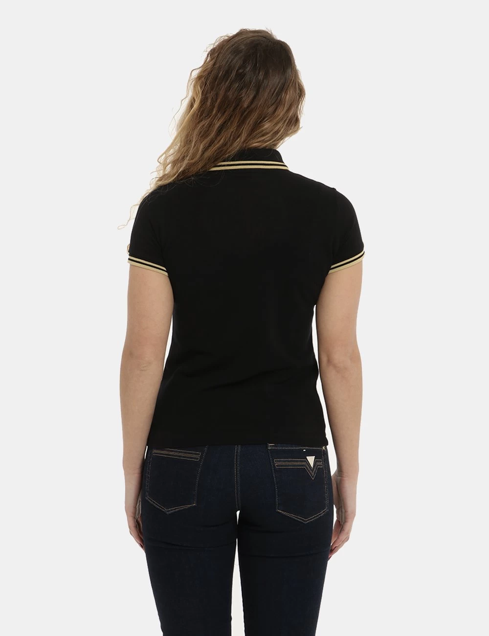 Polo in total nero con patch logo brand applicato ad altezza cuore dorato. Presente colletto alla peter pan in rosso scarlatto che richiama il profilo delle maniche corte. La vestibilità è morbida e pratica grazie a bottoni ad asola in tinta ad altezza girocollo. La polo è adatta per occasioni casual e facilmente combinabile per outfit diurni. Inseriscila nel carrello per un classico che non tramonta mai.