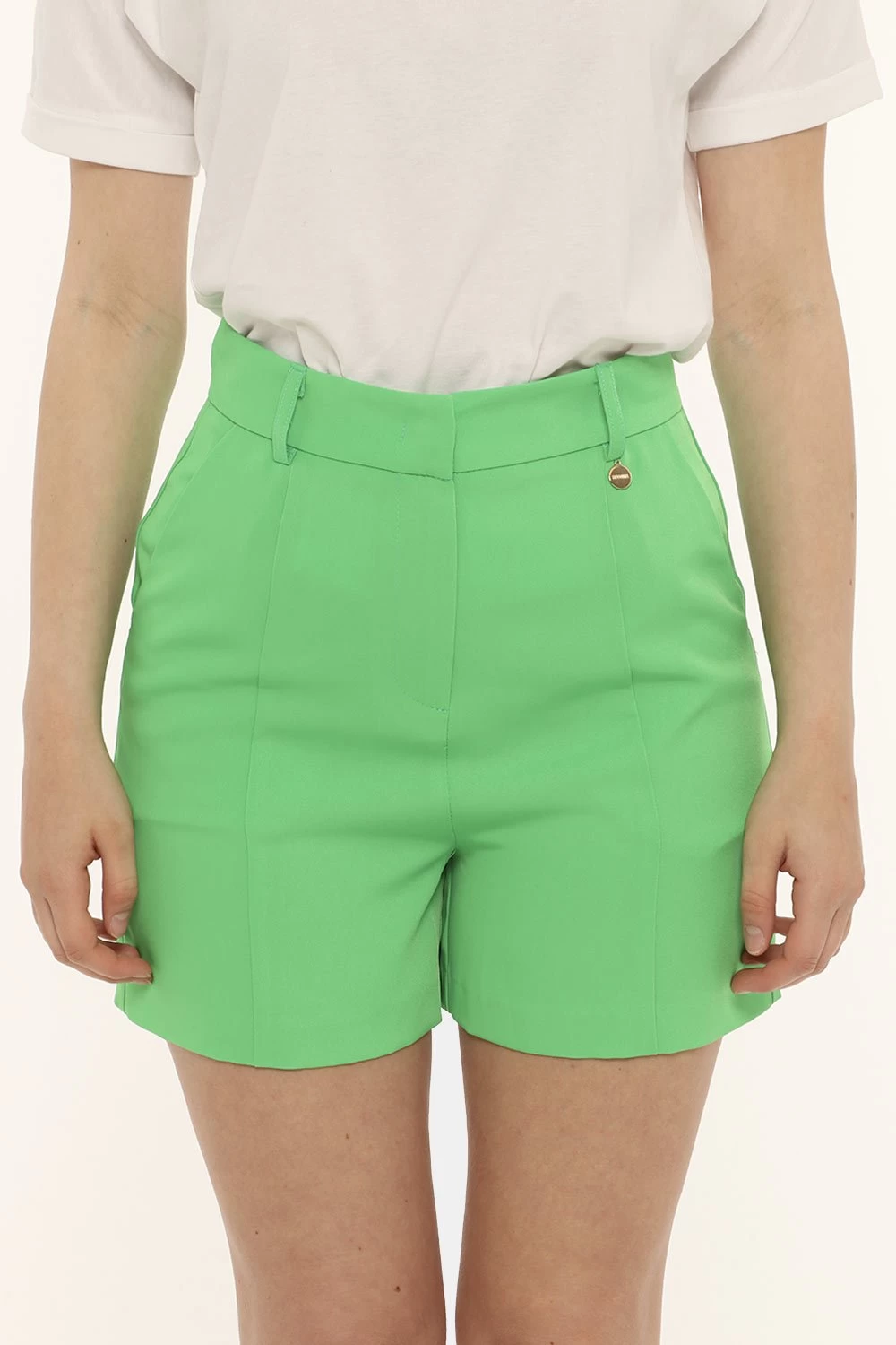 Short in total verde fluo con tasche a taglio trasversale sul fronte. La vestibilità è morbida e pratica grazie a gancino in girovita più zip ed eventuale cintura. Gli short sono adatti per occasioni casual/raffinate. Amore al primo scroll.