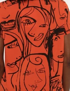 T-shirt su base arancione con stampa allover stilizzata donna in tonalità nero. La vestibilità è morbida e regolare. La t-shirt è adatta per occasioni casual. Dai un tocco di colore ai tuoi outfit. L’articolo appartiene al campionario esclusivo di stagione: pezzo unico.