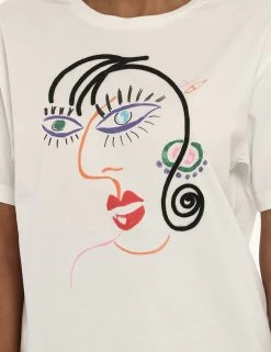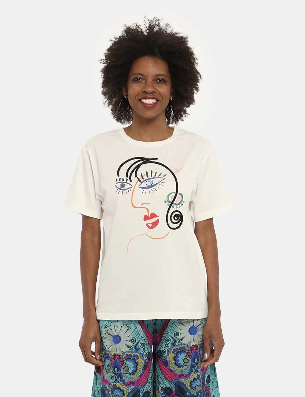 T-shirt simpatica su sfondo bianco con stilizzata stampa di un volto evidenziato solo nei contorni ed in tinta vivace. La vestibilità è morbida e priva di allacciature. La t-shirt è adatta per occasioni casual e facilmente combinabile per outfit diurni. Falla tua se vuoi spiccare con stile.