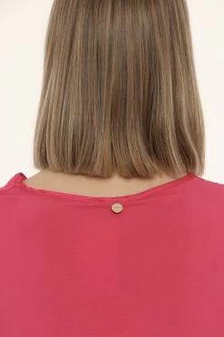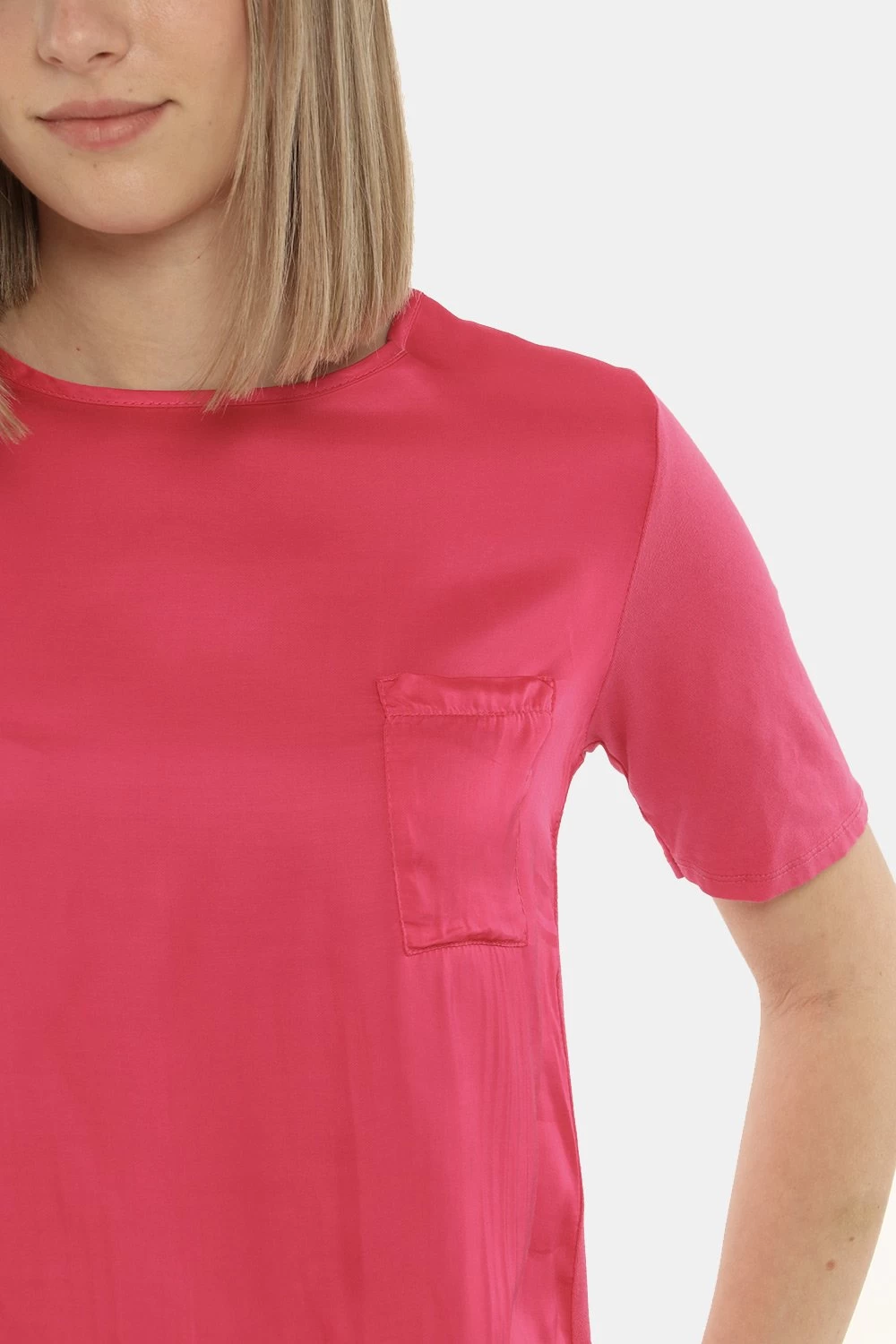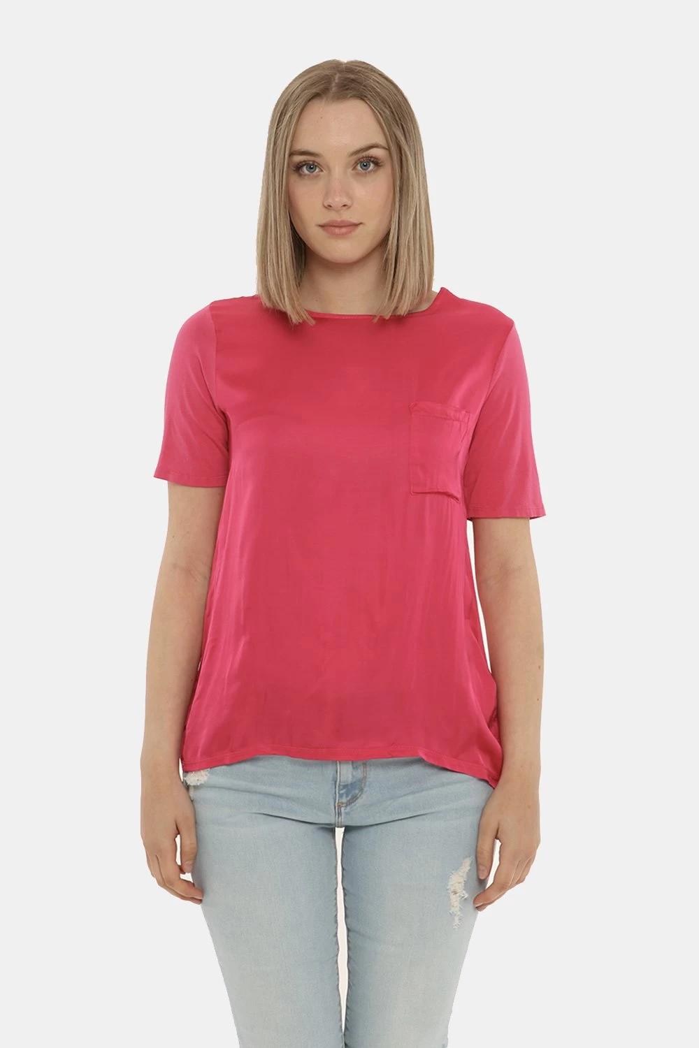 T-shirt in viscosa in total fuxia con taschino a toppa ad altezza cuore. La vestibilità è morbida e regolare. La t-shirt è adatta per occasioni casual e facilmente combinabile per outfit diurni e serali. Inseriscila nel carrello se vuoi spiccare con stile.
