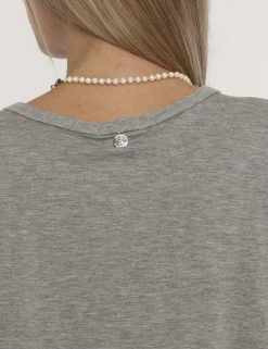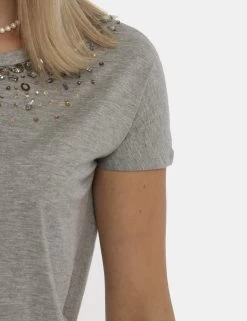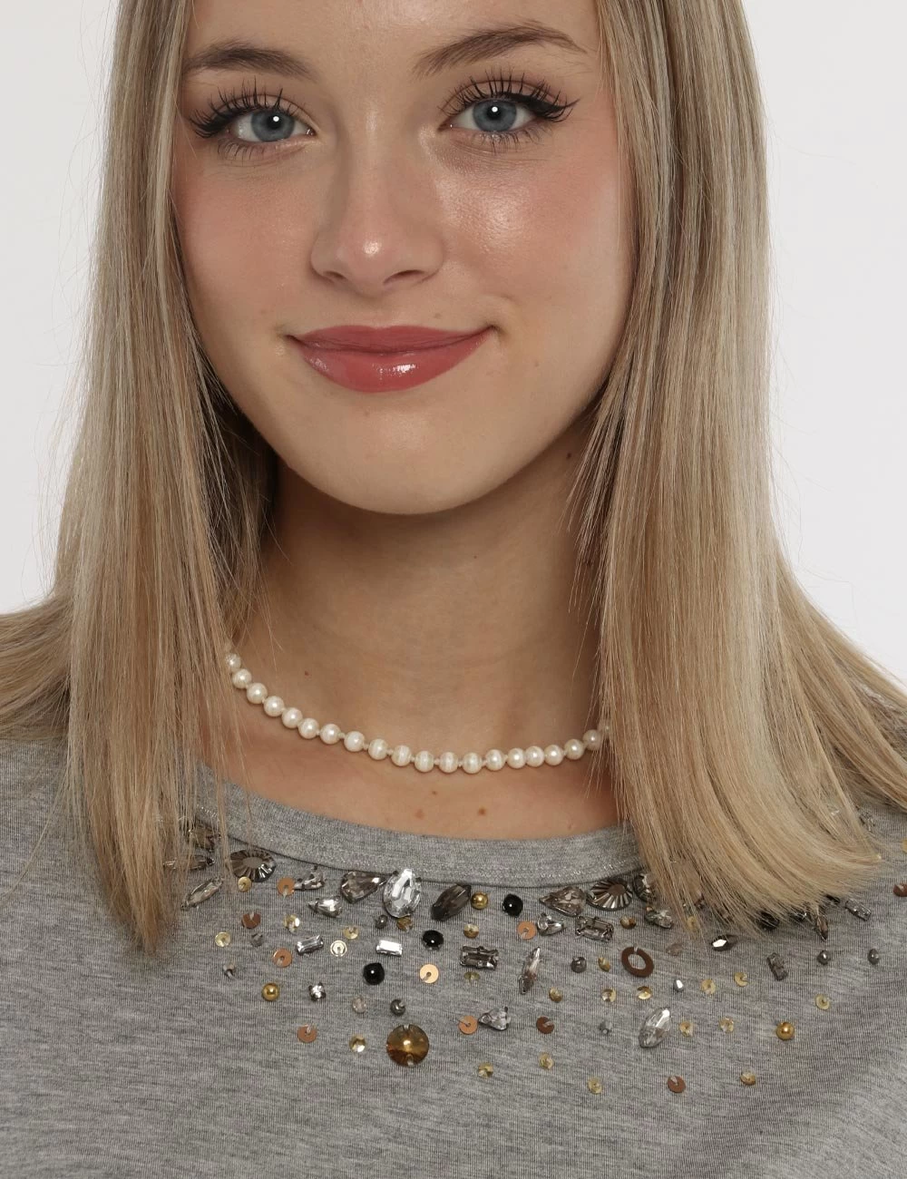T-shirt su sfondo grigio chiaro con pietrine e glitter in argento e oro applicati intorno al girocollo. La vestibilità è morbida e regolare. La t-shirt è adatta per occasioni casual e raffinate e facilmente combinabile per outfit diurni e serali. Indossa questa t-shirt per spiccare con stile.
