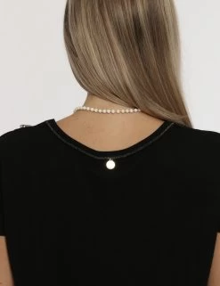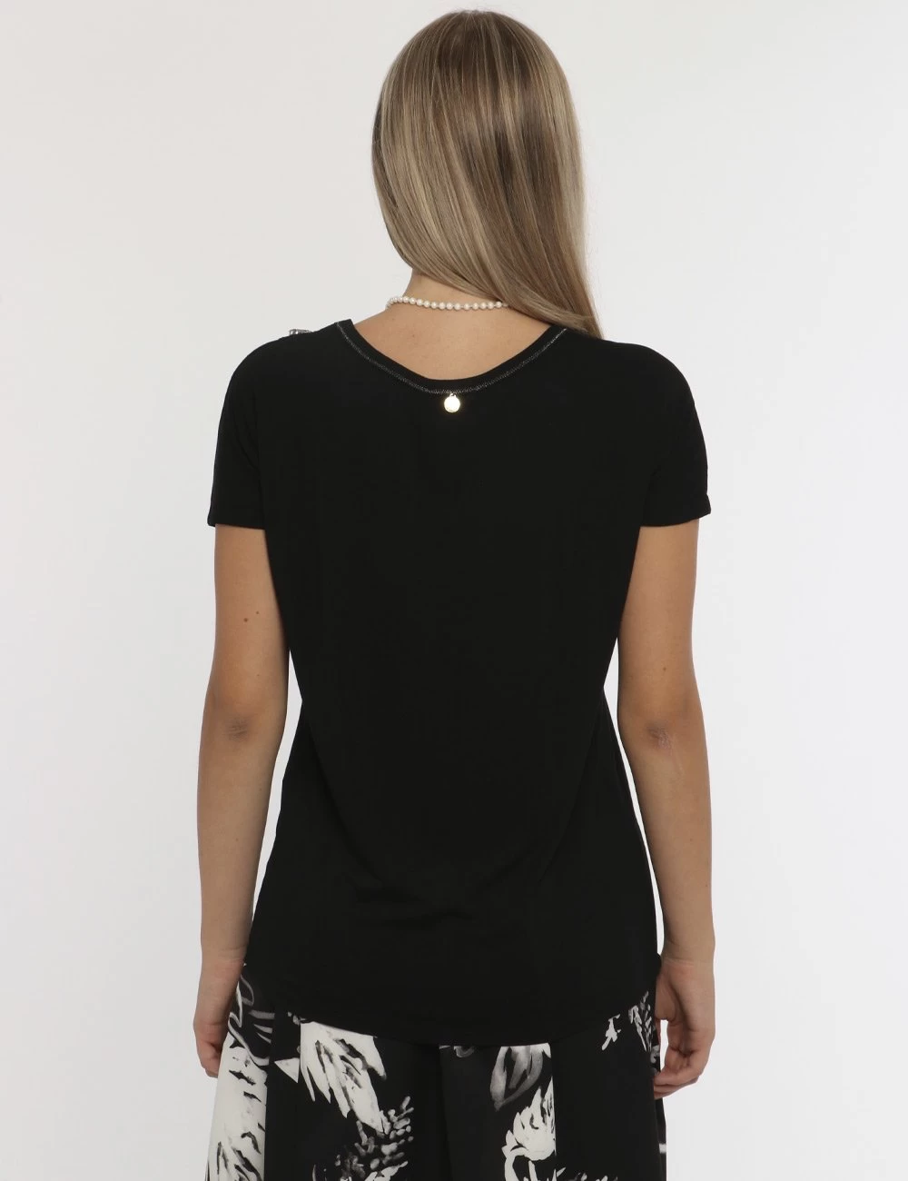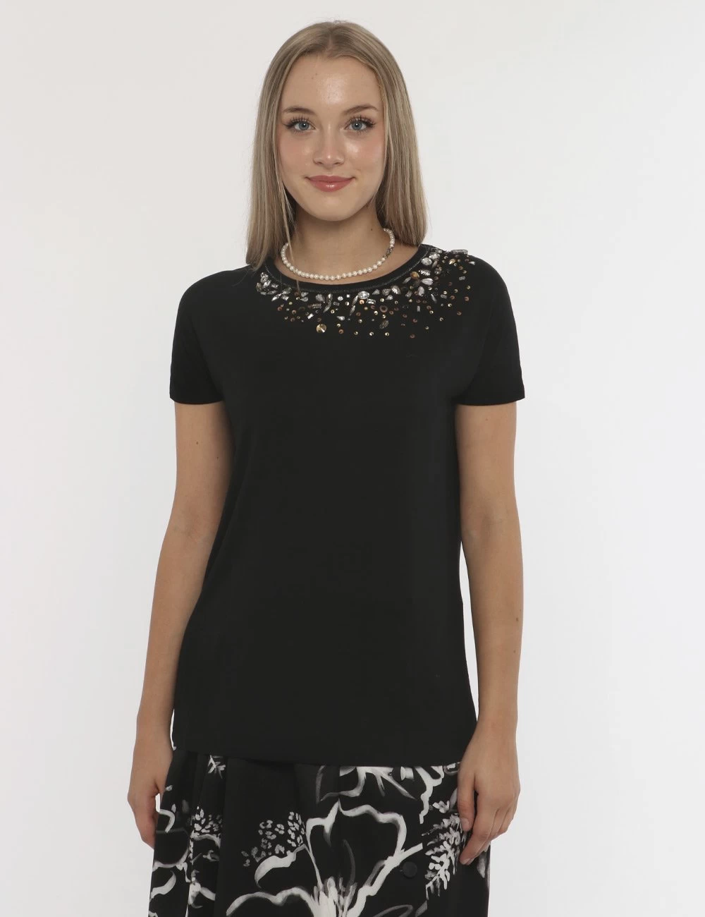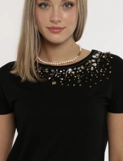 T-shirt su sfondo nero con pietrine e glitter in argento e oro applicati intorno al girocollo. La vestibilità è morbida e regolare. La t-shirt è adatta per occasioni casual e raffinate e facilmente combinabile per outfit diurni e serali. Indossa questa t-shirt per spiccare con stile.