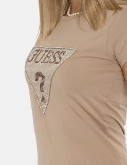 T-shirt su base beige con stampa Guess in glitter coordinati. La vestibilità è morbida e regolare. La t-shirt è adatta per occasioni casual/raffinate e facilmente combinabile per outfit diurni/serali. Aggiungila al tuo guardaroba per spiccare con stile.