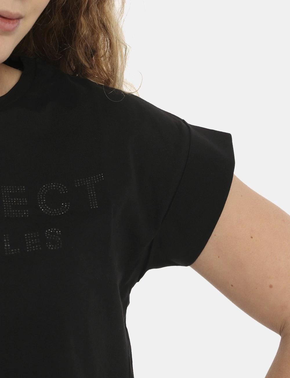 T-shirt corta su sfondo nero con logo brand centrale in glitter argentati. La vestibilità è morbida e regolare. La t-shirt è adatta per occasioni casual e facilmente combinabile per outfit diurni e serali. Ricorda che la motivazione inizia con un nuovo acquisto.