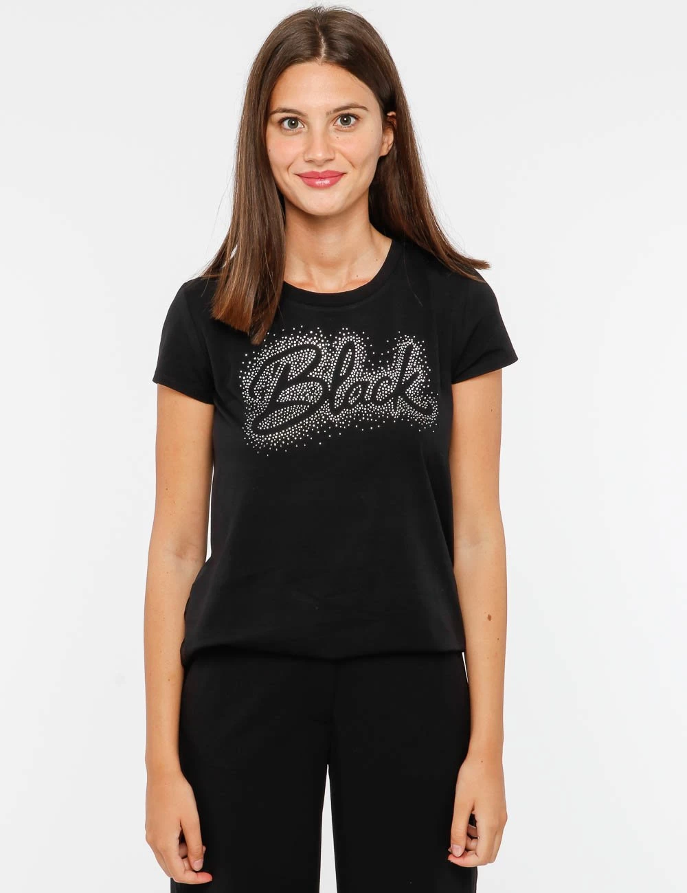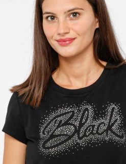 Scegli questa t-shirt per far spiccare i tuoi look da giorno. Tanti strass che circondano una scritta per creare un capo unico! Ideale sopra a un jeans
