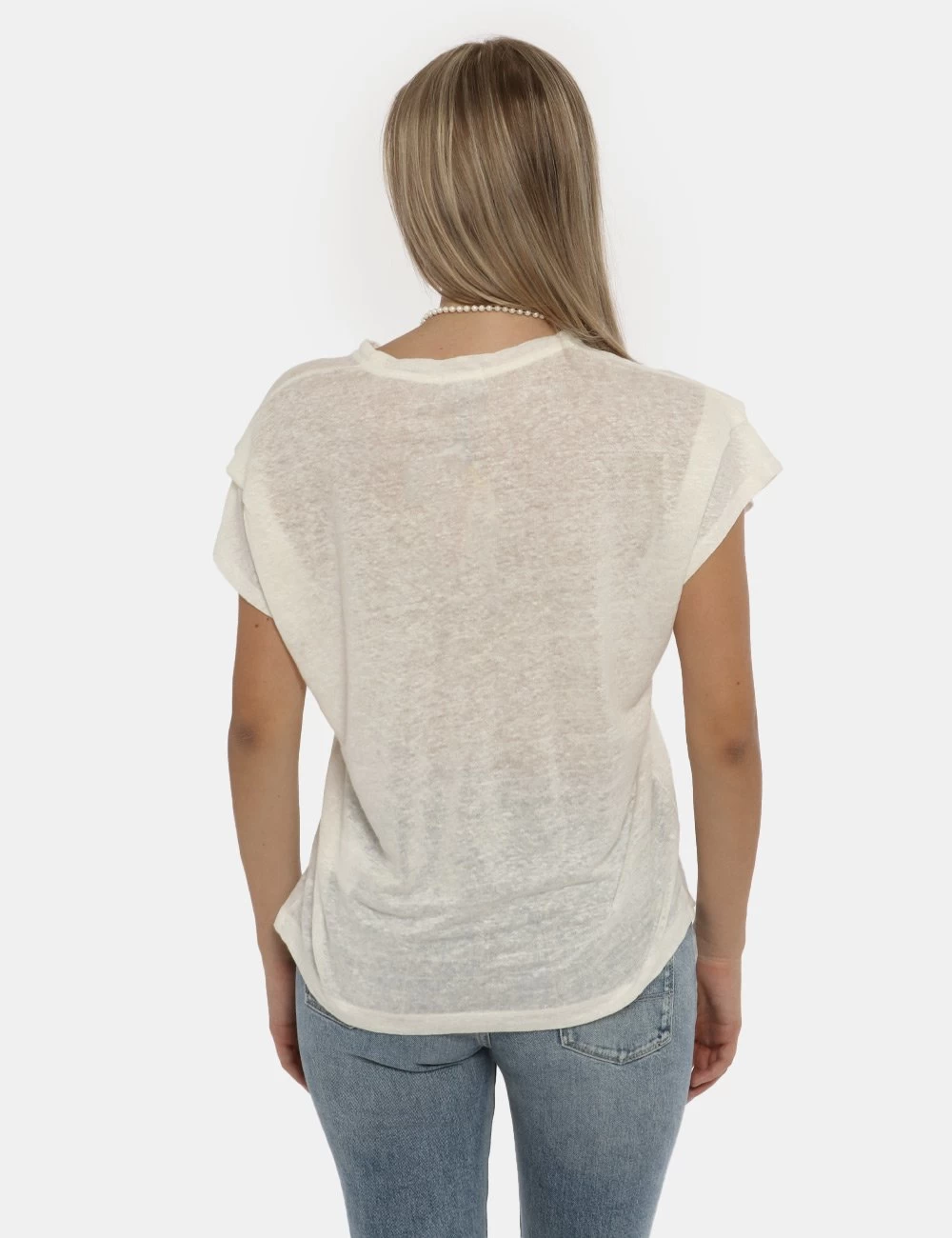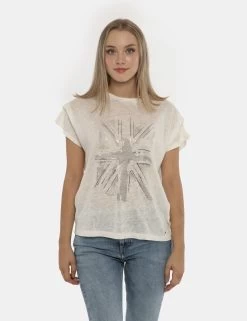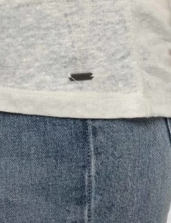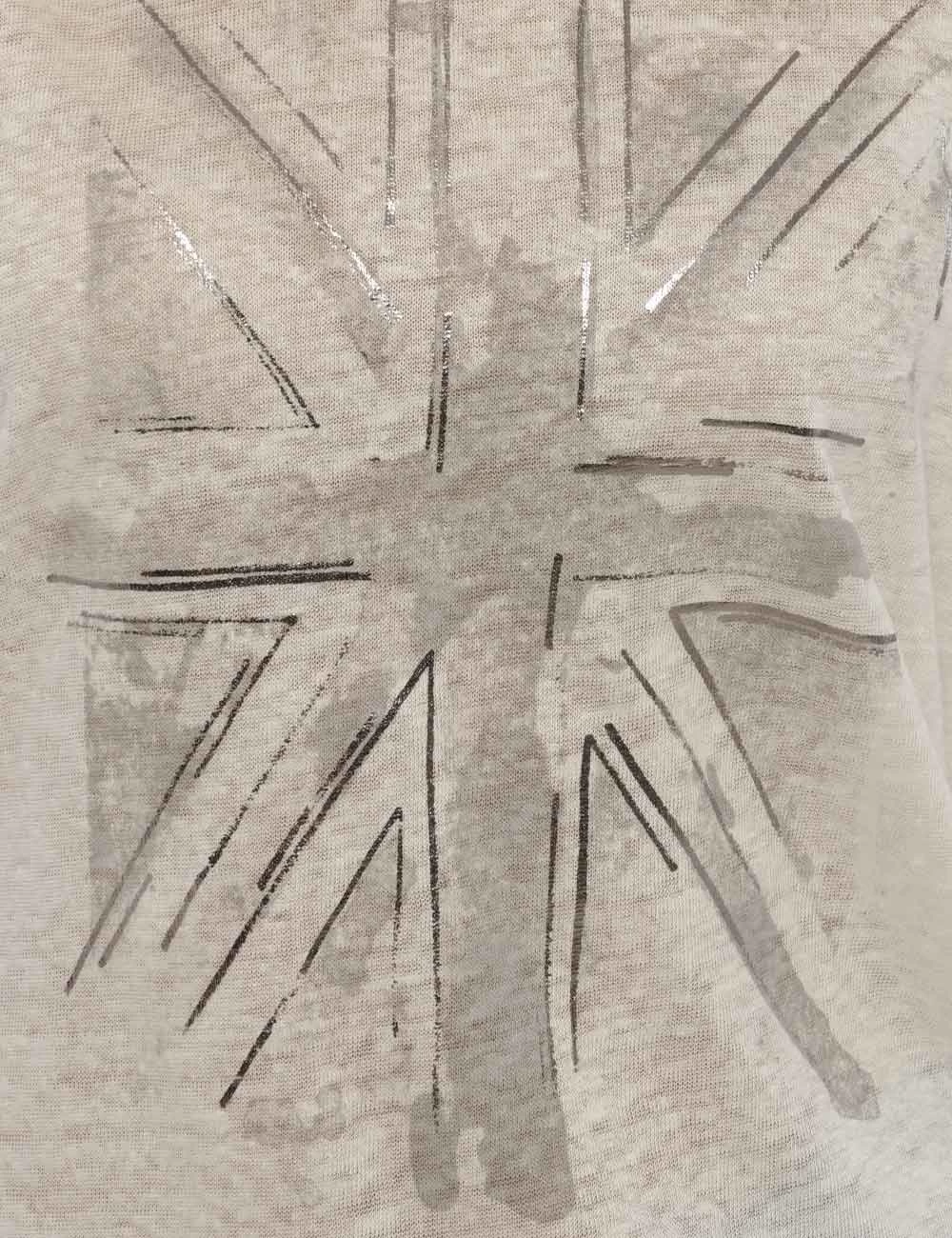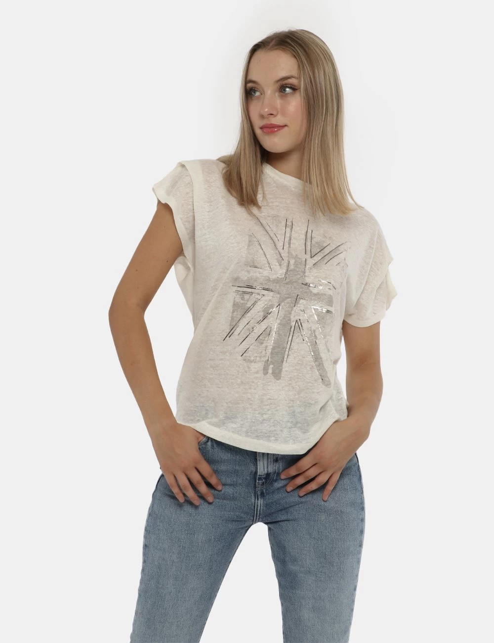T-shirt in lino in total bianco con stampa in grigio chiaro e argento. La vestibilità è morbida e regolare. La t-shirt è adatta per occasioni casual facilmente combinabile per outfit diurni e serali. Un capo così non può mancare nel tuo guardaroba.