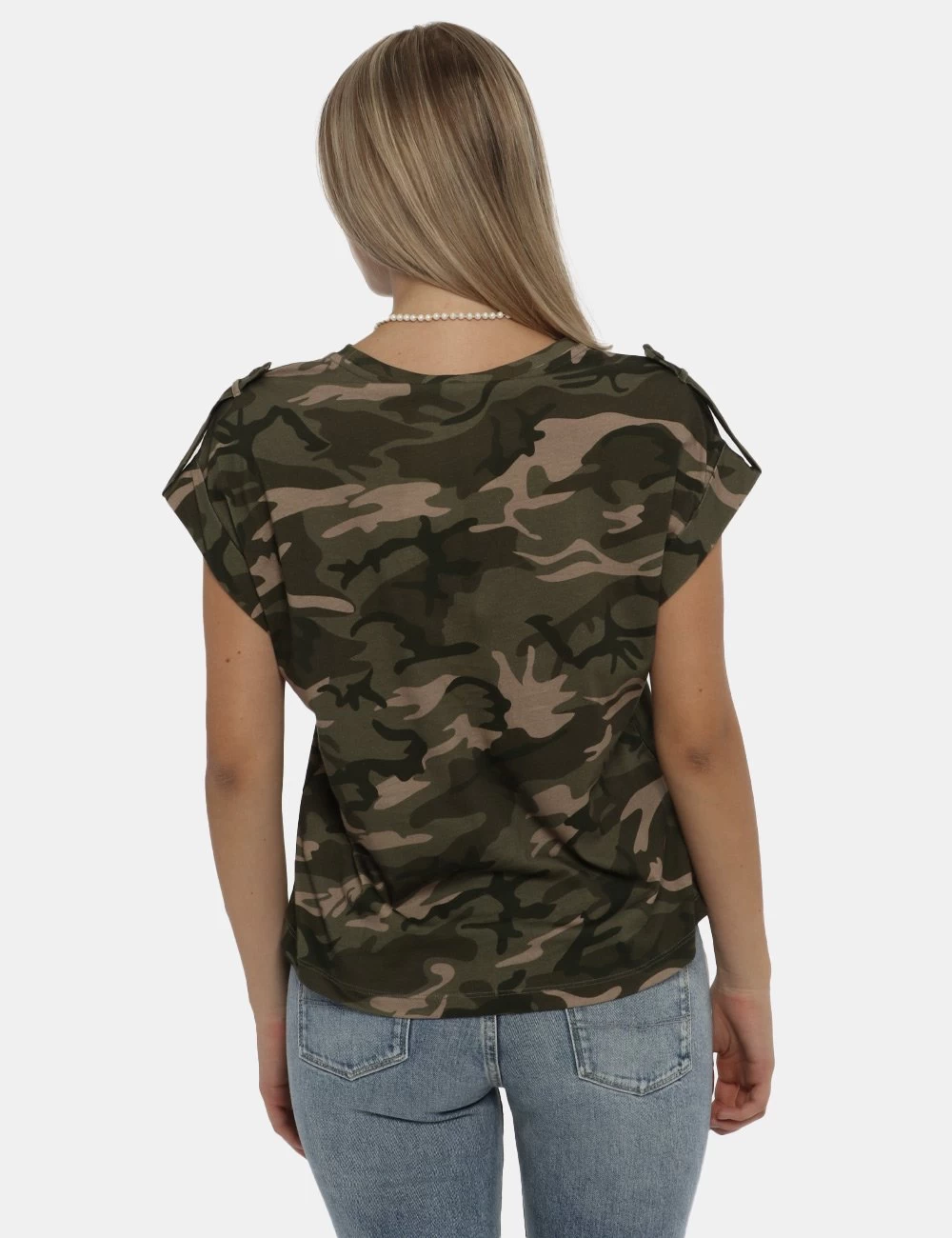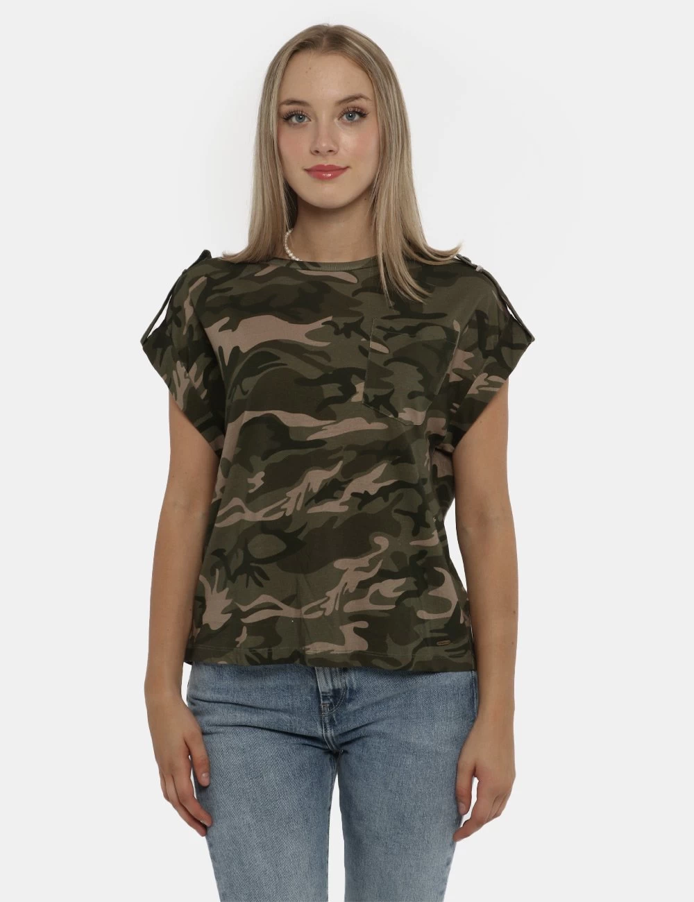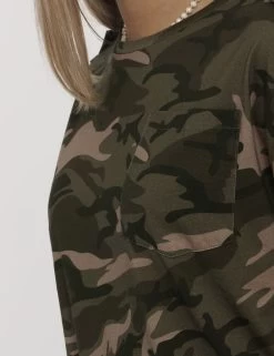 T-shirt su sfondo mimetico con taschino a toppa in tinta e risvoltino sulle maniche corte. La vestibilità è morbida e regolare. La t-shirt è adatta per occasioni casual/sportive facilmente combinabile per outfit diurni e serali. Un capo così non può mancare nel tuo guardaroba