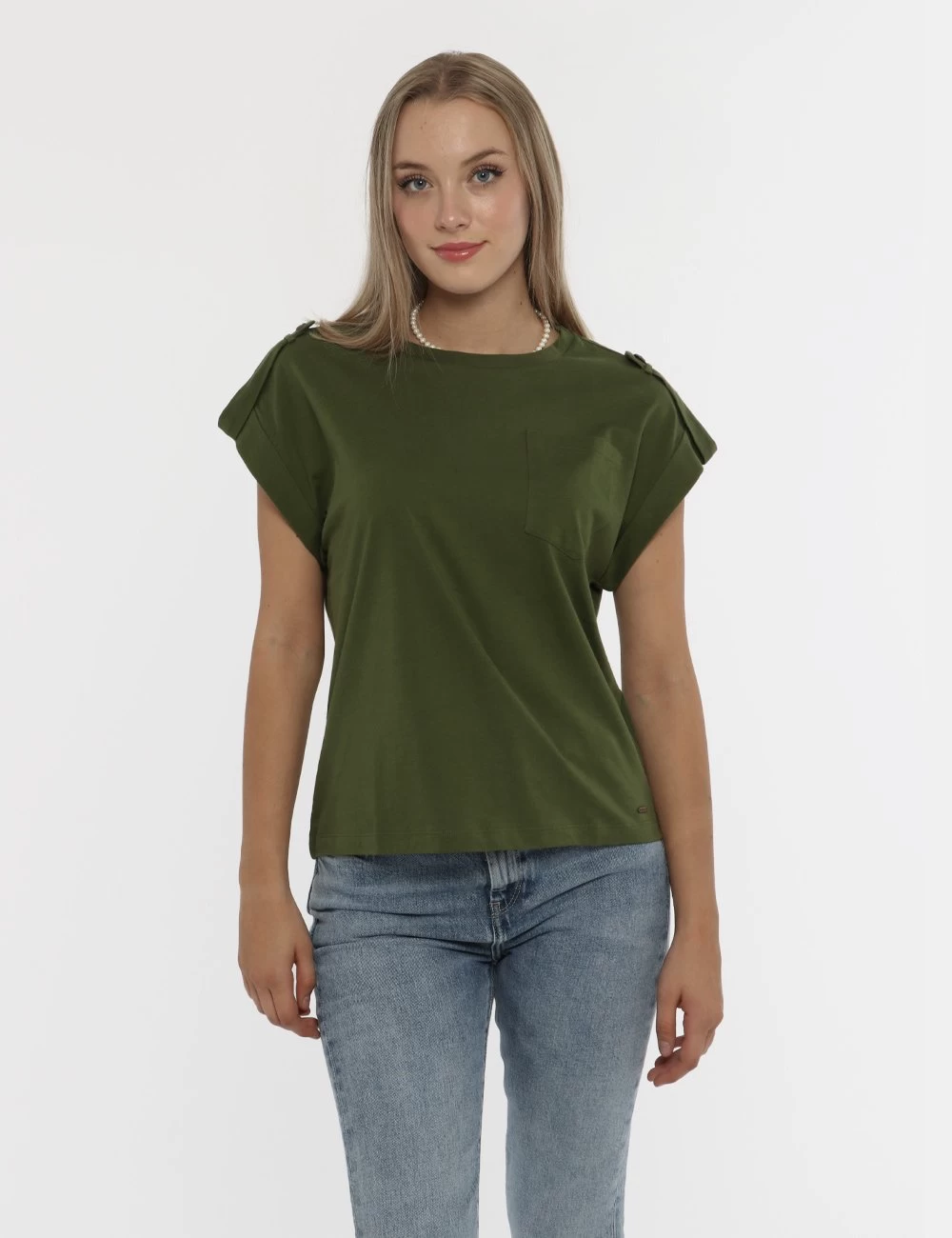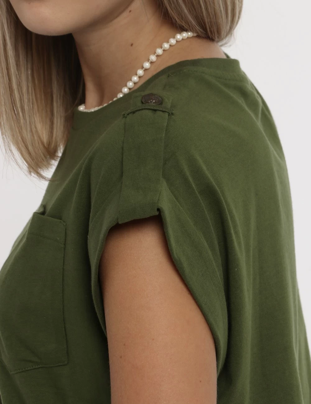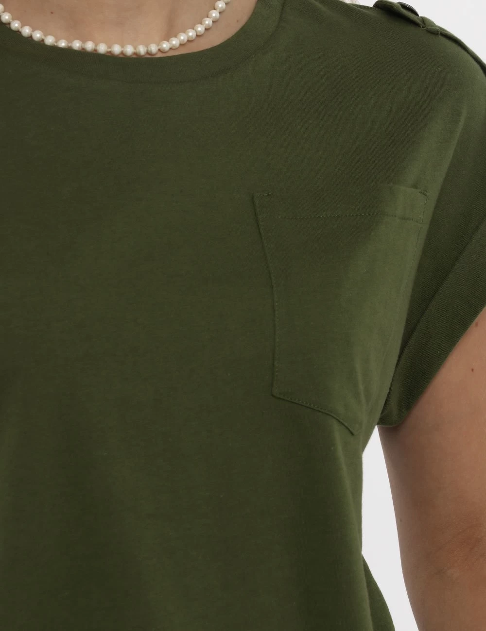 T-shirt in total verde militare con taschino a toppa ad altezza cuore e risvoltino sul giromanica. La vestibilità è morbida e regolare. La t-shirt è adatta per occasioni casual/sportive facilmente combinabile per outfit diurni e serali. Un capo così non può mancare nel tuo guardaroba.