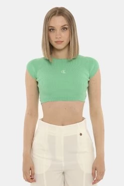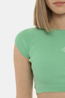 Top in maglina corto in total verde brillante con logo brand bianco. Ulteriore dettaglio è rappresentato da schiena semi-scoperta e laccio in tinta. La vestibilità è morbida e regolare. Il top è adatto per occasioni casual. Il tuo prossimo articolo nei prodotti salvati.