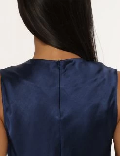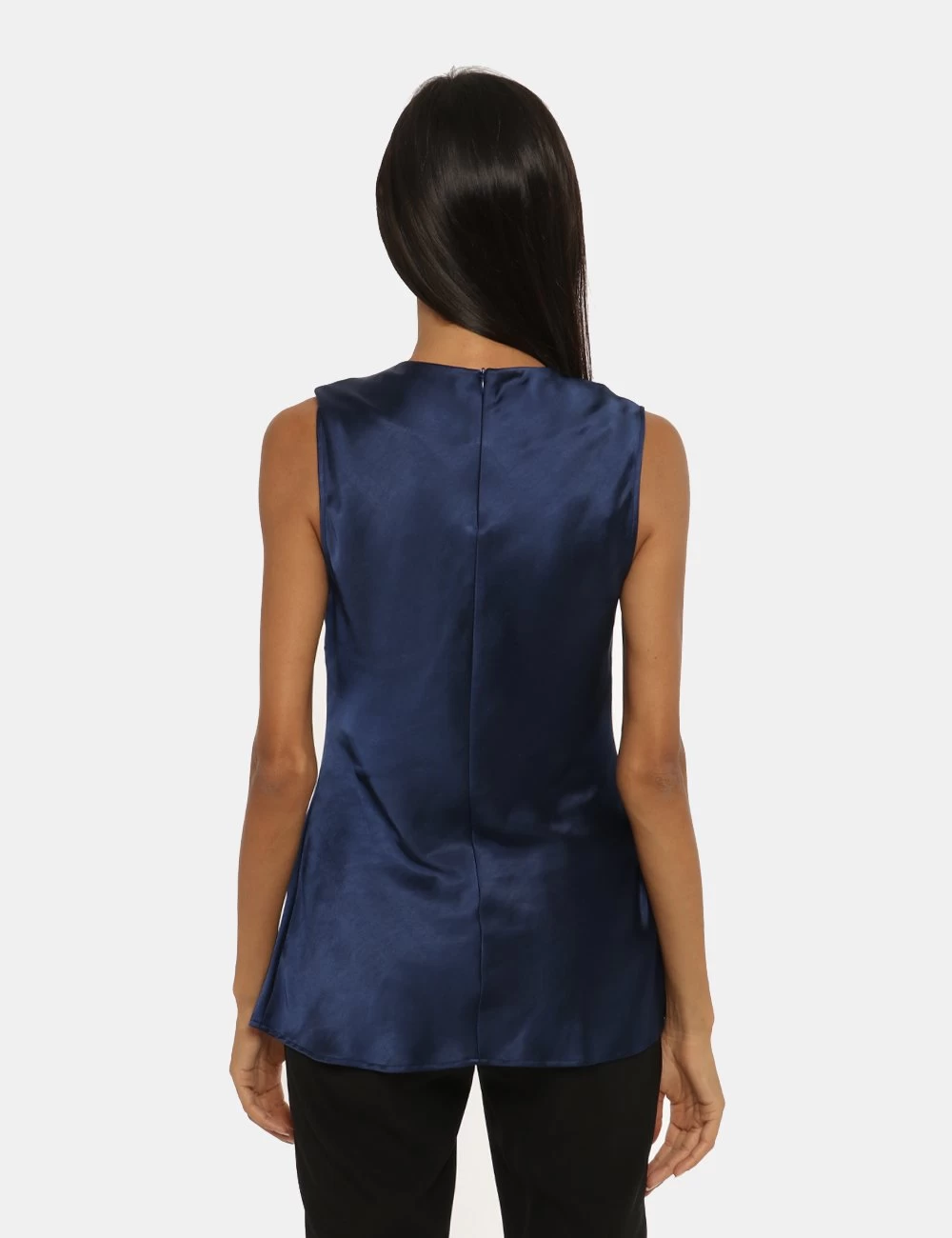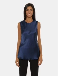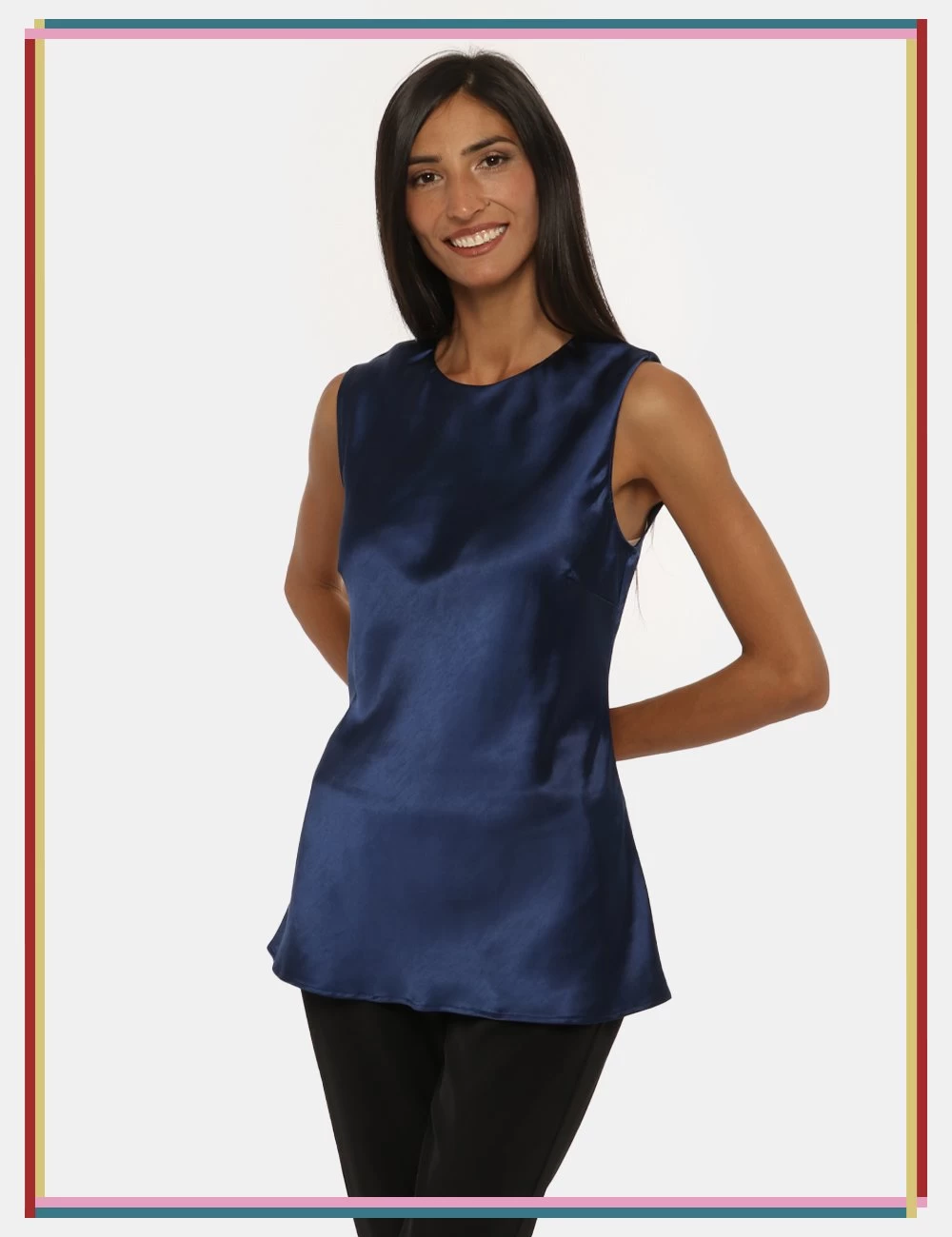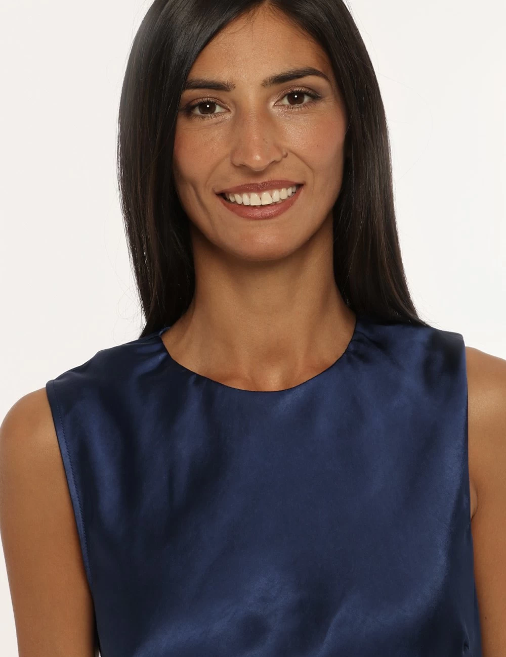 Top smanicato lungo in total blu notte lucido. La vestibilità è morbida e regolare con pratica zip sul retro. Il top è adatto per occasioni casual/raffinate e facilmente combinabile per occasioni diurni e serali. Questo capo merita un’occasione speciale.