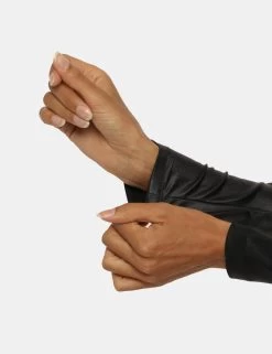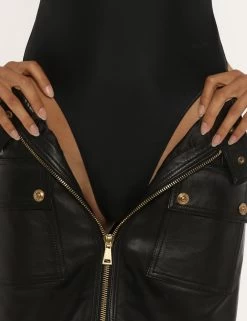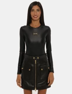 Body a maniche lunghe in total nero lucido con patch logo brand dorato. La vestibilità è morbida e pratica grazie a bottoni automatici sul cavallo. Il body è adatto per occasioni casual/raffinate e facilmente combinabile per outfit diurni/serali. Aggiungilo al tuo guardaroba per spiccare con stile. L’articolo appartiene al campionario esclusivo di stagione: pezzo unico.