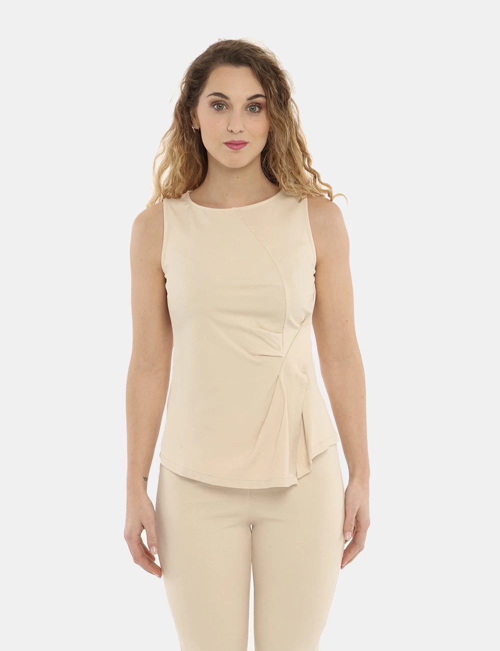 Top classico total beige con spalla larga e a giromanica. Il capo si presenta con piccolo spacchetto sul fronte dovuto ad una cucitura del tessuto con arricciatura. La vestibilità è morbida e pratica grazie ad unico bottone ad asola sul retro. Il top è ideale per occasioni casual e facilmente combinabile per outfit diurni e serali. Inseriscilo nel carrello per spiccare con stile.