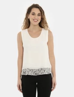 Top elegante total white con spallina larga e a giromanica e con banda ricamata applicata nella parte inferiore. La vestibilità è morbida. Il capo è adatto per occasioni casual/raffinate e facilmente combinabile per outifit diurni e serali. Eleganza e semplicità racchiuse in un top.