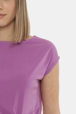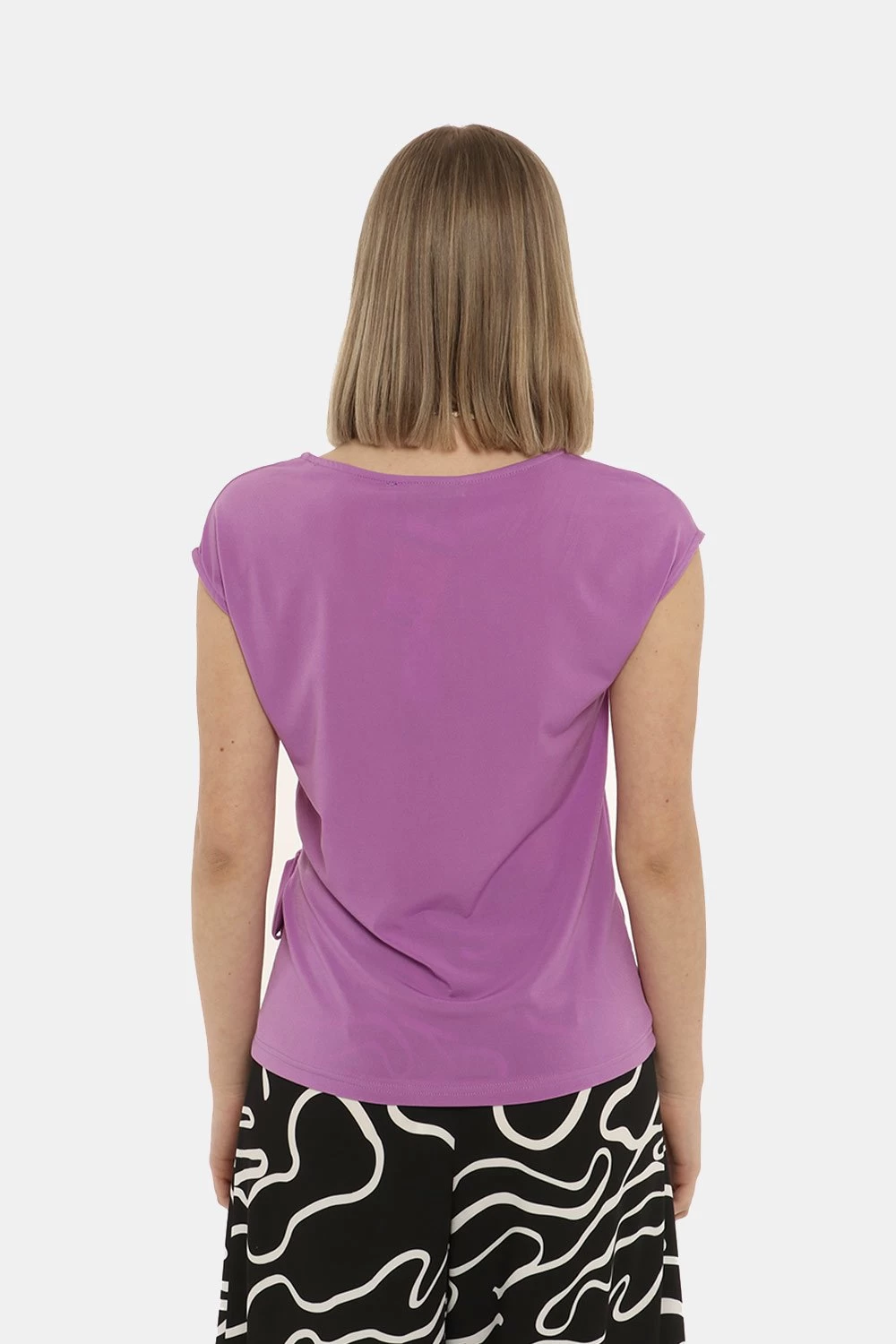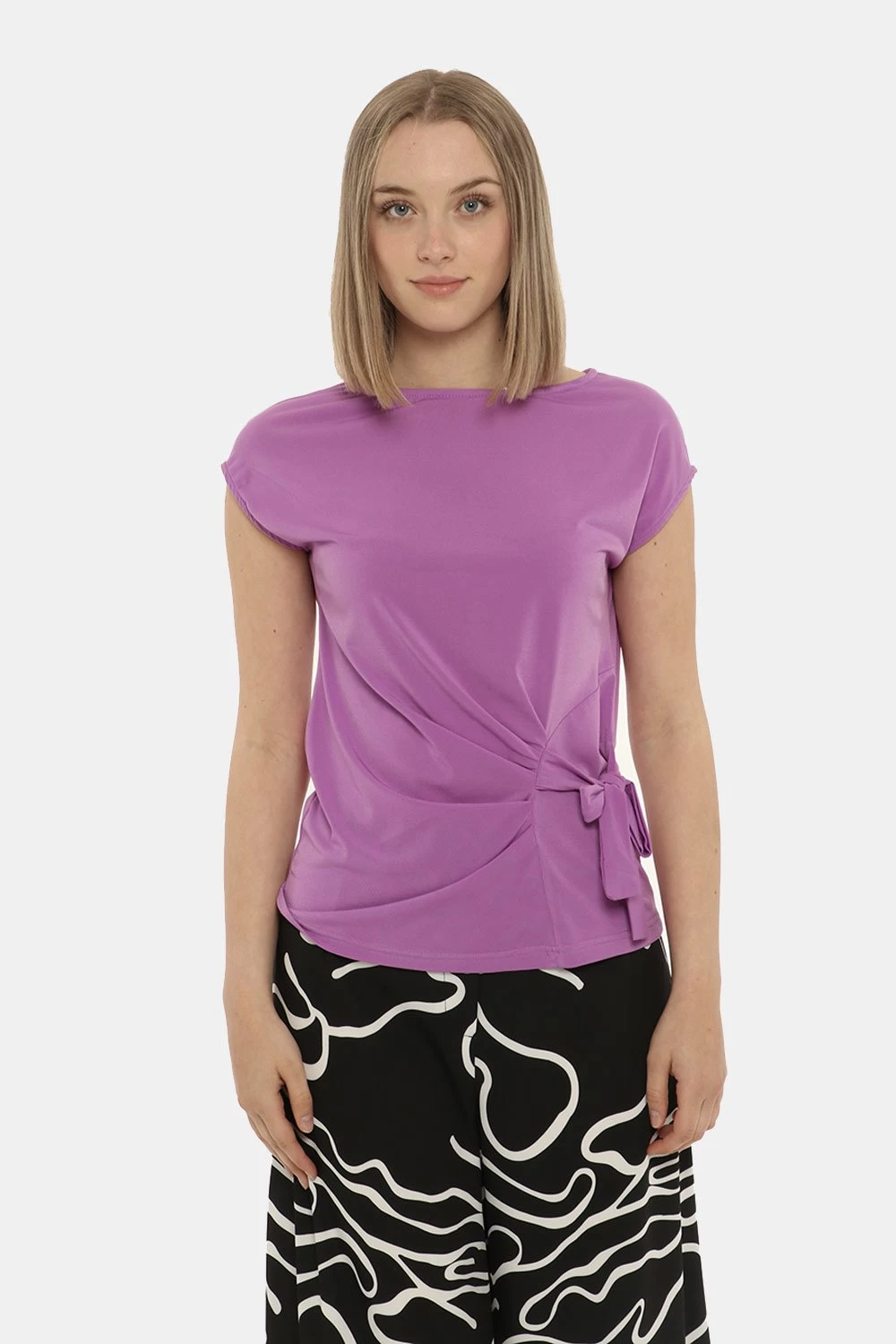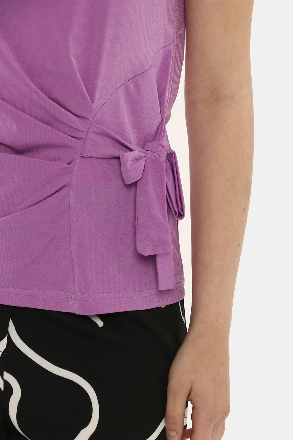 Top in total viola ciclamino a giromanica. Presente arricciatura e laccio in tonalità coordinata. Il capo è adatto per occasioni casual/raffinate e facilmente combinabile per outfit diurni e serali. Fortemente professionale piacevolmente chic.