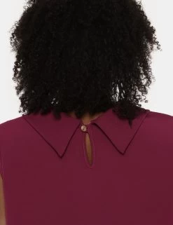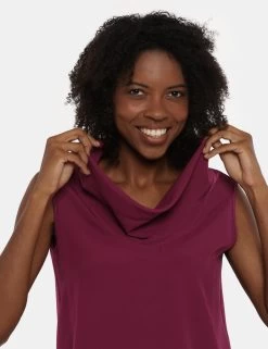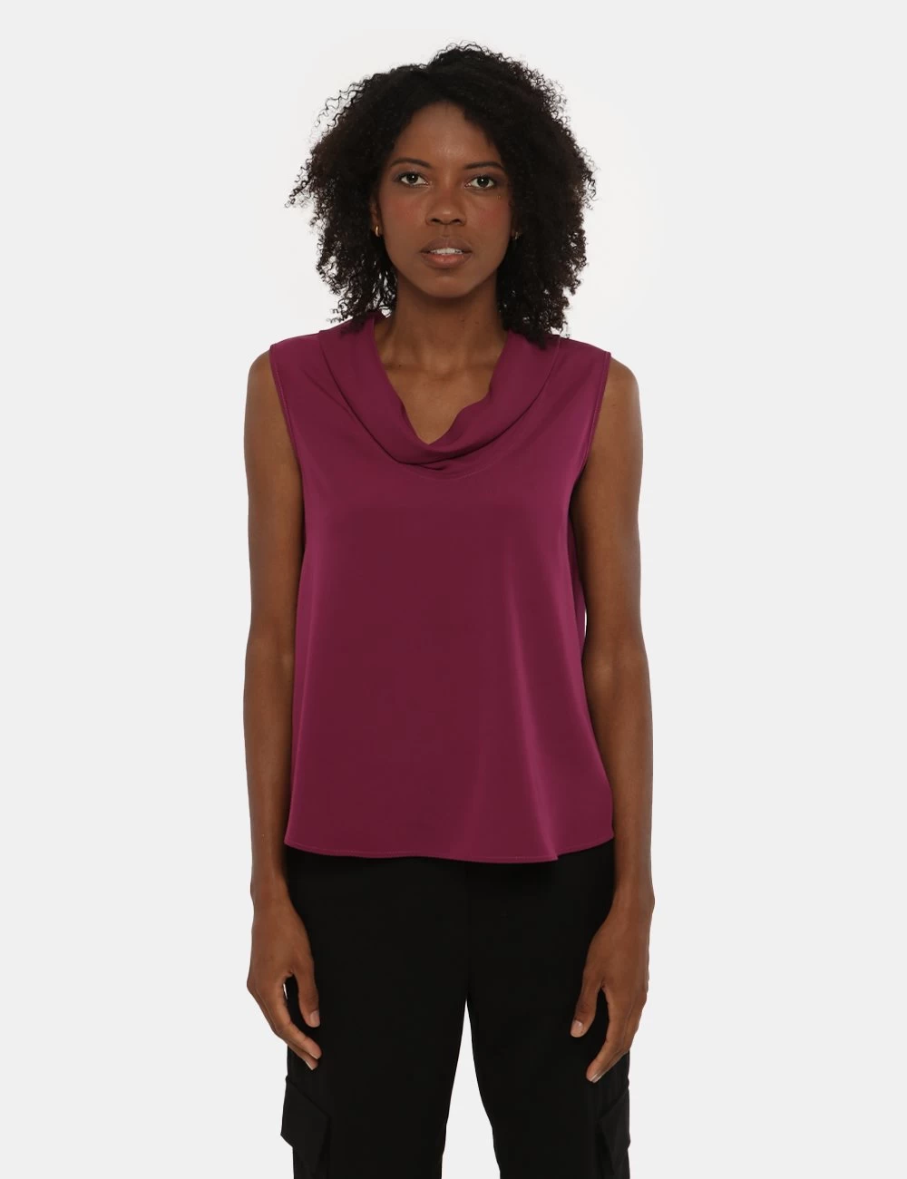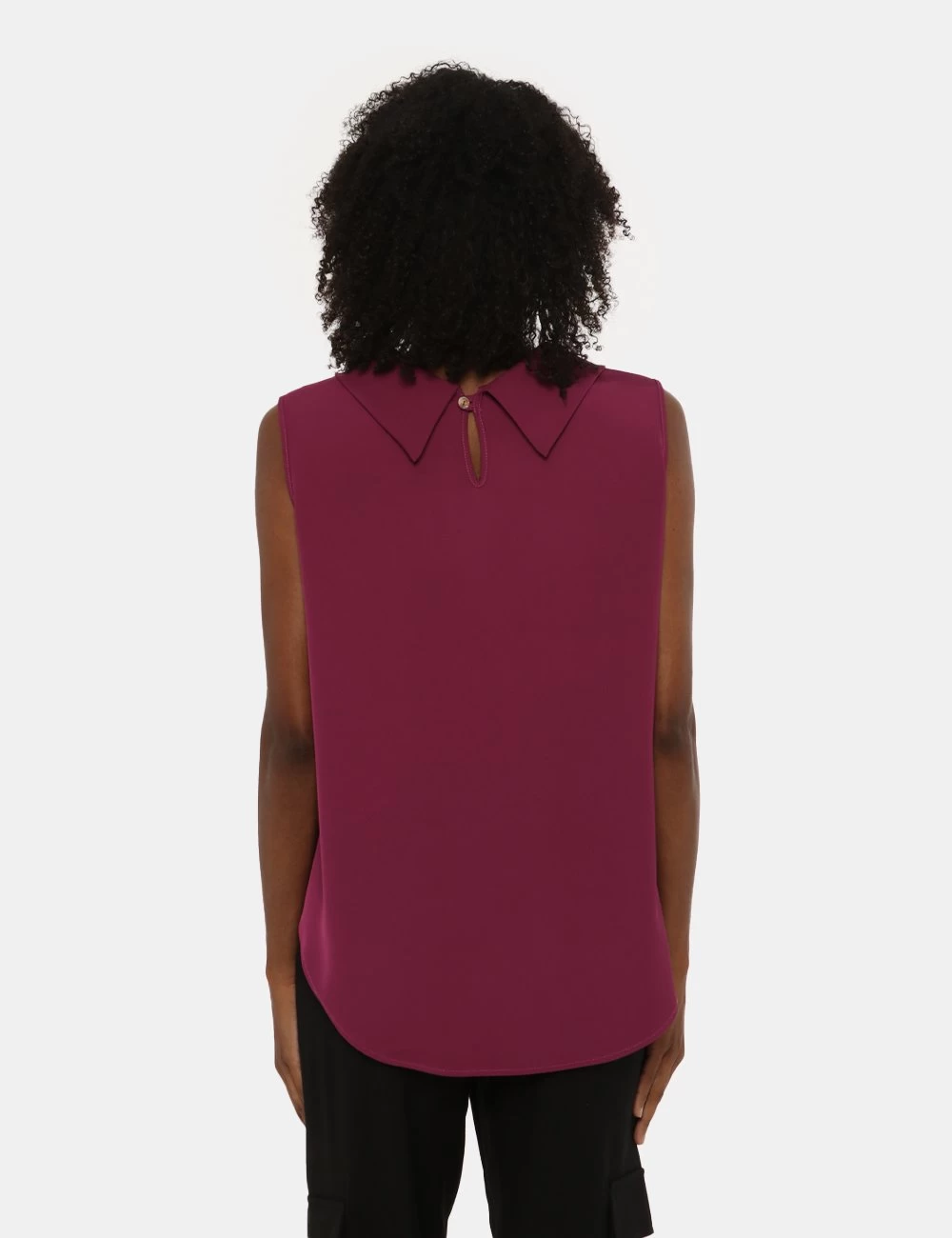 Top smanicato in total viola prugna. La particolarità è nel collo largo e morbido più piccola bottone ad asola sul retro che permette una vestibilità pratica. Il top è adatta per occasioni casual e raffinate ed è perfettamemte combinabile con un blazer in tinta coordinata. Fashion addicted. L’articolo appartiene al campionario esclusivo di stagione: pezzo unico.
