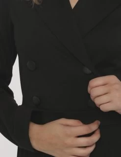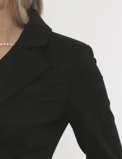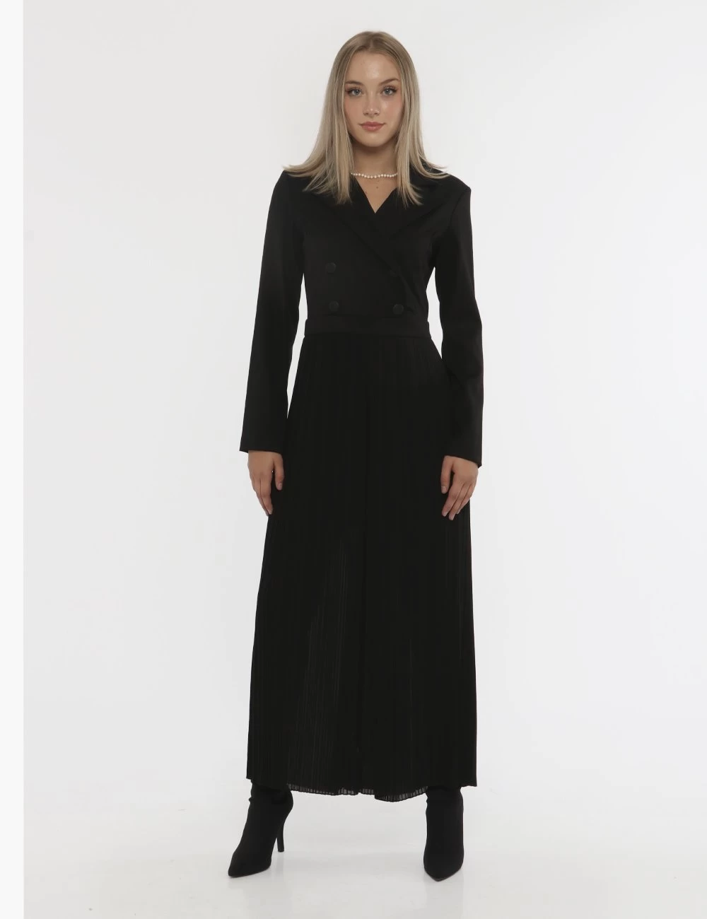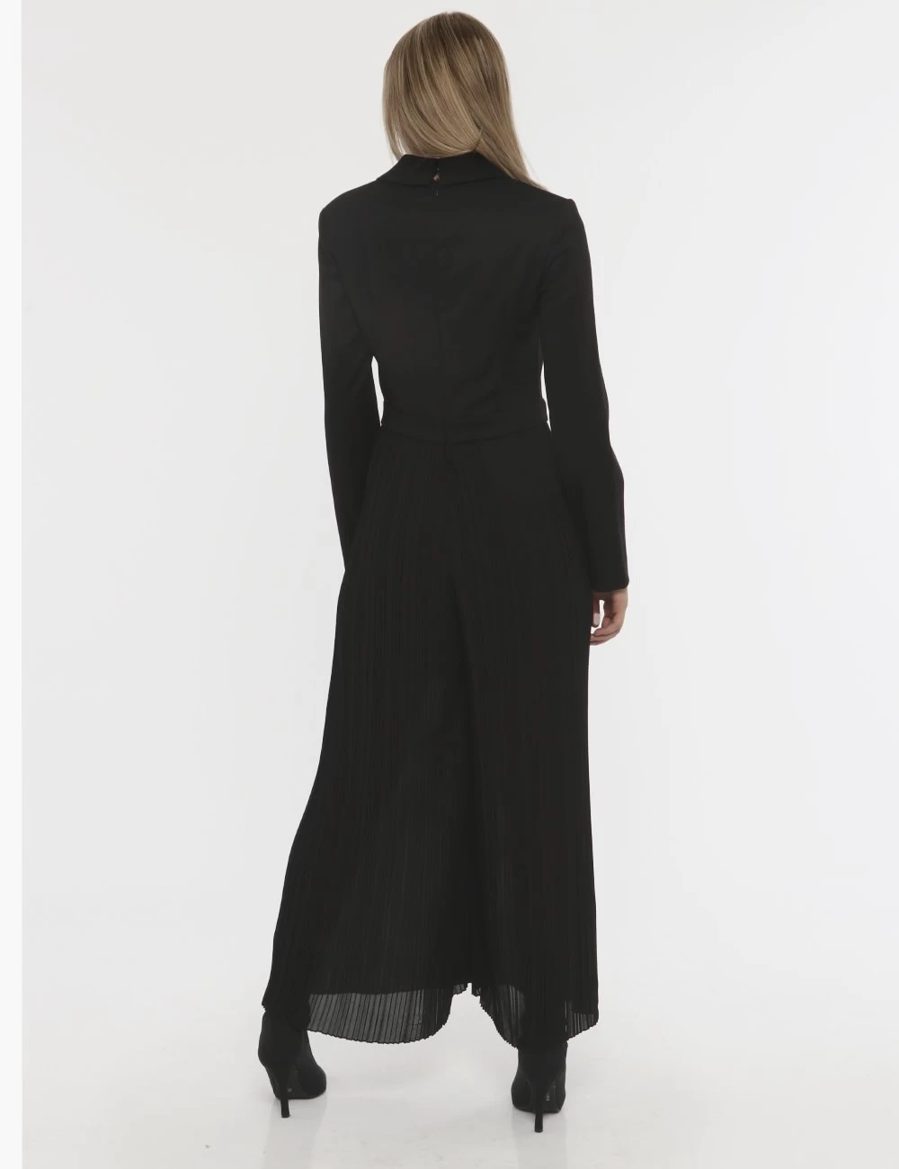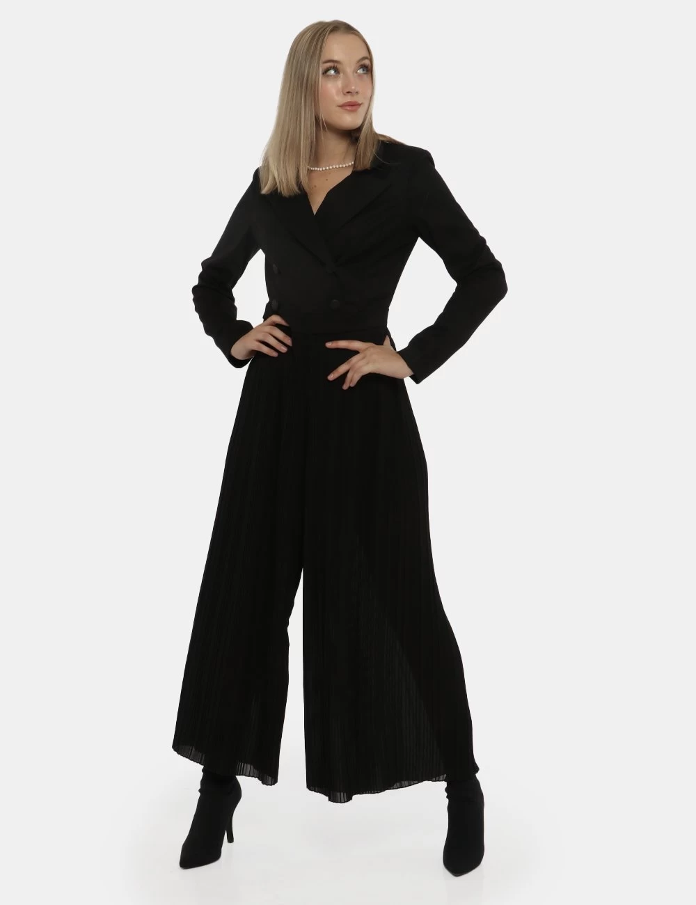 Tuta in total nero con pantaloni larghi e plissettati e con simil giacca in doppio petto. La vestibilità è morbida e pratica grazie a zip sul retro. La tuta è adatta per occasioni raffinate. Fashio addicted.