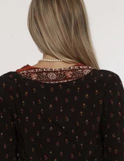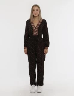 Tuta a maniche lunghe con scollo a V su base marrone scuro con stampa allover fiorellini in giallo e arancione. La vestibilità è morbida e pratica grazie ad arricciatura in girovita ed alcuni bottoni ad asola sul fronte. La tuta è adatta per occasioni casual. Praticità e stile in un solo caso.