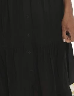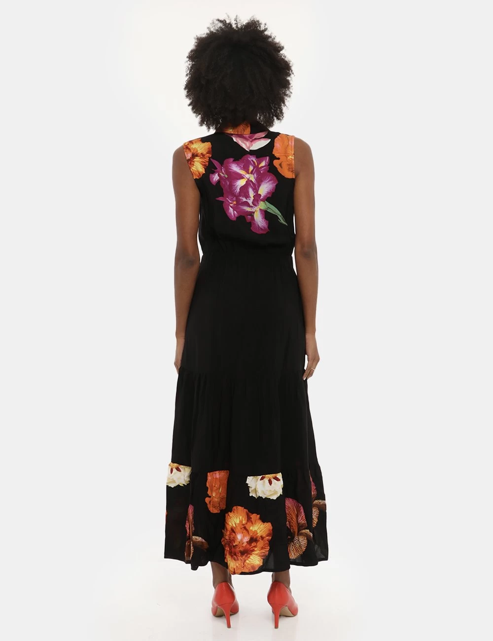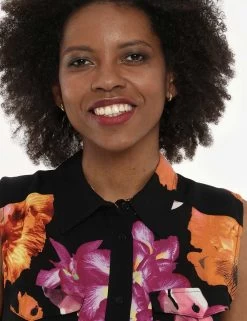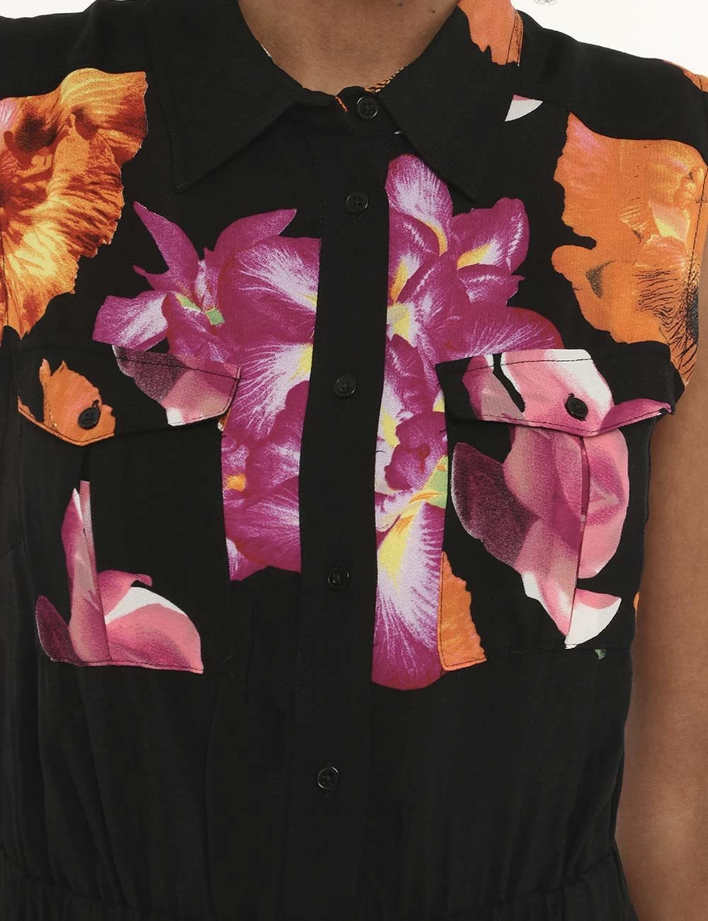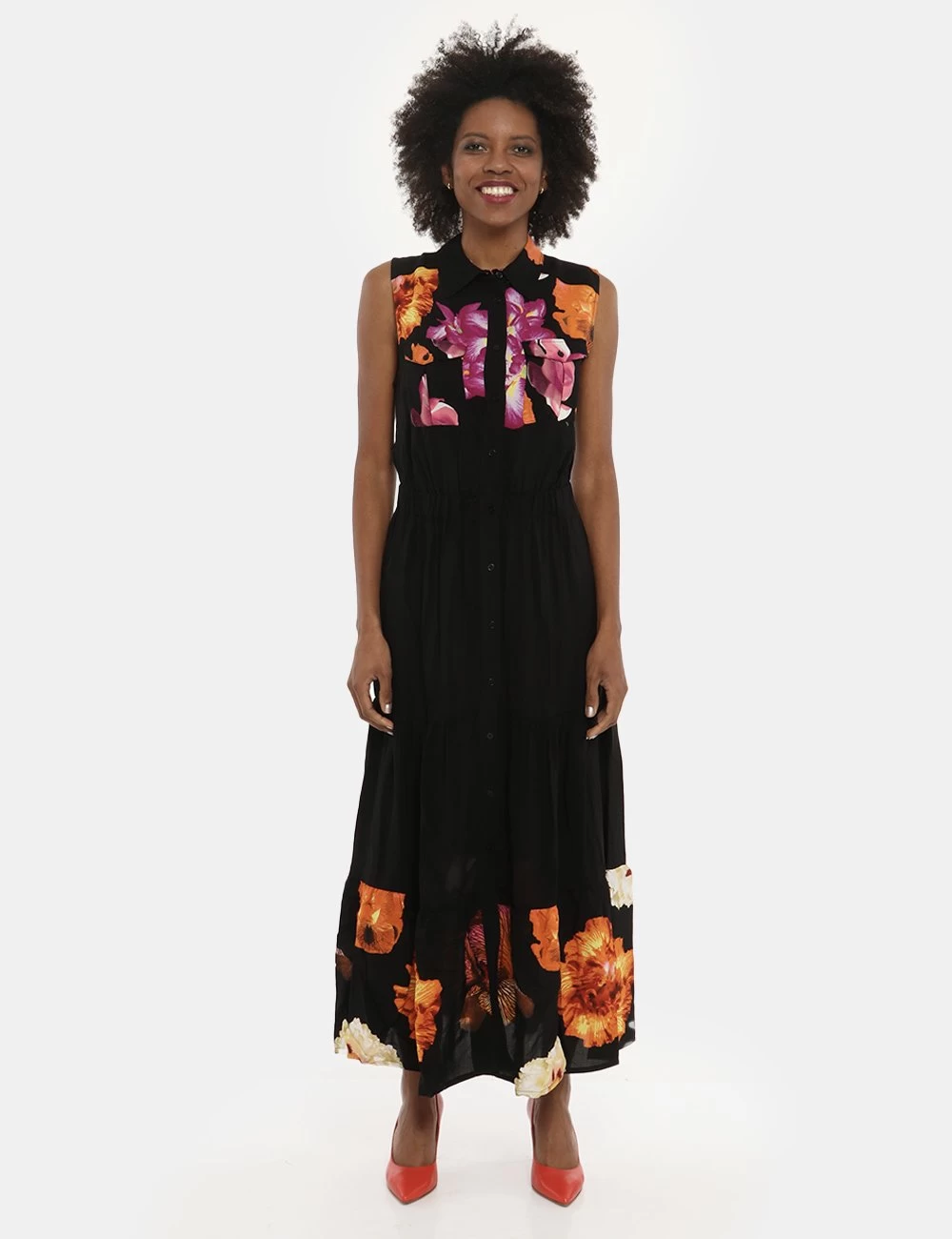 Abito lungo a giromanica con gonna svasata su sfondo nero. Presente stampa floreale in tinta fuxia e arancione più colletto alla peter pan e tasche a toppa con chiusura ad altezza giro-seno. La vestibilità è morbida e pratica grazie a bottoni ad asola neri lungo tutto il fronte. Il vestito è adatto per occasioni casual e facilmente combinabile per outfit diurni e serali. Inseriscilo nel carrello se vuoi dare luce al tuo guardaroba.
