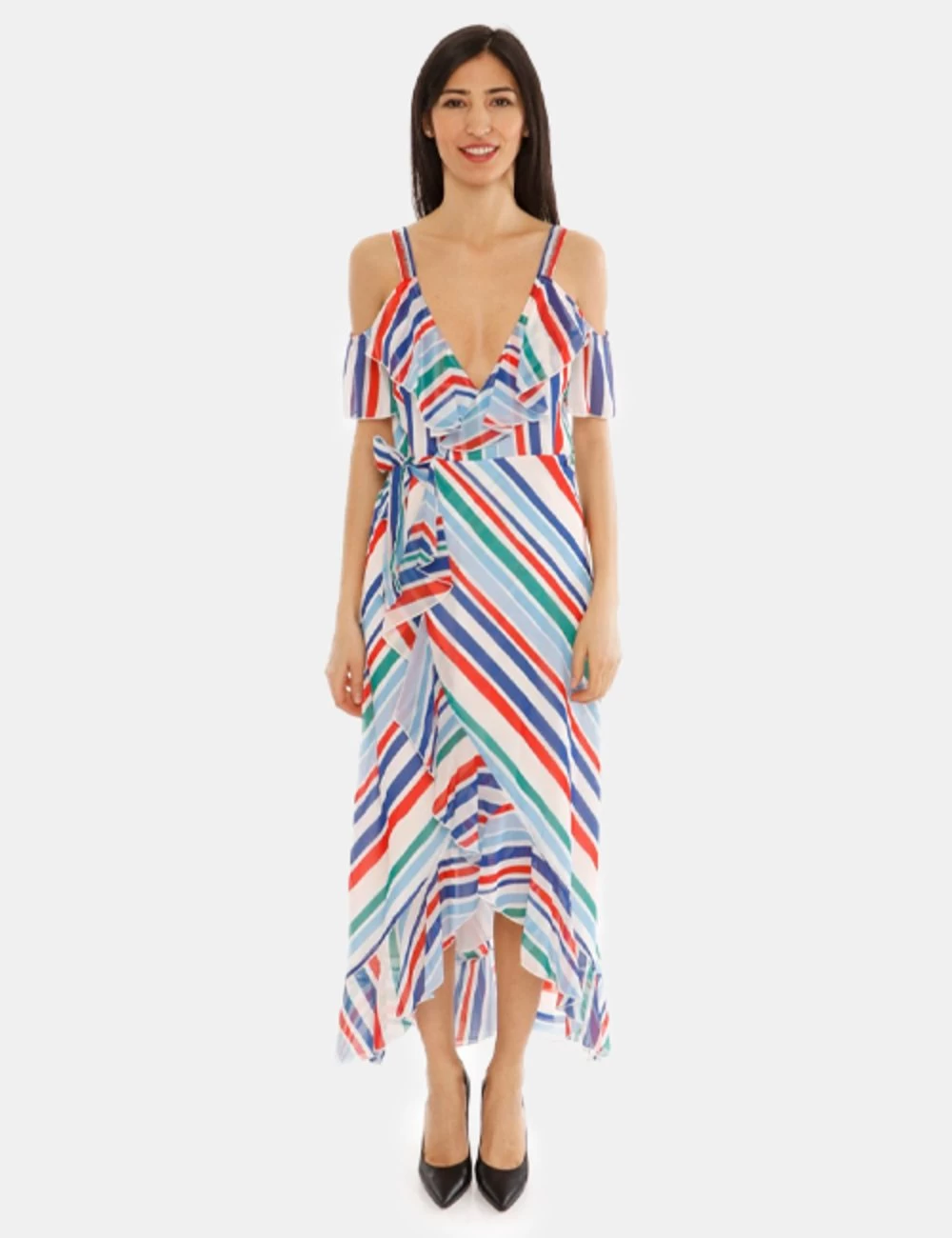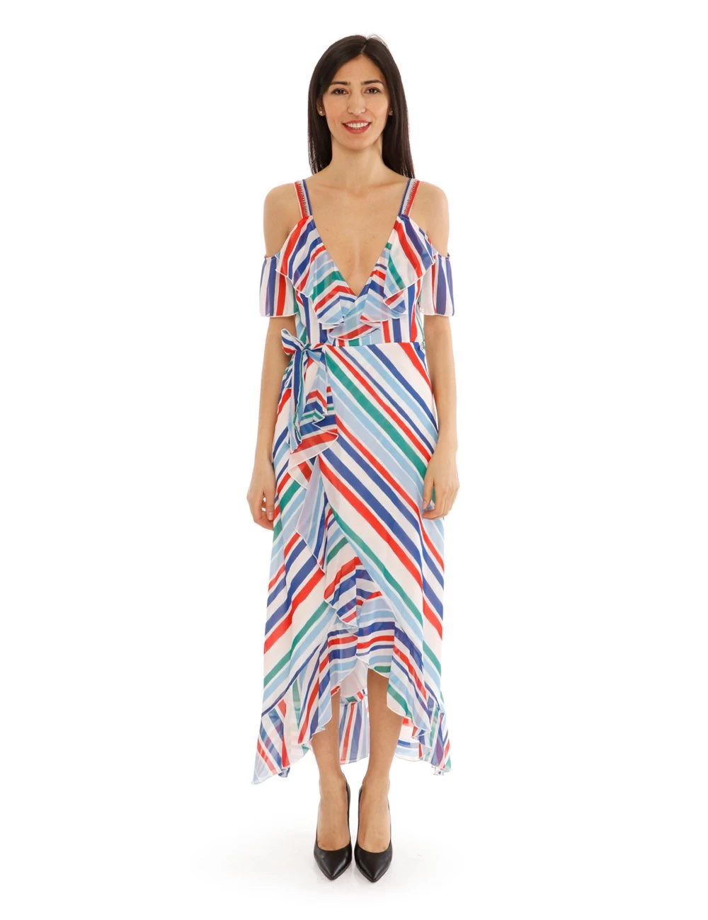 Un abito festoso con maniche ricadenti e allacciatura con nodo! Abbina questo vestito a un paio di scarpe colorate per un look vivace davvero primaverile!