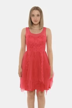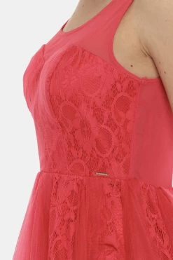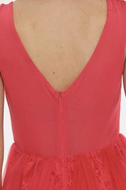 Vestito in total rosso corallo con alternanza di tessuto in simil raso tessuto ricamato e velo. Il capo si presenta con spalline e giropetto sagomato oltre gonna svasata. La vestibilità è morbida e regolare. L’abito è adatto per occasioni raffinate e facilmente combinabile per outfit serali. Tu più quest’abito l’abbinamento perfetto.