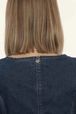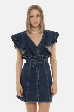 Vestito in total denim a giromanica con volant in tinta applicato. Il capo si presenta con profondo scollo a V e aperto sul fronte. La vestibilità è morbida e pratica grazie a serie di bottoni ad asola in tinta e regolabile grazie a cintura in tessuto denim. L’abito è adatto per occasioni casual. Basta un’occhiata per innamorartene.