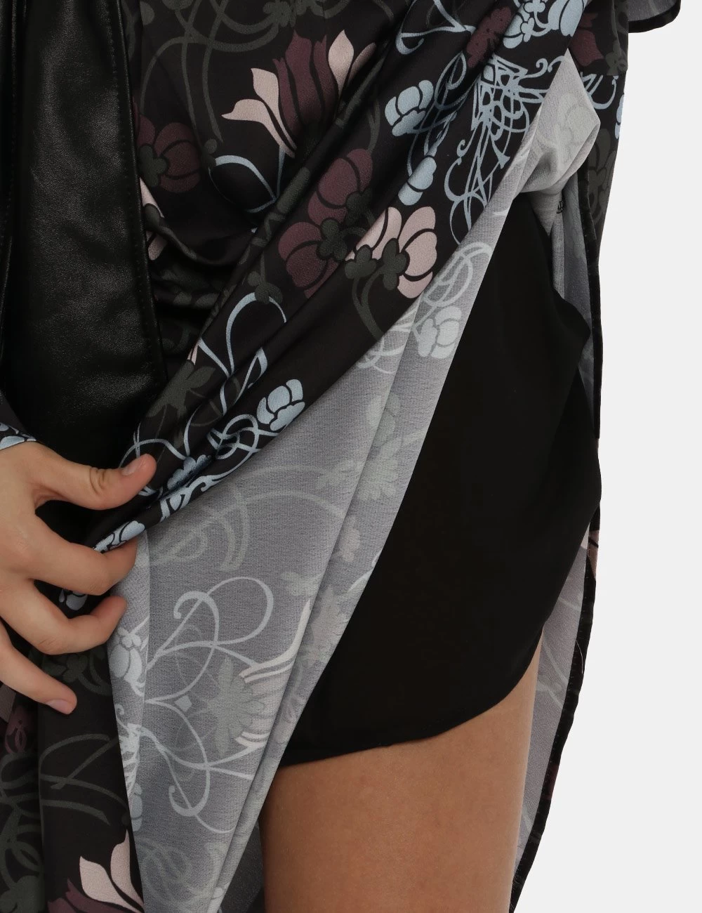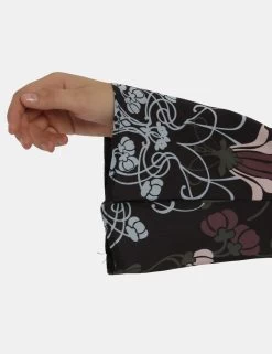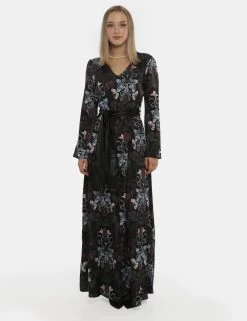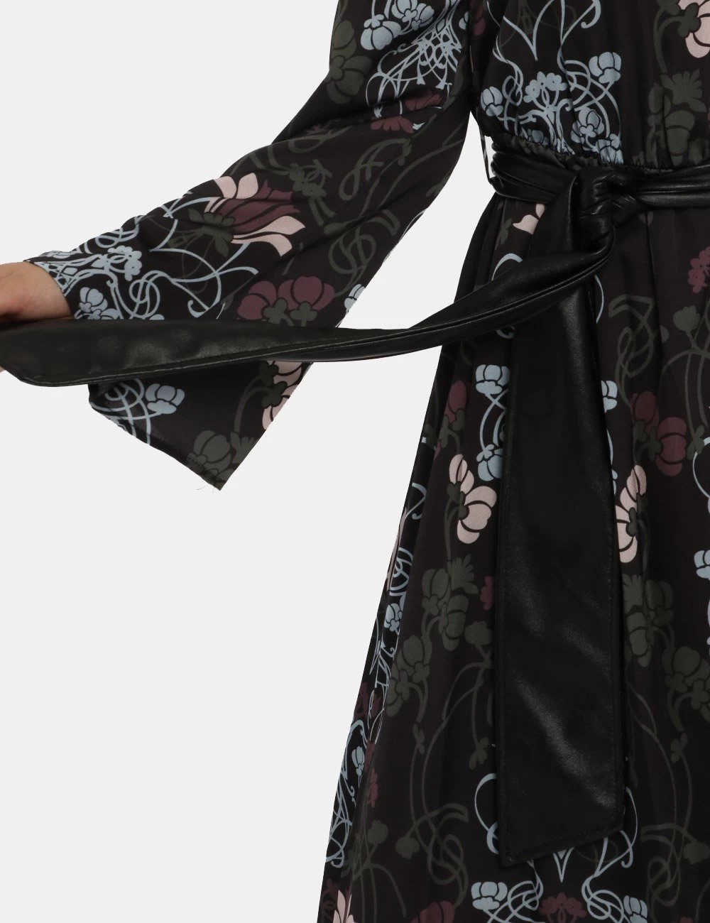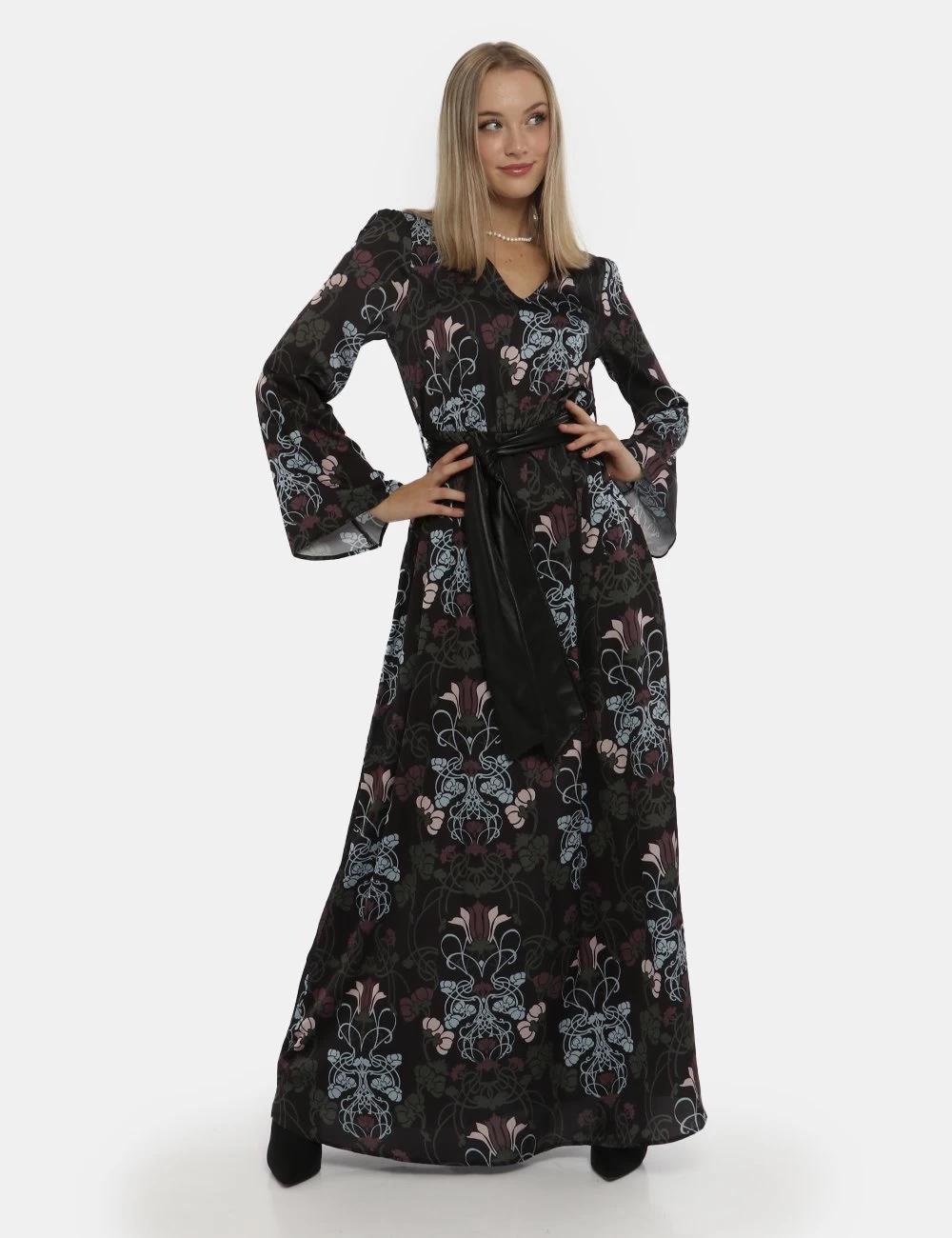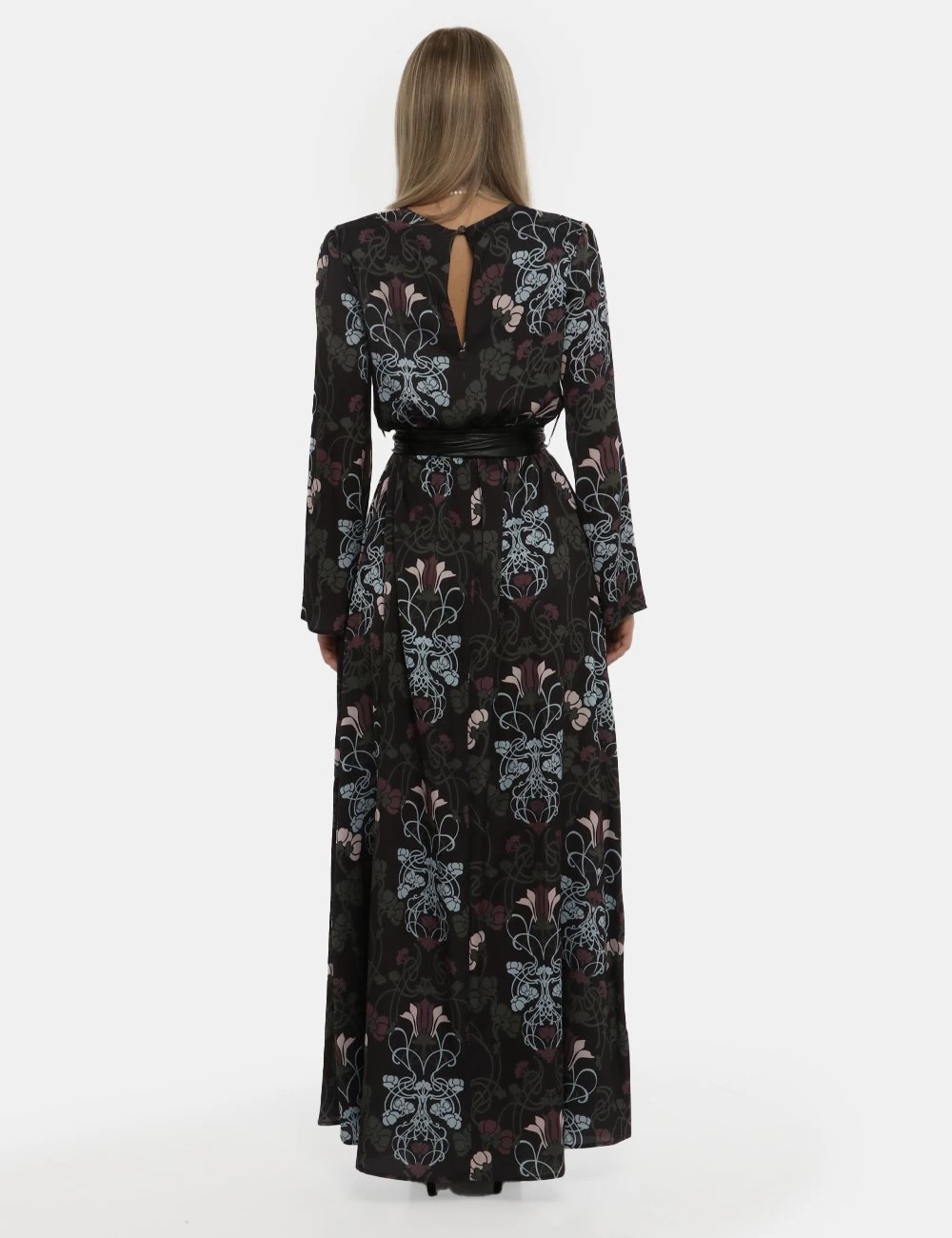Vestito lungo a maniche lunghe ampie su base nera con stampa allover floreale in bordeaux azzurro verde. Presente scollo a V.La vestibilità è morbida e regolabile grazie a cintura in simil pelle nera e bottone ad asola sulla schiena. Il vestito è ideale per occasioni casual/raffinate. Quest’abito merita un’occasione importante.