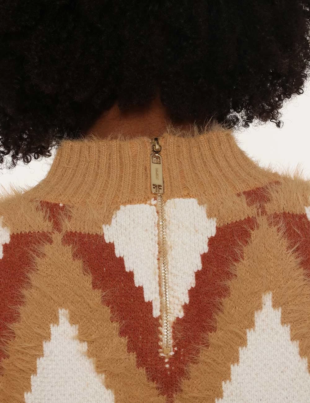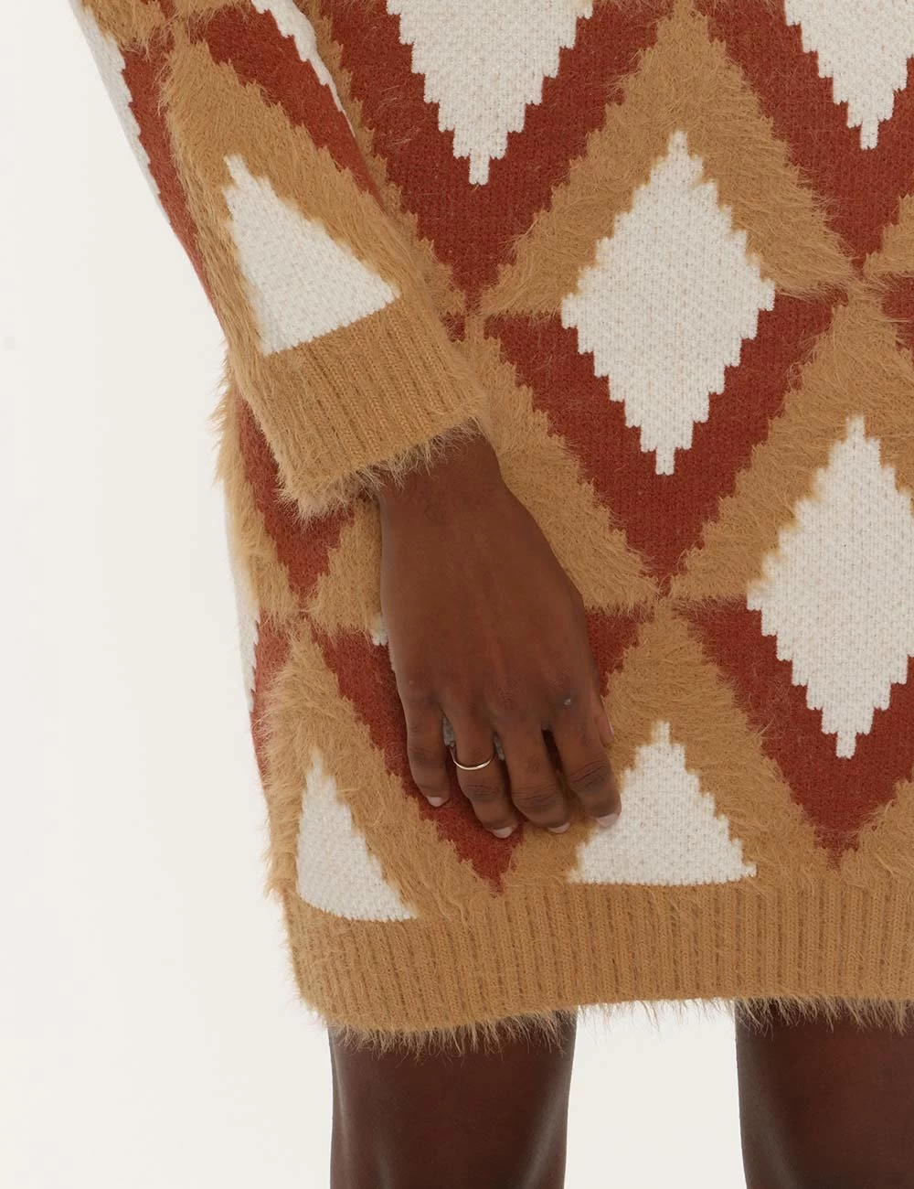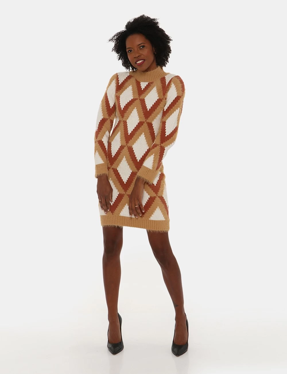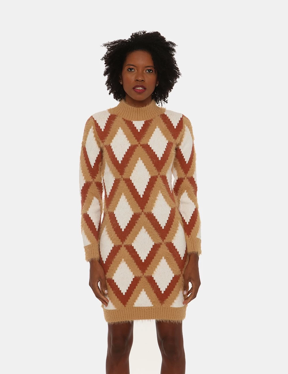 Abito in maglia con motivo geometrico sui toni della terra e bianco. Alterna maglia liscia a maglia con pelo. Chiusura posteriore con zip. Collo a lupetto. In maglia pesante morbida e dal taglio dritto sciancrato in vita. Per una rivisitazione moderna dei look in stile anni ’70 abbinalo ad uno stivaletto in vernice marrone e ad un cappotto panna. Effetto wow assicurato!