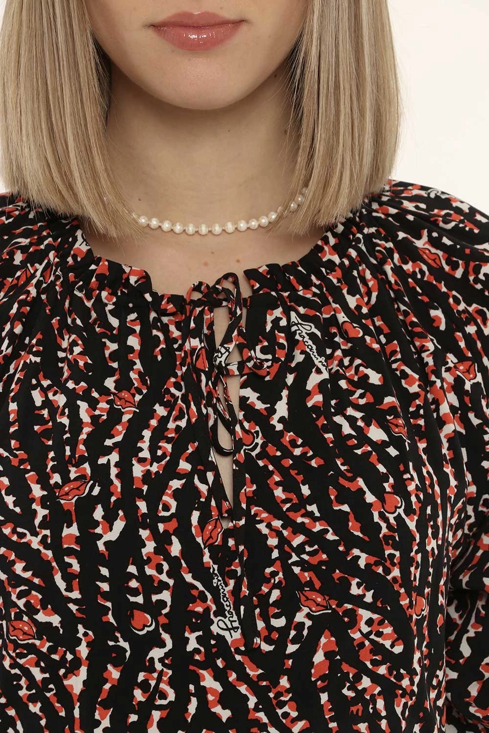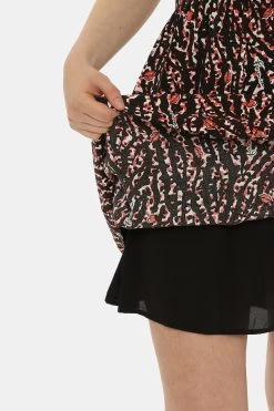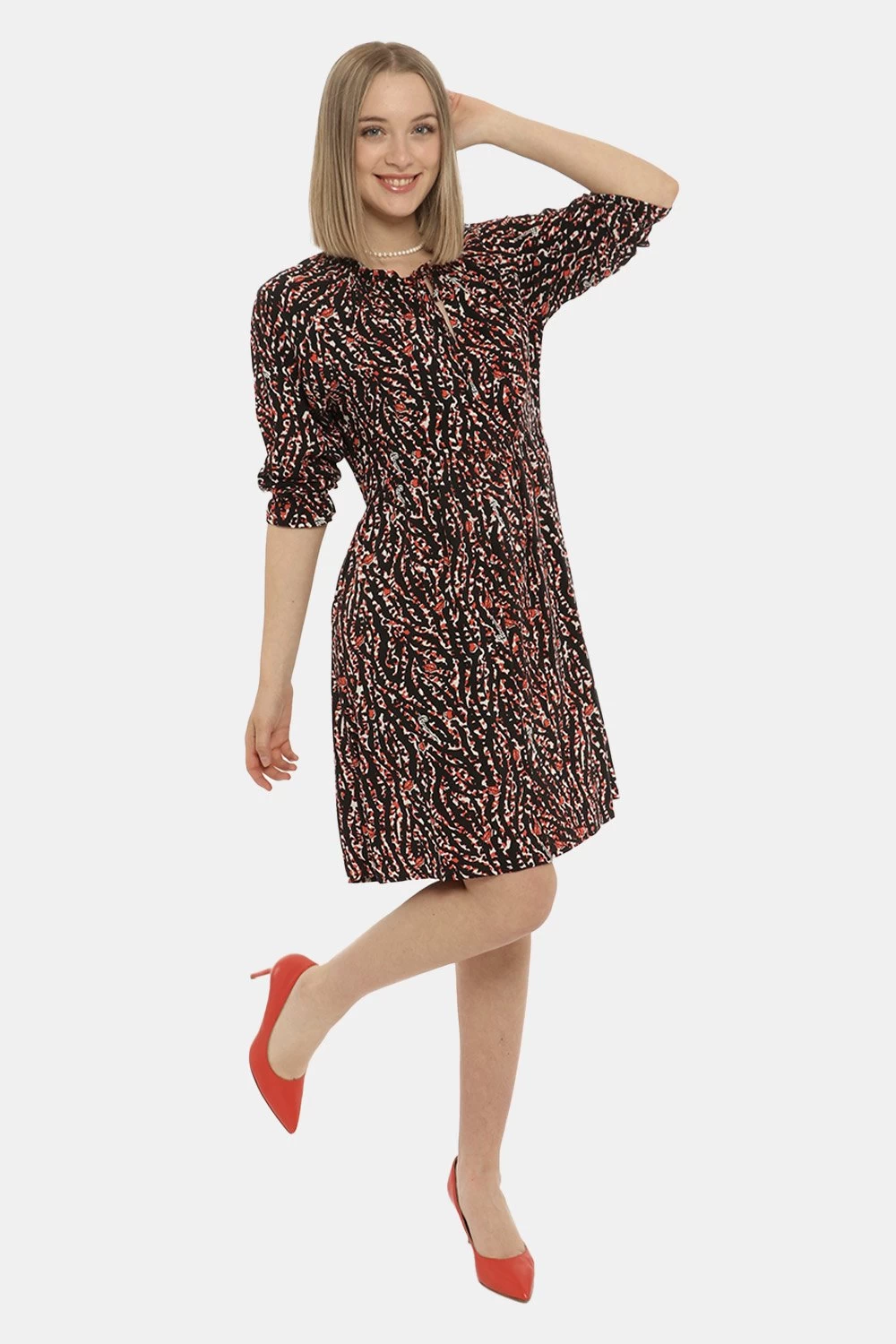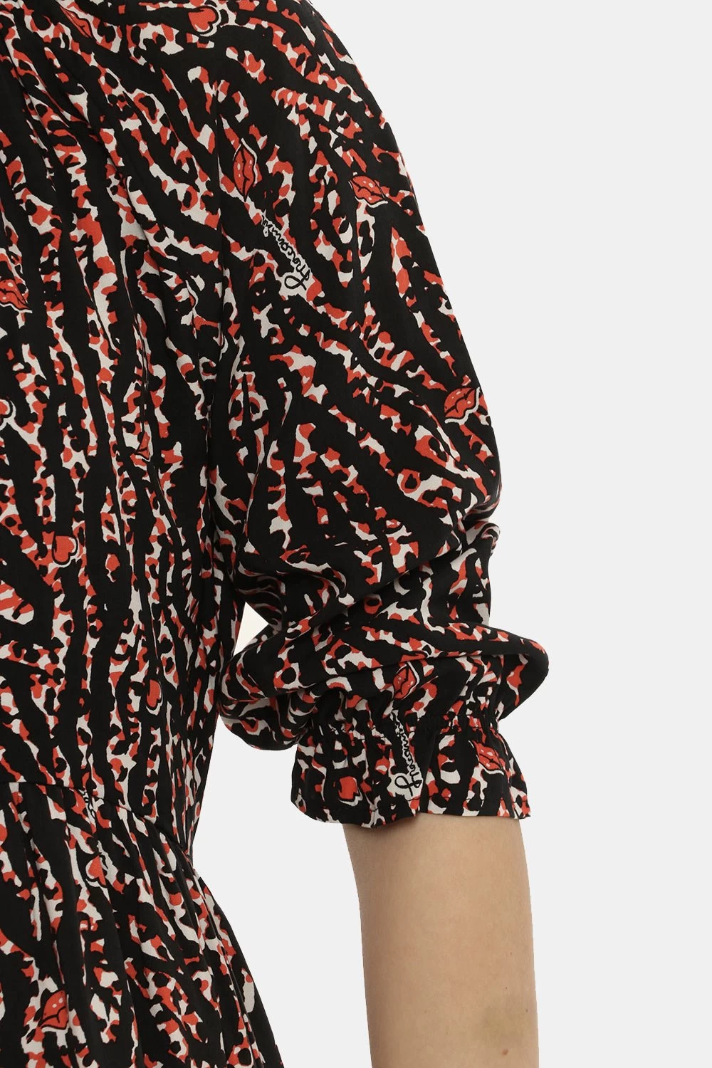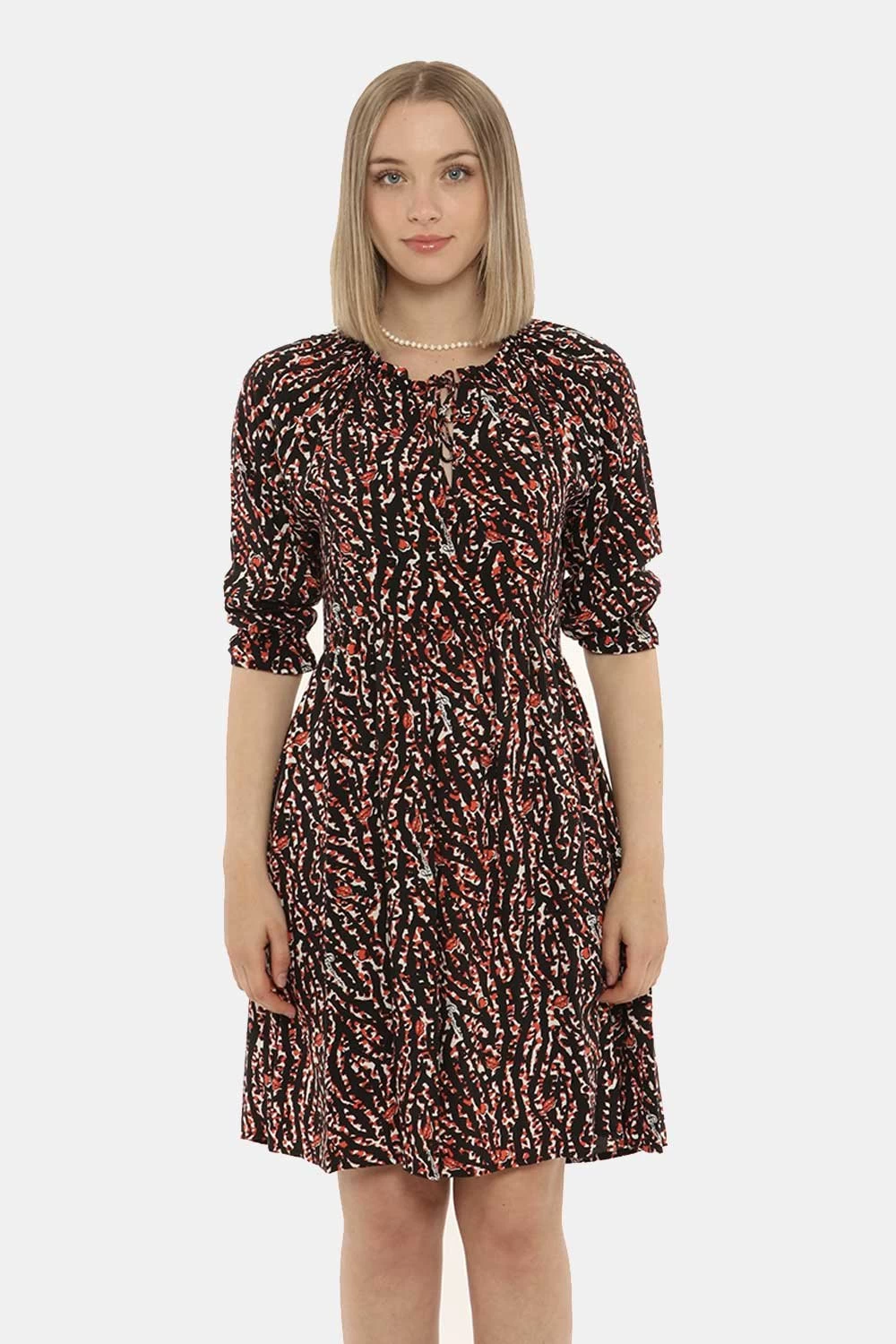 Vestito con maniche lunghe su sfondo nero con stampa allover bianca e rossa. Presente scollo a V con laccetto in tinta e frill applicato sulla bordatura. La vestibilità è morbida e regolare anche grazie ad arricciatura in girovita. L’abito è adatto per occasioni casual. Dai un tocco di freschezza e colore ai tuoi outfit.