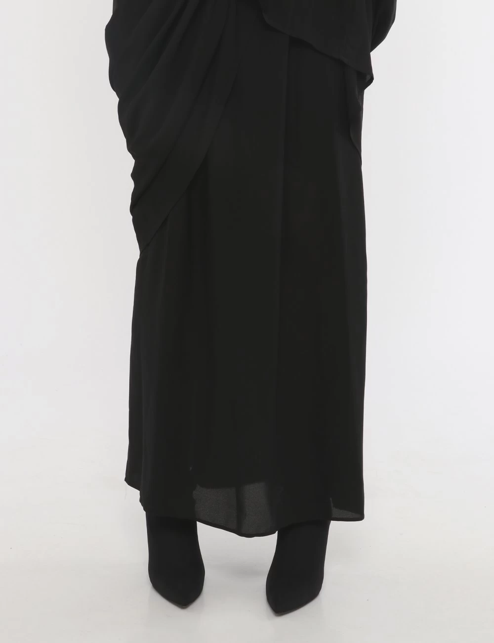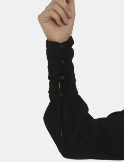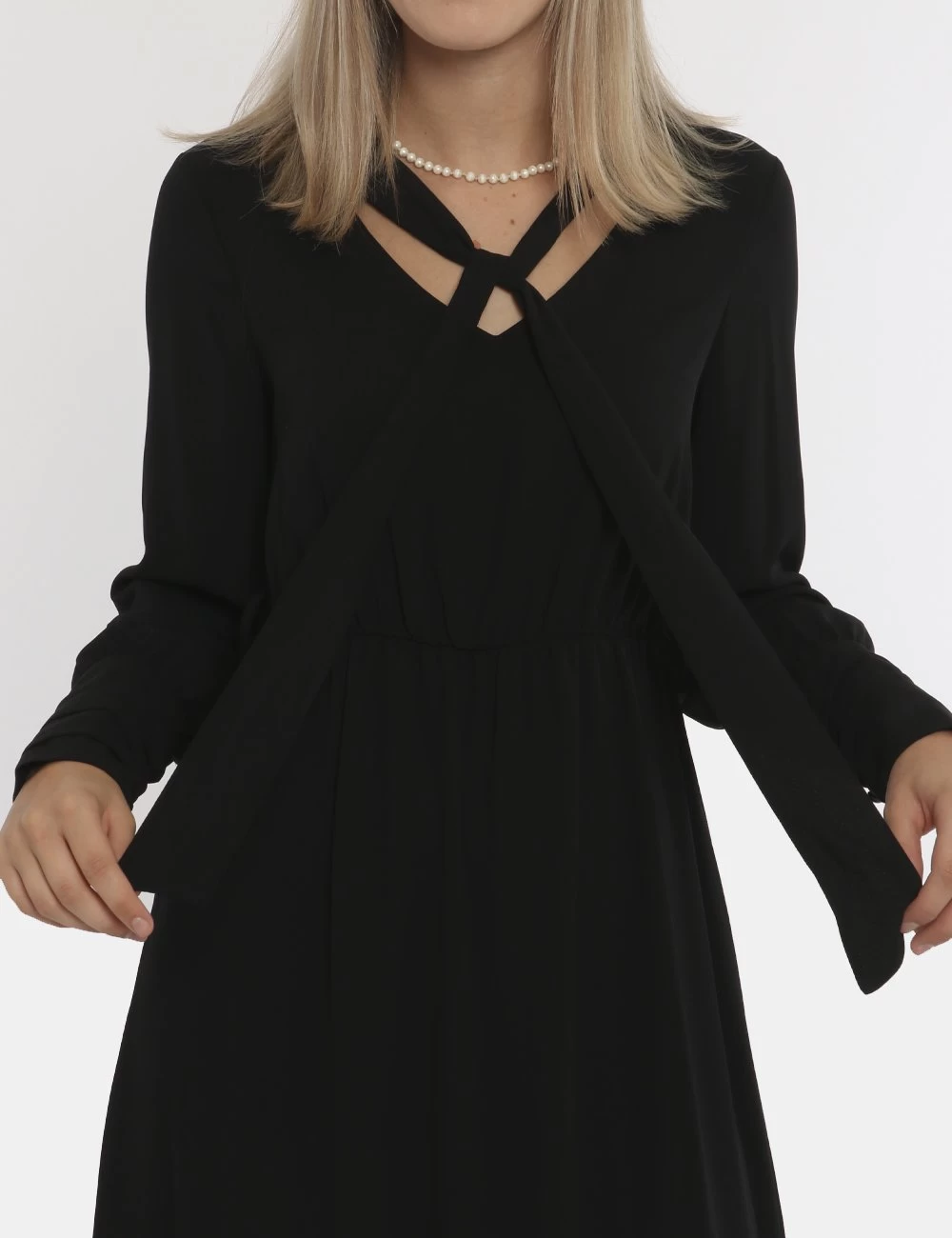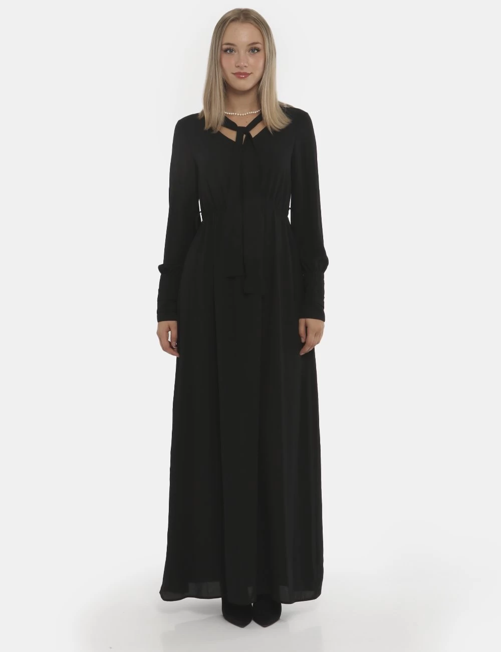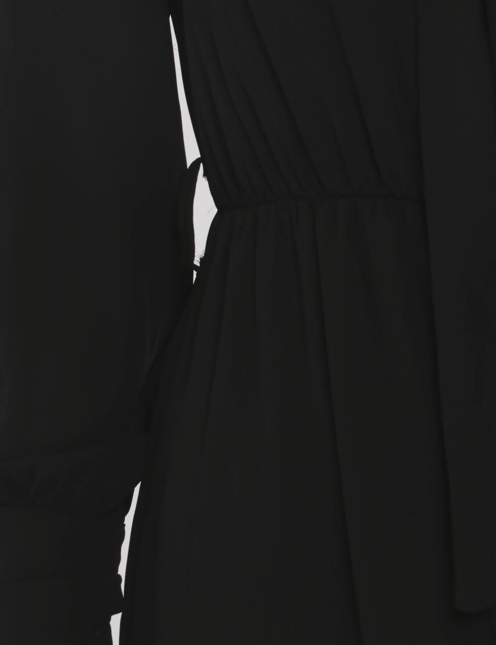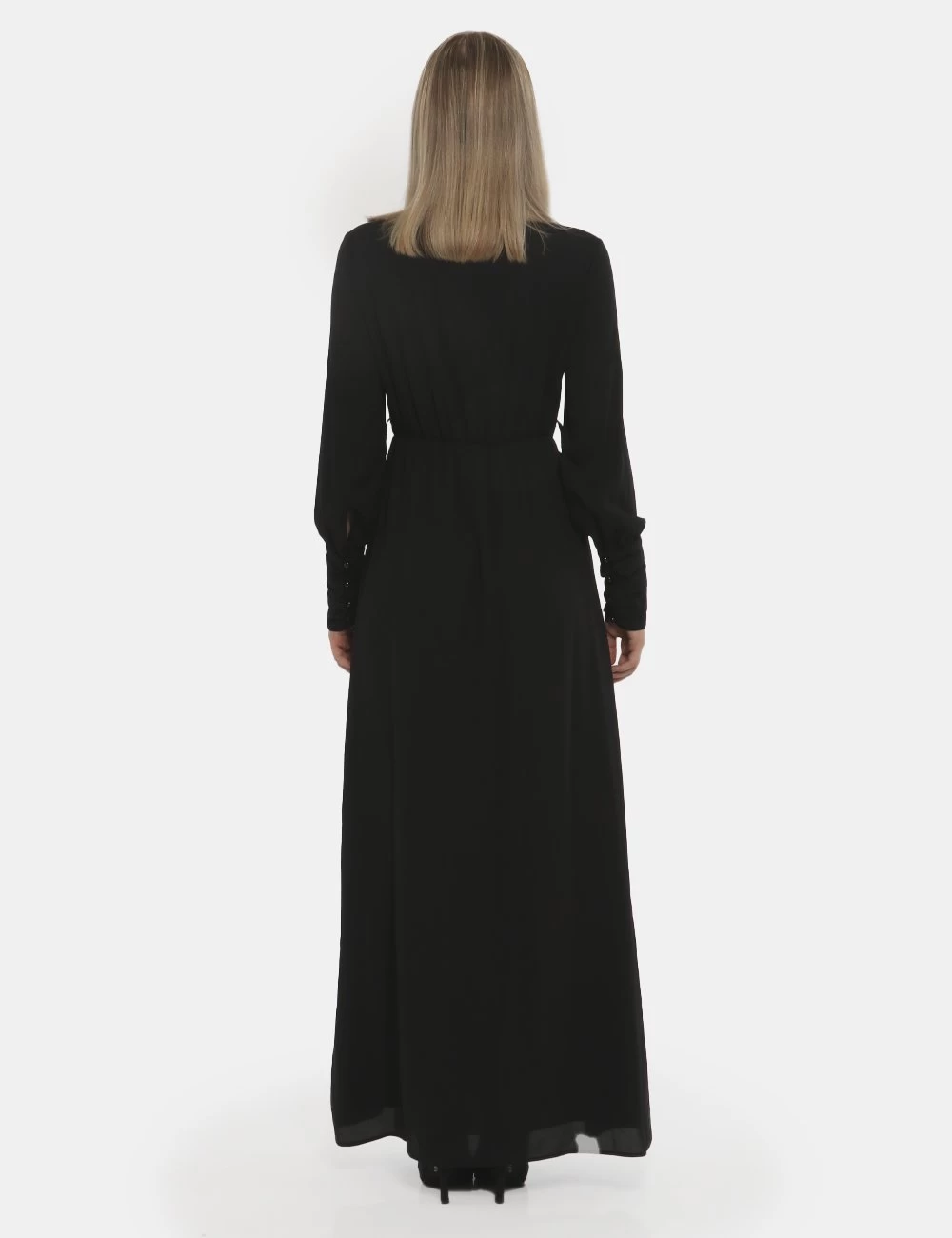 Vestito lungo a maniche lunghe arricciate sui polsini ed in total nero. Presente scollo a V con laccio in tessuto coodinato. La vestibilità è morbida e regolabile grazie ad eventuale cintura. Il vestito è adatto per occasioni casual/raffinate. Quest’abito merita un’occasione importante.