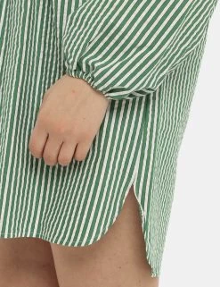 Vestito ampio a maniche lunghe su sfondo rigato verticale verde e bianco. Presente colletto classico e targhetta logo brand argentata applicata ad altezza cuore. La vestibilità è morbida e pratica grazie a bottoni ad asola in tinta sul fronte. Il vestito è adatto per occasioni casual. Se cerchi freschezza e comfort li hai trovati.
