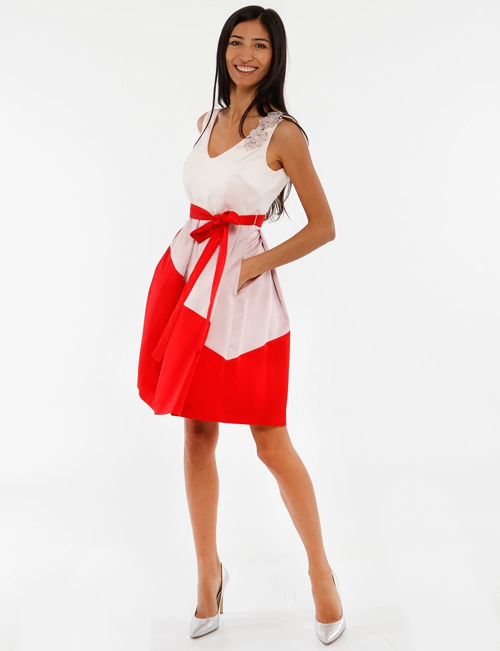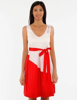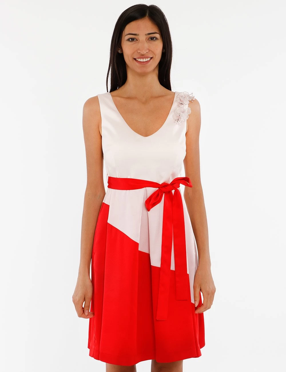 Le spille floreali rifiniscono questo abito in tre colori che crea un effetto originale che non passerà inosservato! Abbinalo a un paio di tacchi e colora le tue giornate!