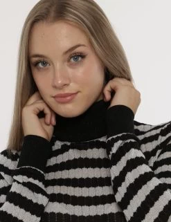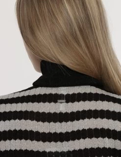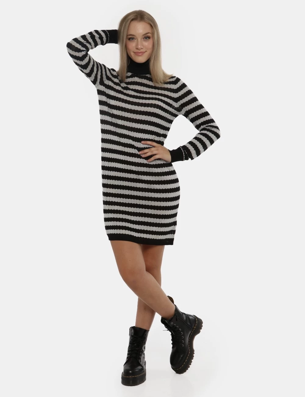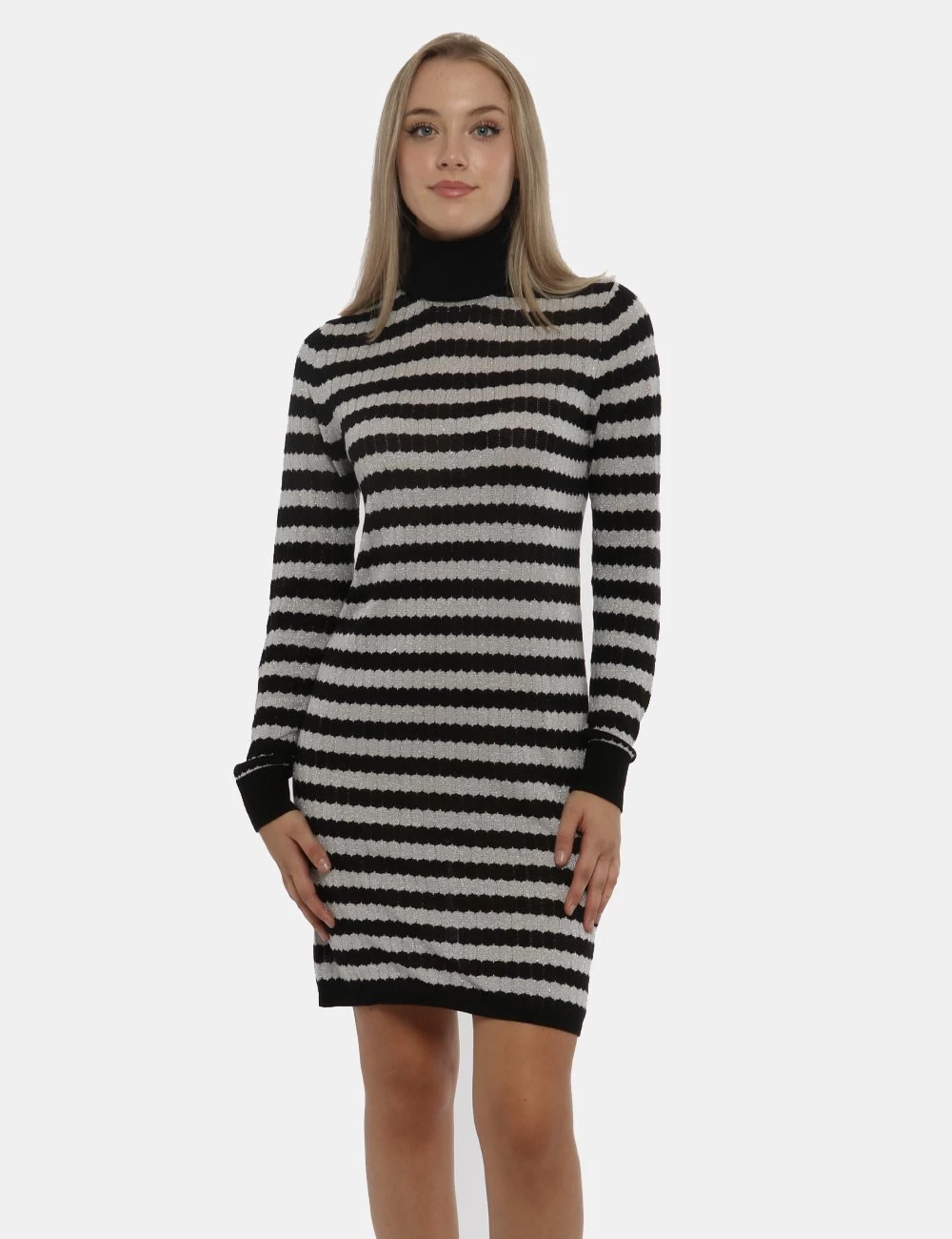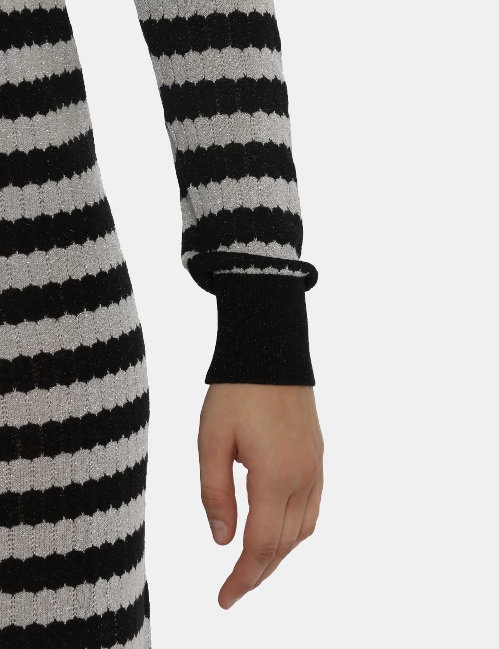 Vestito lungo in maglina a maniche lunghe con collo alto. Il capo si presenta rigato orizzontale su base nera e argentata in filo lurex. La vestibilità è morbida e regolare. Il vestito è adatto per occasioni casual/raffinate. Fashion addicted.