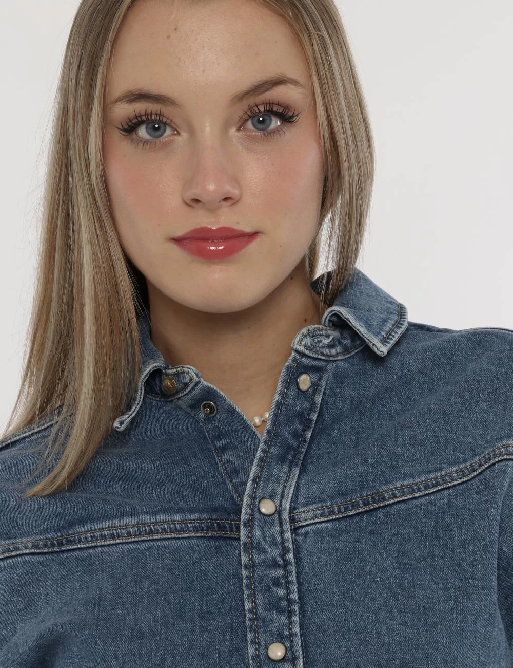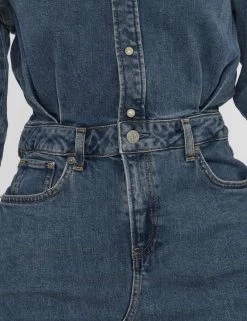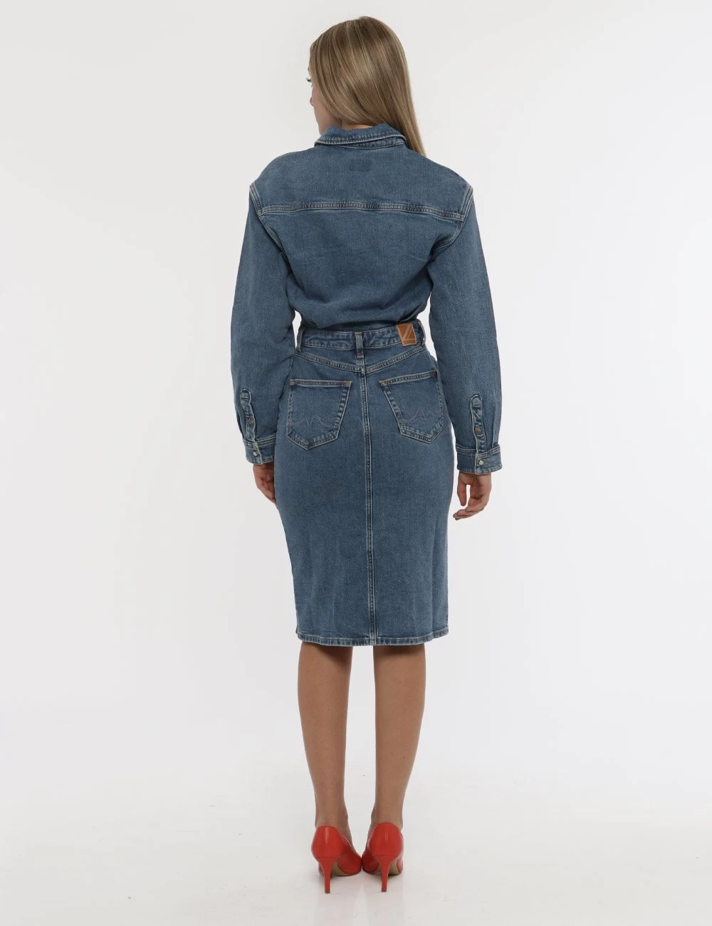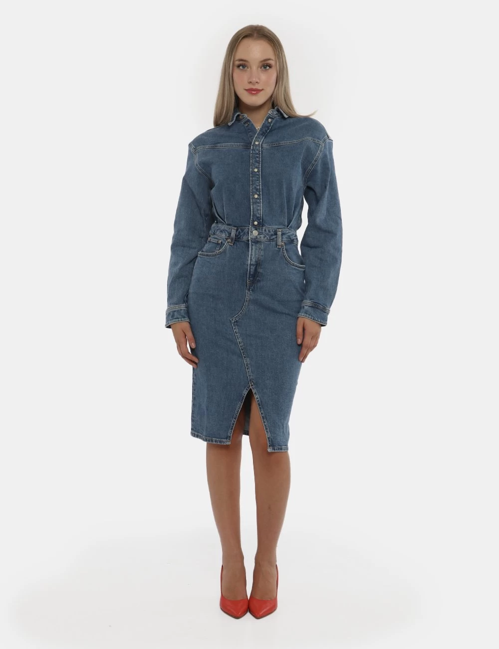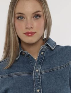Vestito in total blu denim con maniche lunghe più tasche sagomate sul fronte e tasche a toppa sul retro. La vestibilità è morbida e pratica grazie bottoni automatici sul fronte e sui polsini più bottone ad asola e zip sul girovita. Il vestito è adatto per occasioni casual e facilmente combinabile con accessori colorati. Con un capo così hai stile da vendere.