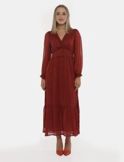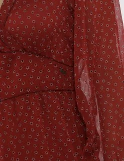 Vestito lungo con maniche lunghe in tessuto velato bordeaux con stampa allover fiorellini in tinta coordinata. Presente scollo a V e zip laterale che permette una vestibilità pratica e morbida. Il capo è adatto per occasioni casual/raffinate. Fashion addicted.