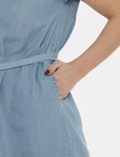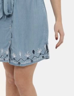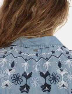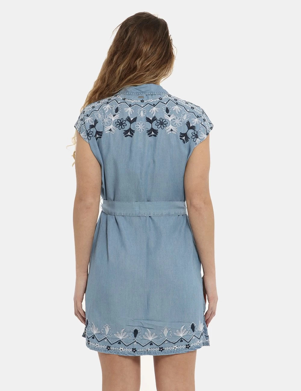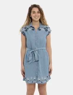 Vestito a maniche corte total denim con ricamo floreale bianco e blu ad altezza spalle e nella parte inferiore. La vestibilità è morbida e pratica grazie a bottoni automatici lungo il fronte ma anche regolabile grazie a cintura in tessuto denim. L’abito è adatto per occasioni casual. Se cerchi leggerezza e stile sai già cosa indossare.