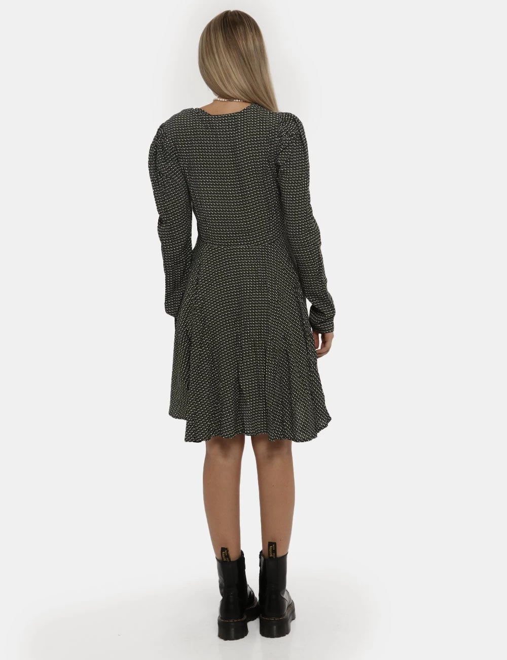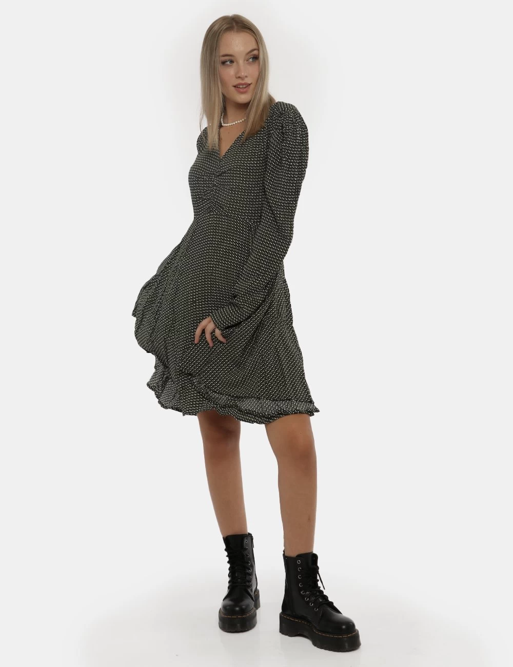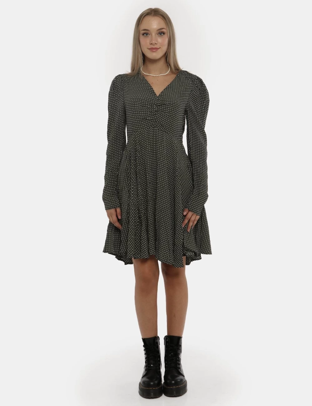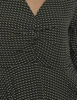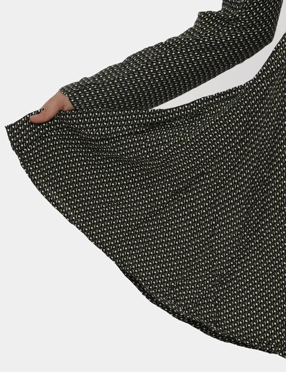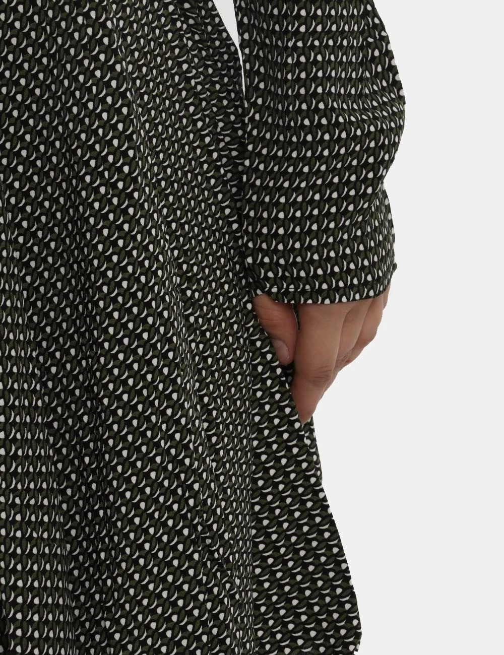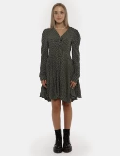Vestito a maniche lunghe morbido con gonna svasata morbida su base fantasia nera e verde. Presente scollo a V ed arricciatura sul fronte. La vestibilità è morbida e pratica grazie a zip laterale. Il vestito è adatto per occasioni casual e ideale per outfit diurni/serali. Praticità e stile in un solo capo.